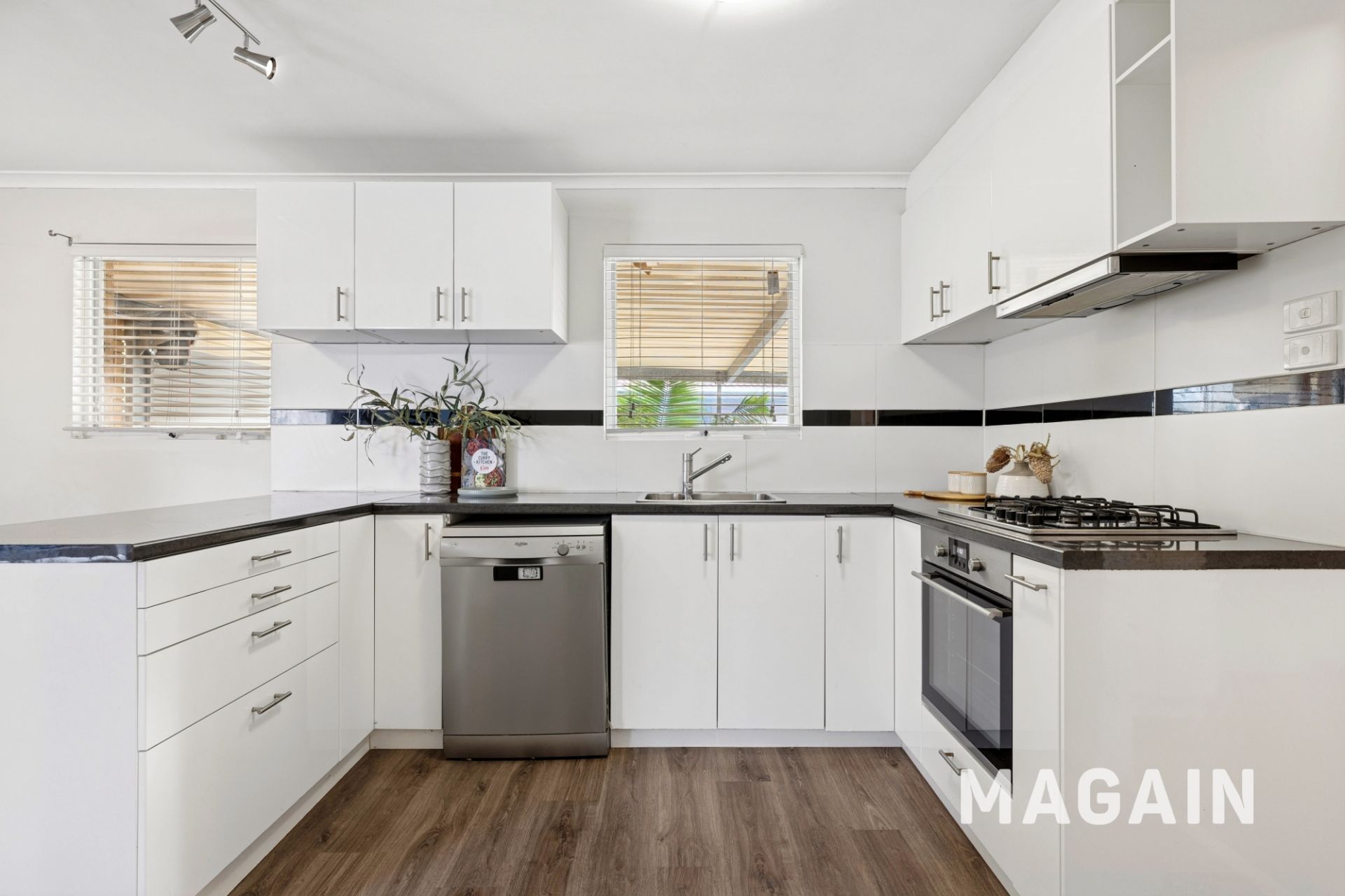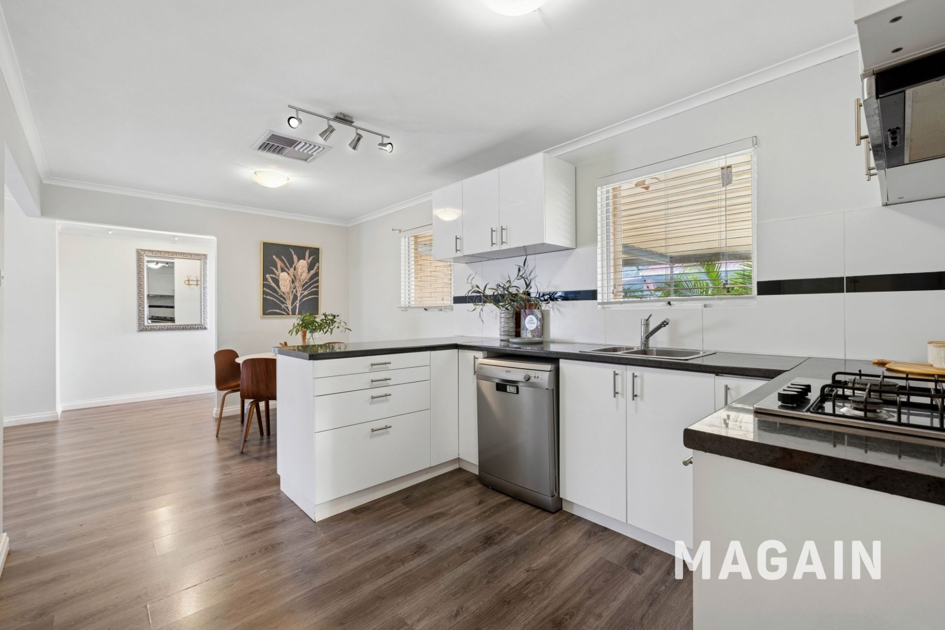 The kitchen strikes the perfect balance between modern style and everyday practicality. Sleek white cabinetry pairs beautifully with contrasting dark countertops, creating a fresh and timeless aesthetic ready for your personal flair. Designed with the home cook in mind, it features quality stainless-steel appliances, including a 4-burner gas cooktop with rangehood, oven, and dishwasher for seamless cooking and cleanup. Thoughtful additions such as ample pantry storage, a dedicated fridge recess, and a versatile breakfast bar make this space ideal for both casual dining and effortless entertaining.