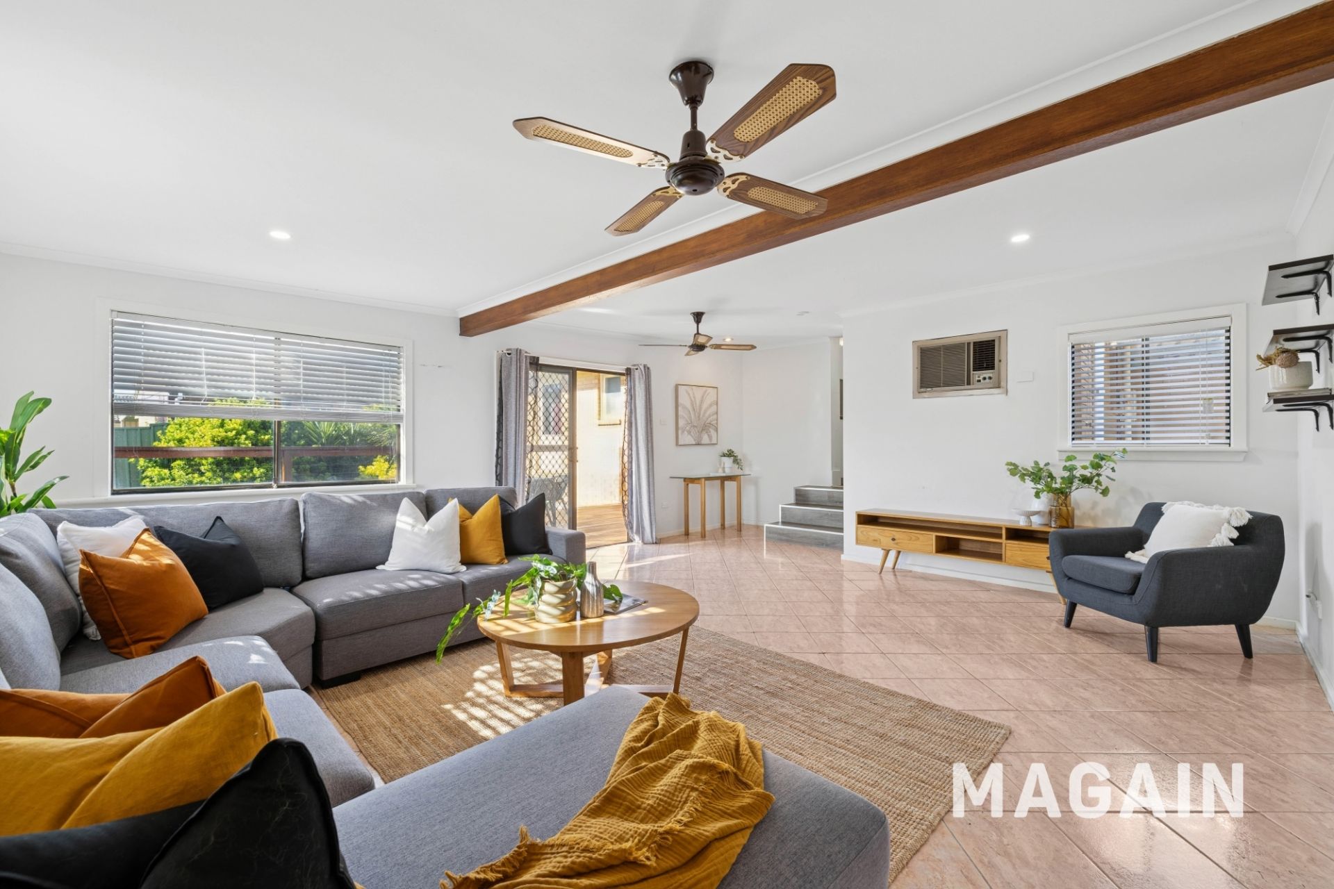 At the rear of the home, a generous extension provides a second living area that's perfect for a growing family. This flexible space can easily adapt to your needs, whether as a children's playroom, teenage retreat, games room, or home cinema. Ceiling fans and a wall-mounted air conditioner ensure comfort all year round, making it a practical and inviting addition to the home.