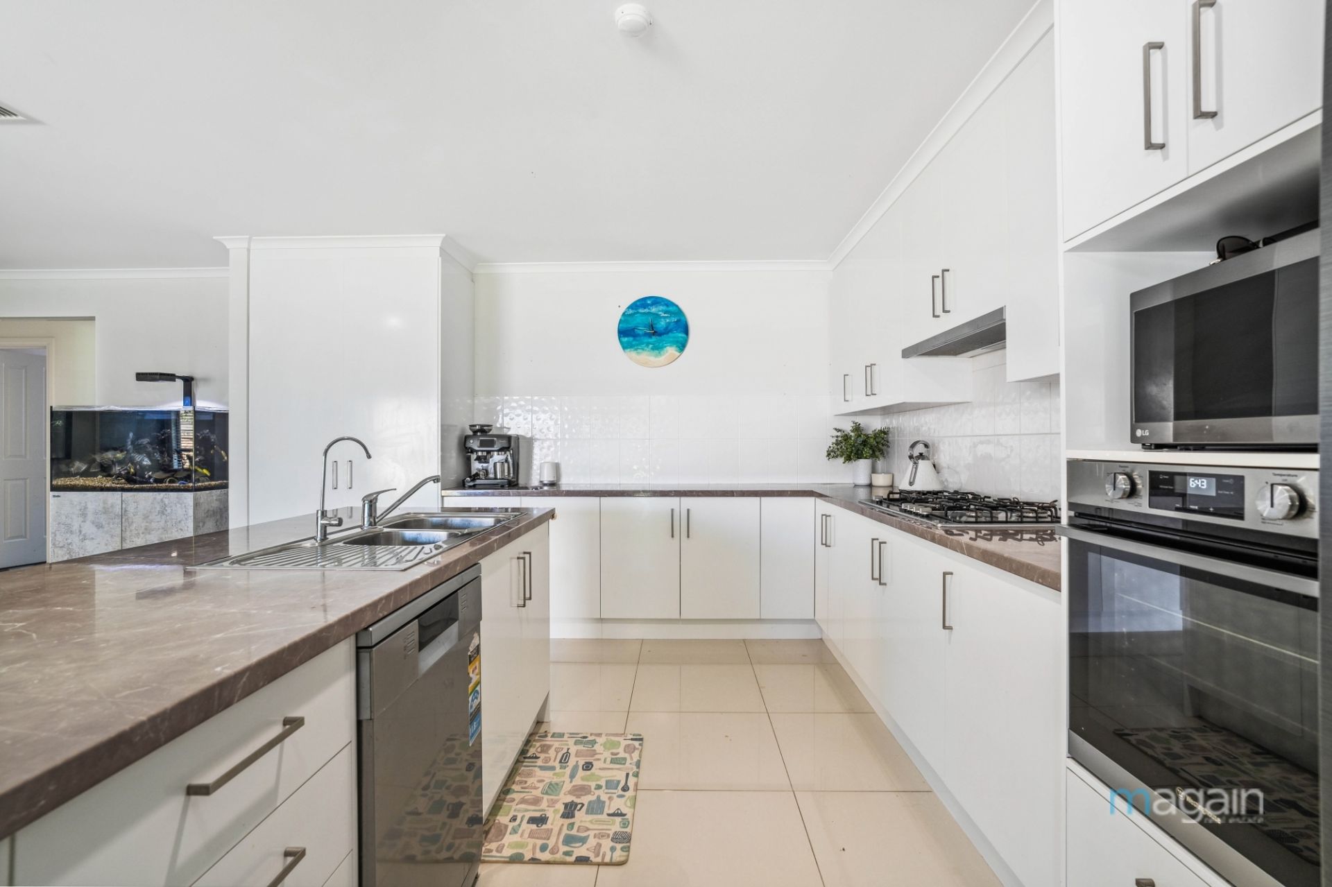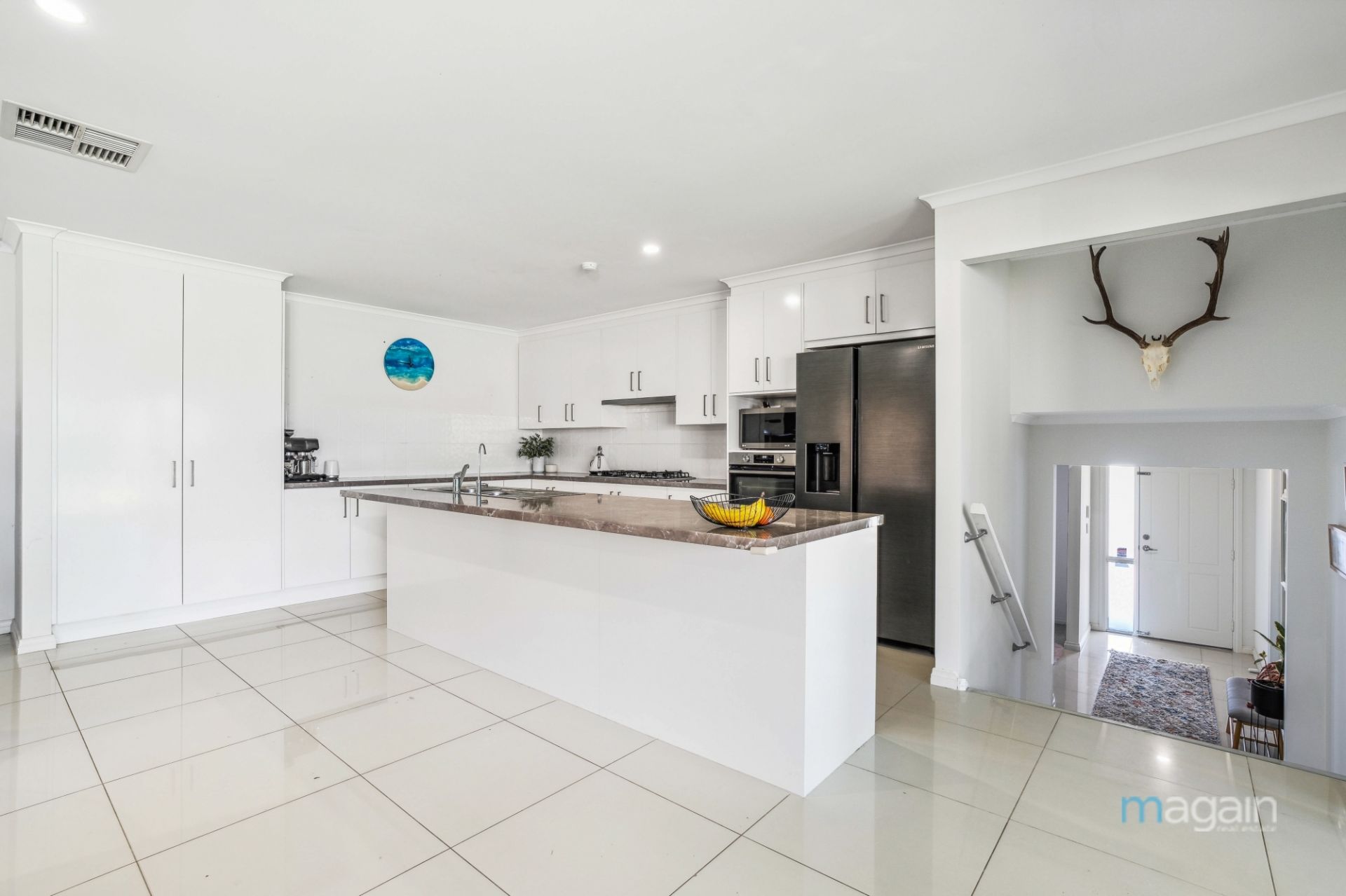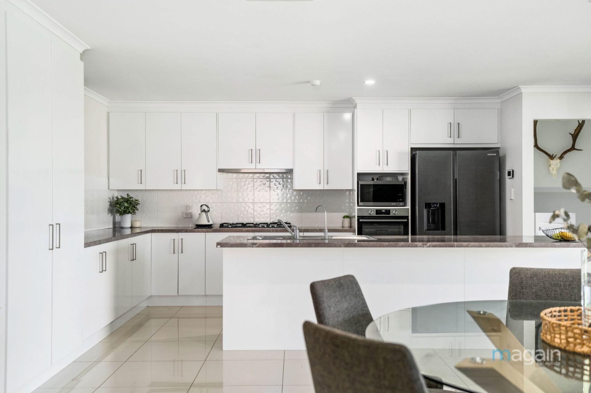 The immaculate kitchen, adorned with sleek white cabinetry and modern stainless-steel appliances, including a gas cooktop and dishwasher, features a well-positioned island bench, making an ideal focal point for entertaining family and friends.