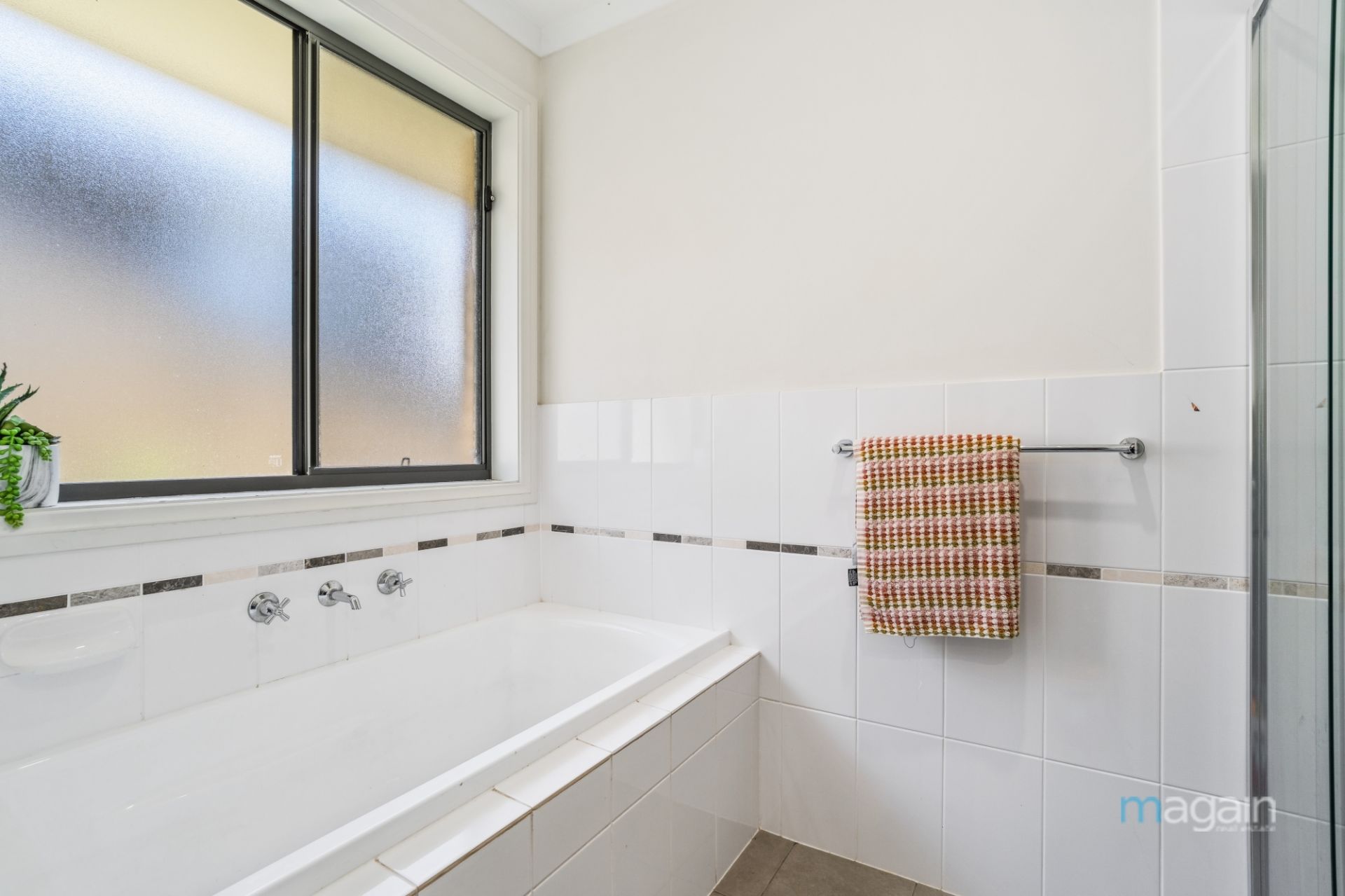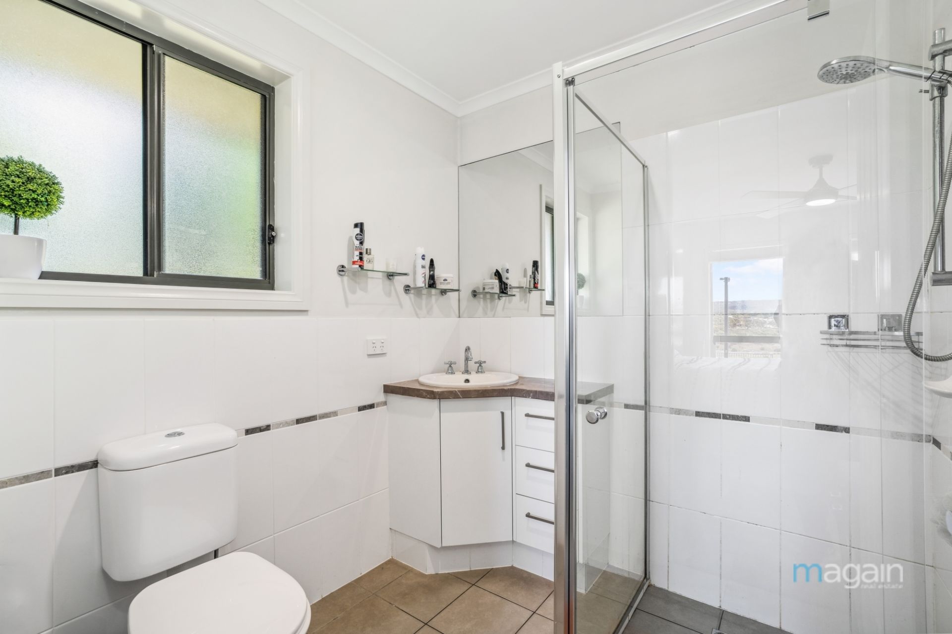 The master bedroom, positioned at the front of the home, boasts a walk-in robe, ensuite, and ceiling fan. Bedrooms two and three, both with built-in robes, are served by the neutral-toned three-way main bathroom, offering a separate toilet and vanity for guests. A built-in cupboard in this area provides valuable additional storage.