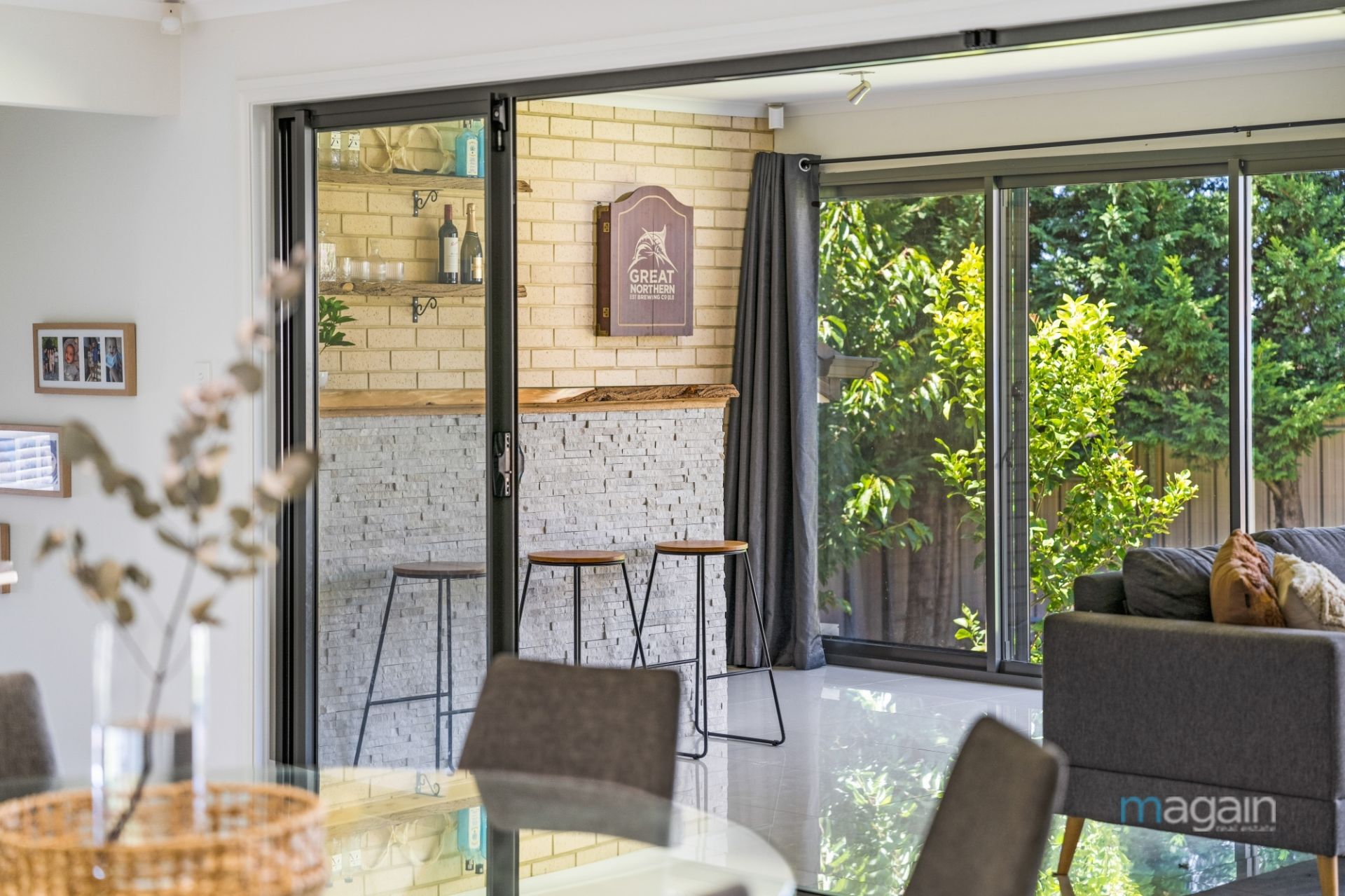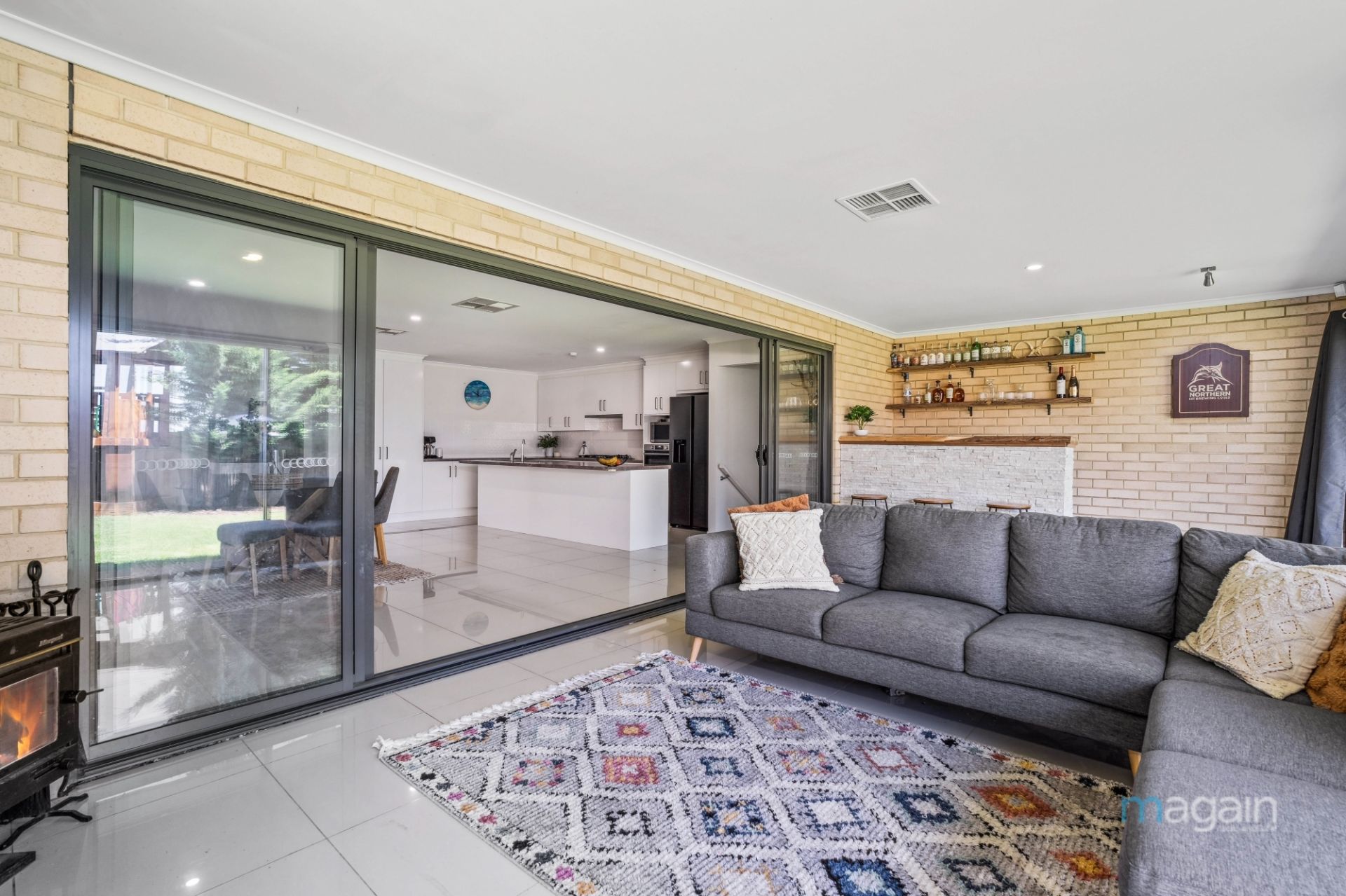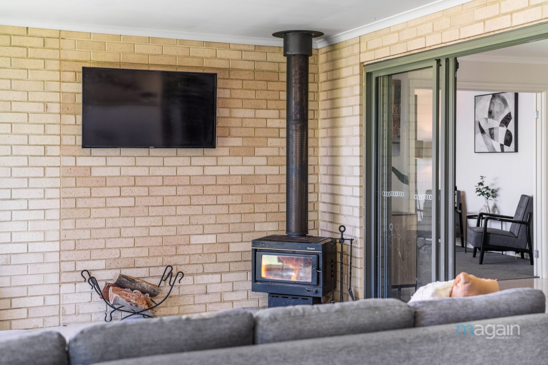 The open-plan living seamlessly extends through glass double stacker doors to an alfresco entertaining area, fully enclosed, and enhanced by a cozy combustion fireplace plus a built-in bar, making it an excellent space for year-round entertainment. The split-level rear yard offers ample space with a generously sized lawn area surrounded by established trees, providing a private haven for children and pets to play.
