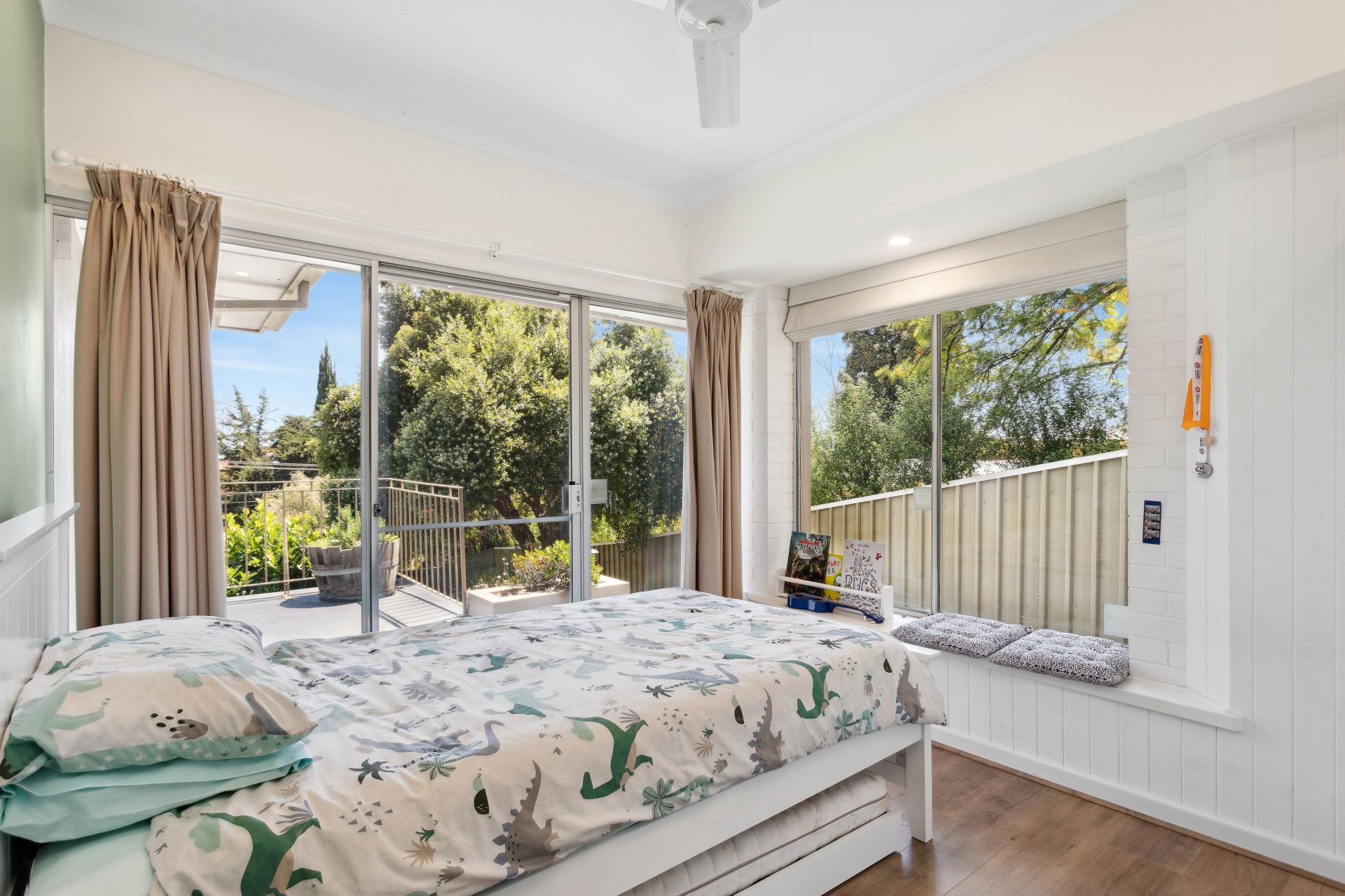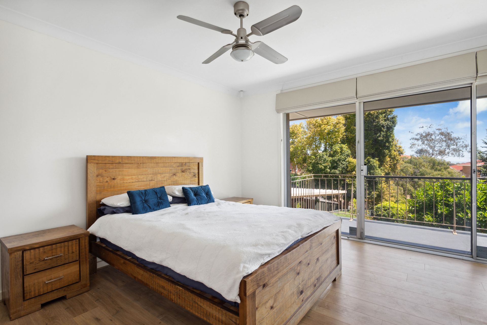 The upper level also plays host to four generously sized bedrooms, each equipped with ceiling fans. The master suite, positioned at the front, features a walk-in robe and an ensuite, providing an uninterrupted view through the expansive picture window. Bedrooms two, three, and four share access to a luxurious main bathroom with a corner bathtub and a separate toilet.