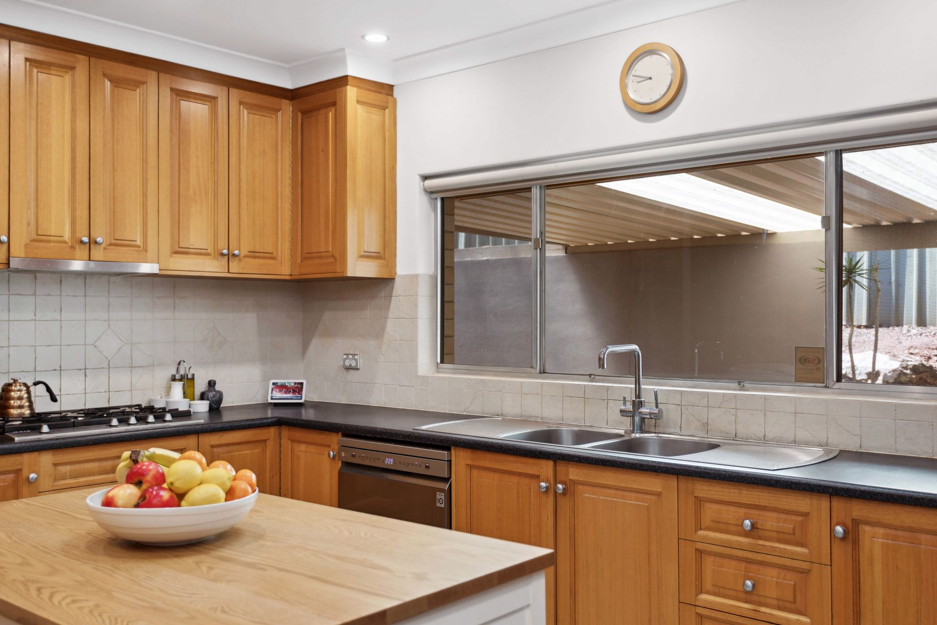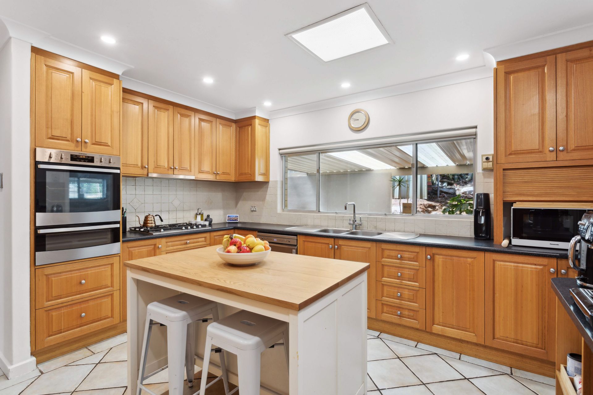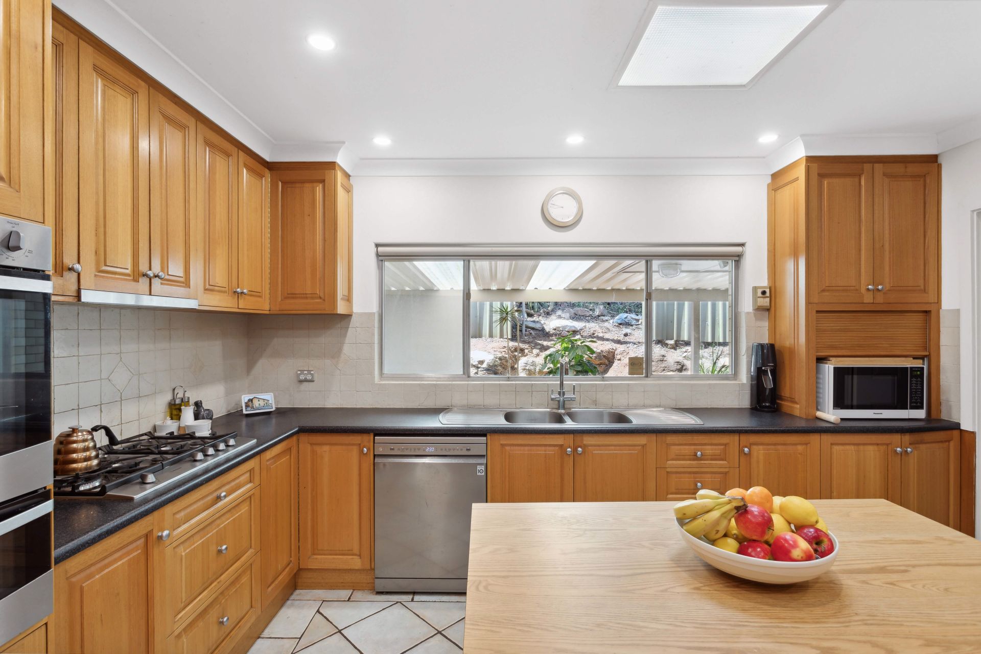 Adjacent to the living areas, you'll find a generously proportioned kitchen that effortlessly accommodates a casual dining nook. This culinary haven boasts abundant storage, quality appliances including a gas cooktop, dishwasher, and built-in oven, all bathed in natural light thanks to a skylight overhead.