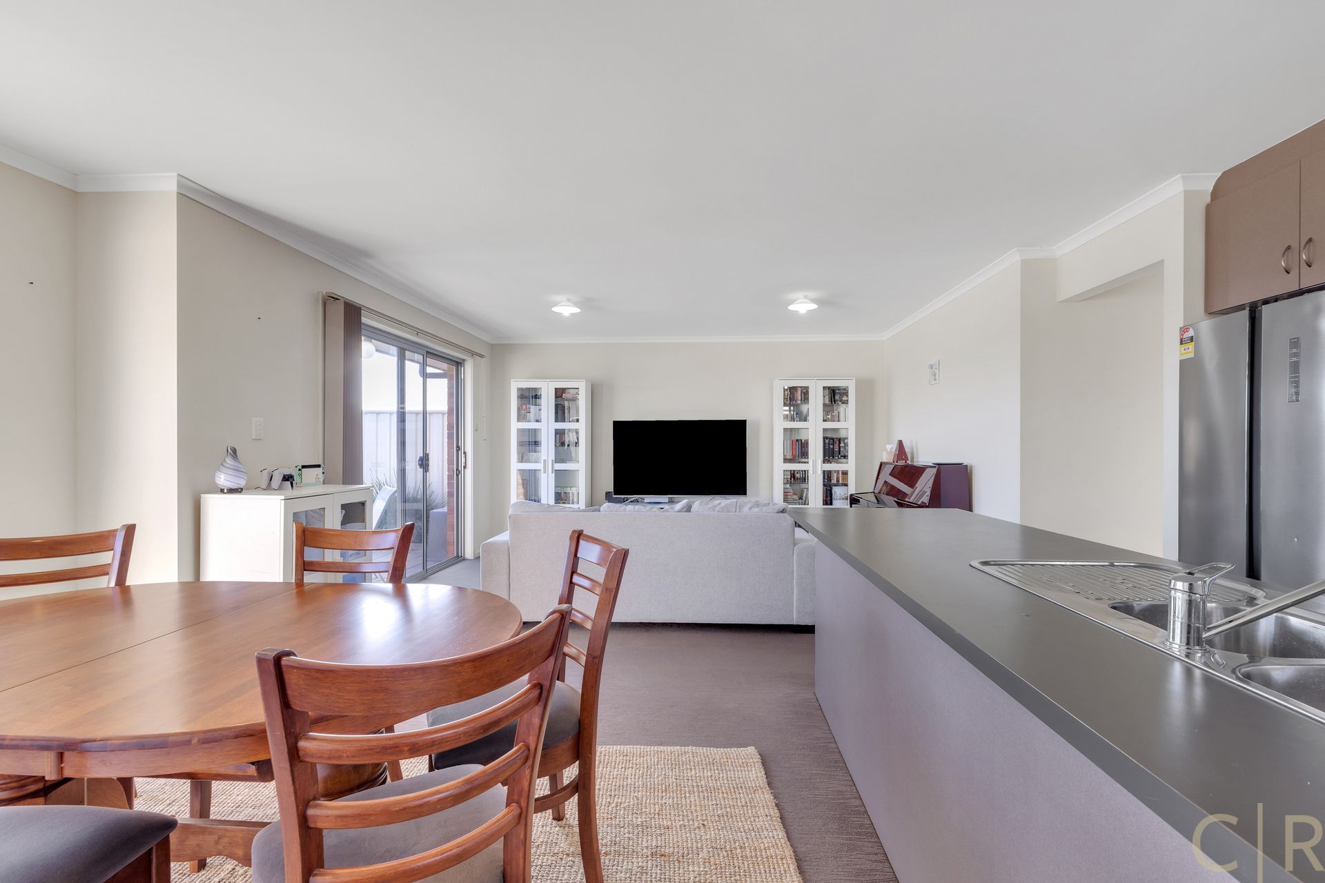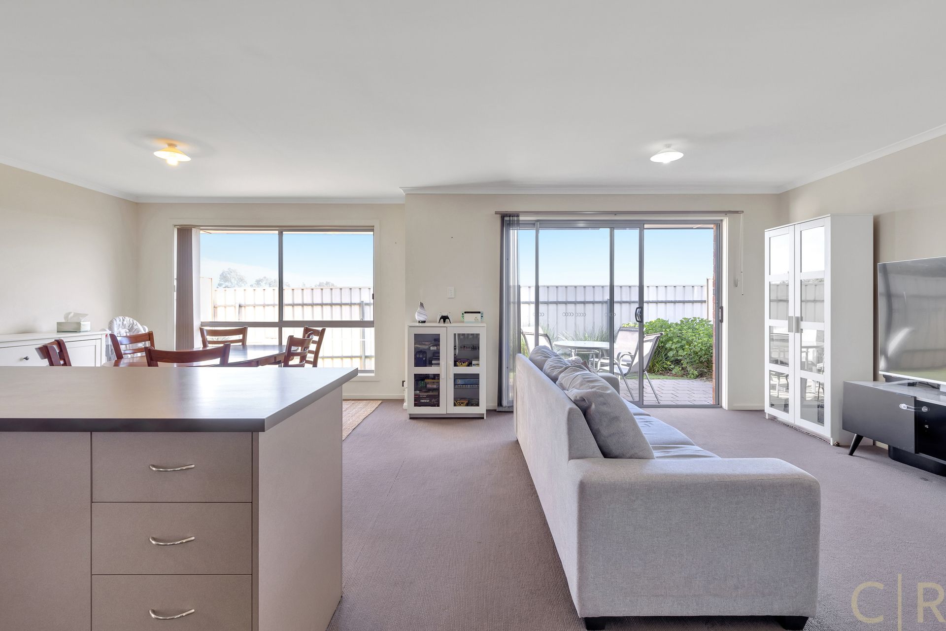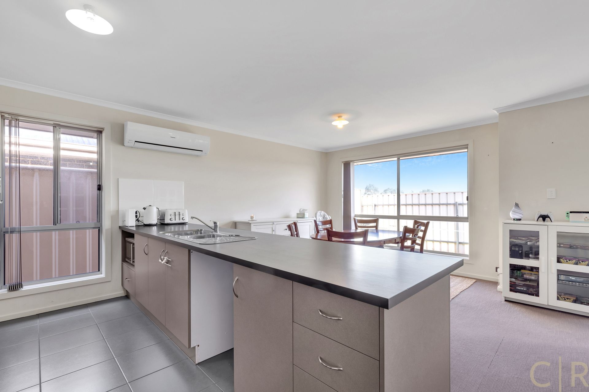 * Open plan kitchen/ living, with large windows to the backyard