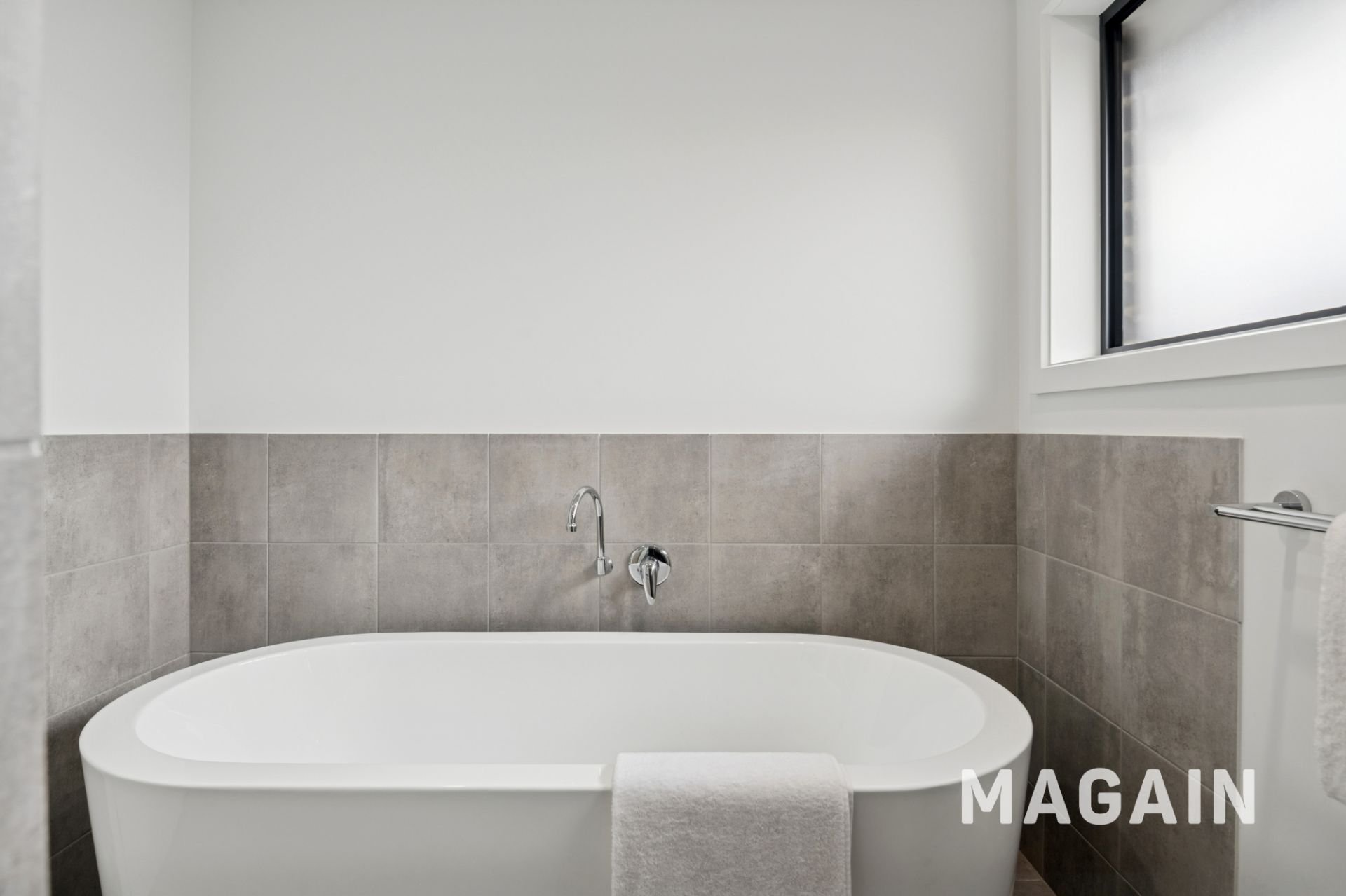 The accommodation includes three generous bedrooms, all with built-in wardrobes. The main bedroom is privately positioned and features a walk-in robe and ceiling fan. The central bathroom is a true standout, showcasing a gorgeous freestanding bath that creates a luxurious, spa-like feel.