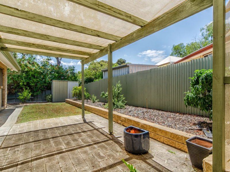 > private rear yard with a large shaded pergola, tool shed