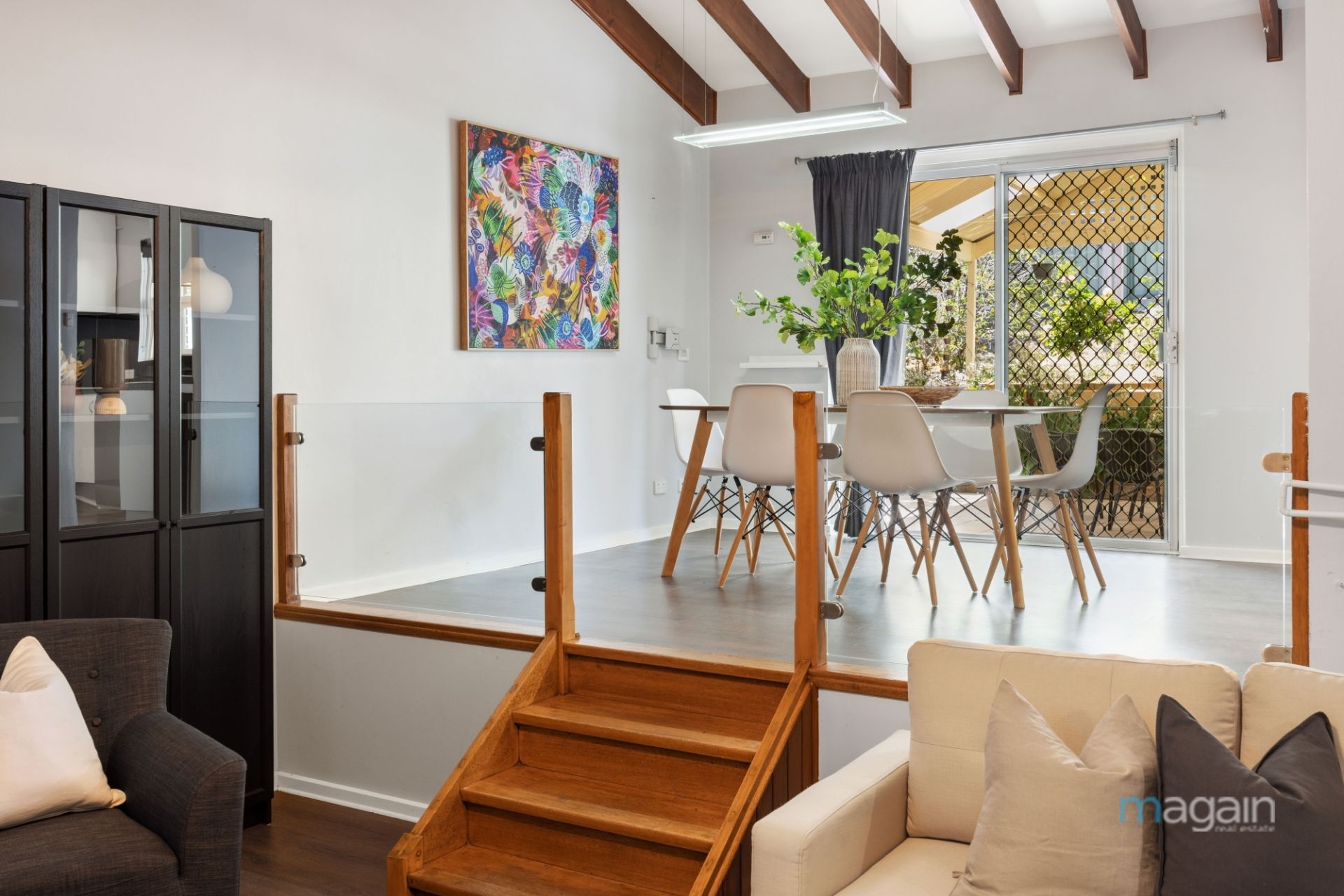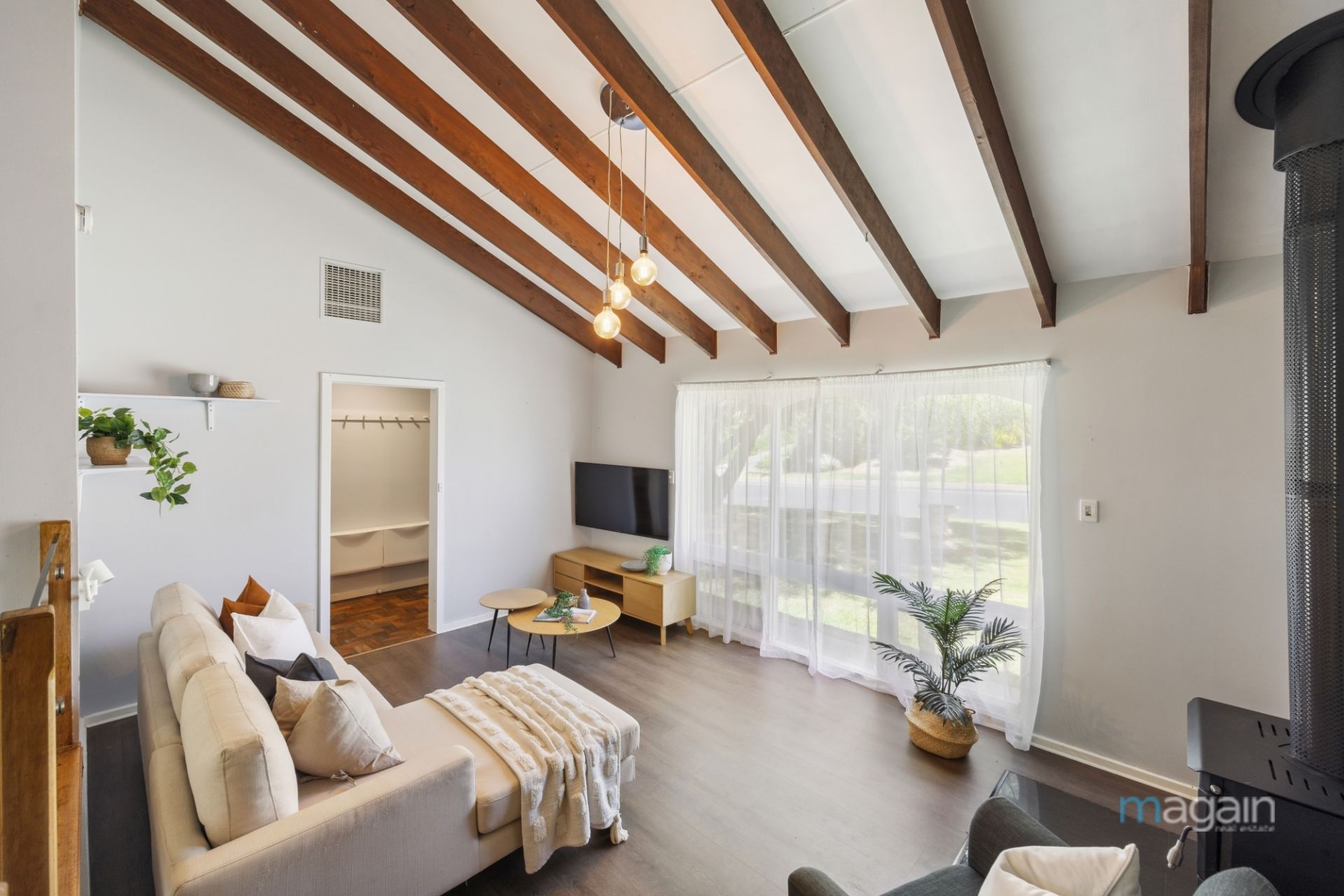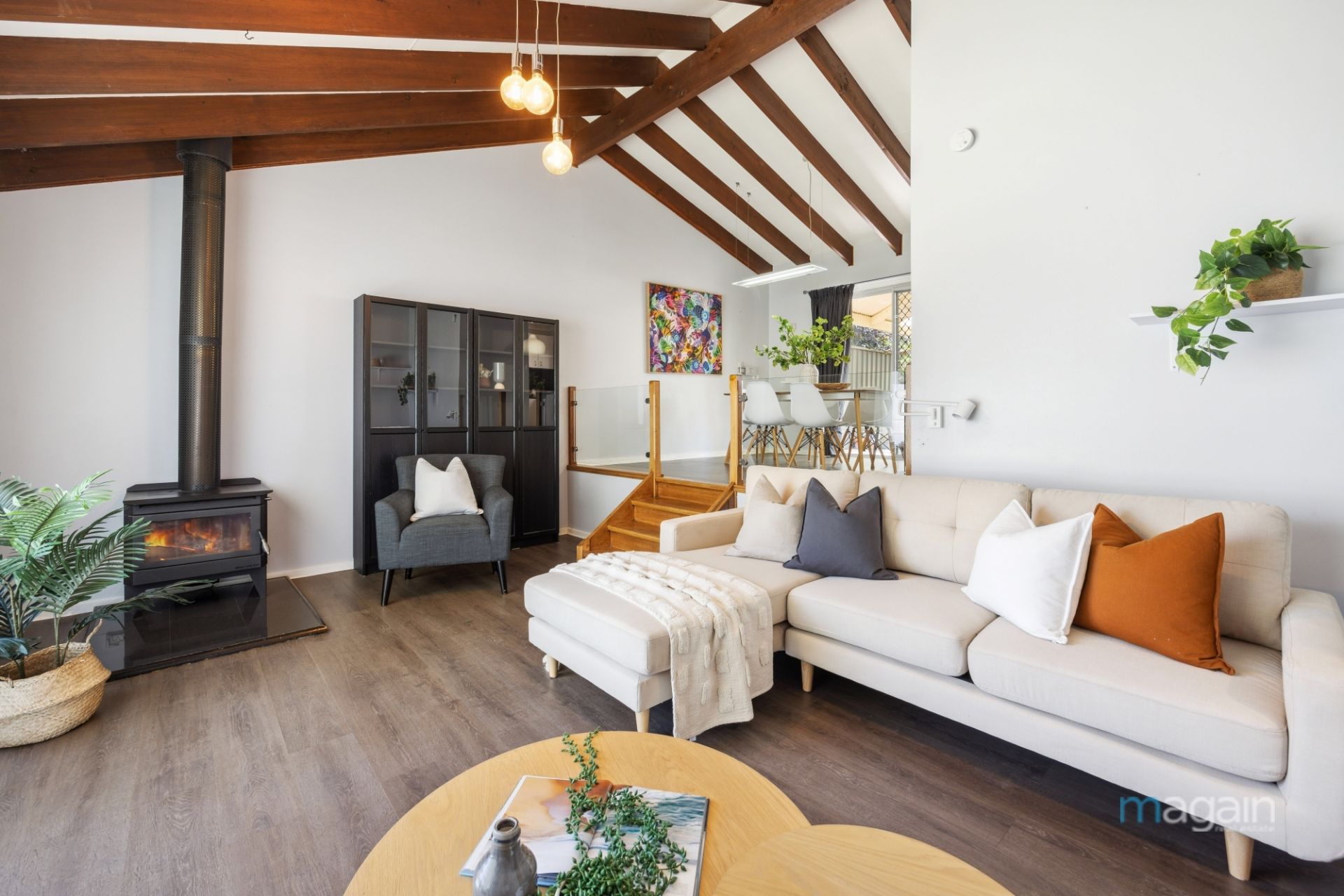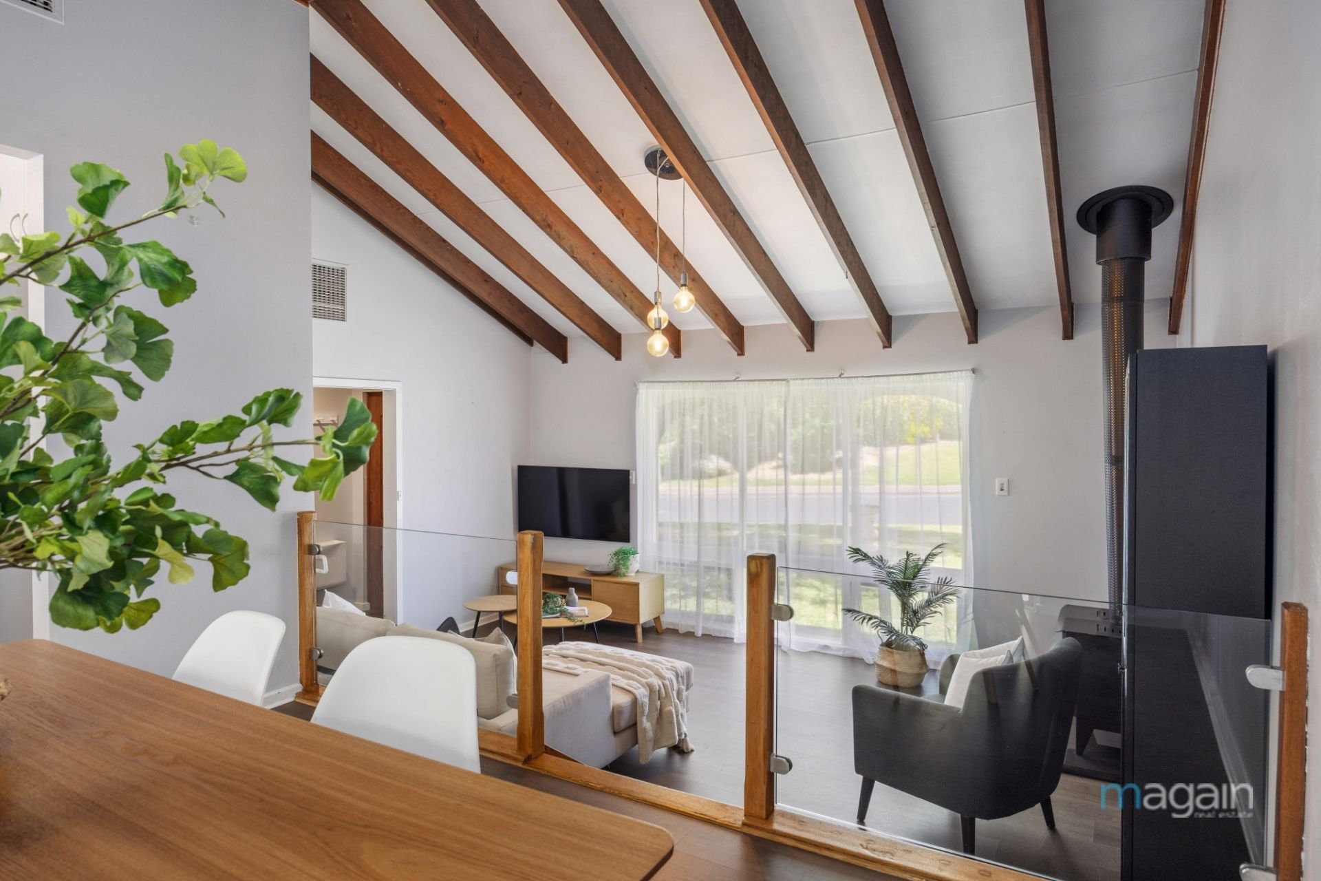 Upon entry, you're welcomed by a spacious sunken living room with cozy fireplace, flowing seamlessly up a split level into the well-appointed kitchen overlooking the dining area. Modern timber flooring, raked ceilings, a neutral palette, and large picture windows create a sense of luxury and sought-after open-plan living with abundant natural light.