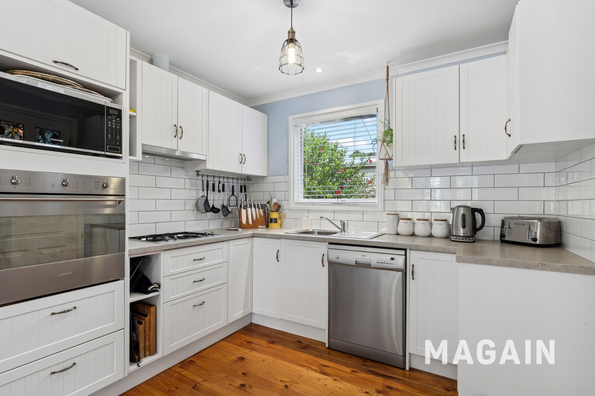 The kitchen showcases a fresh, contemporary aesthetic, complete with abundant white cabinetry, neutral benchtops and a stylish tiled splashback. Well-equipped with quality stainless-steel appliances, including a four-burner gas cooktop with rangehood, oven and dishwasher, it delivers both functionality and flair, making everyday cooking and clean-up a breeze.