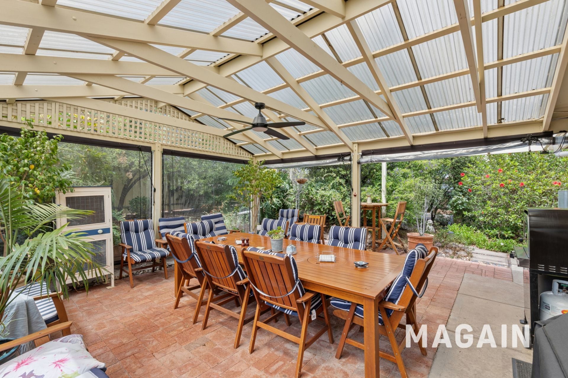 Beyond the inviting interior, the outdoor spaces offer even more to admire. The front of the home is neat and beautifully maintained, with established trees and shrubs adding colour, charm, and a welcome sense of privacy. A deck stretches across the frontage, creating the perfect spot to relax with your morning coffee in the sunshine. At the rear, two separate verandas extend from the main living area, delivering seamless indoor-outdoor flow and an ideal setting for year-round entertaining. The larger pergola features café blinds, allowing the space to be sealed in when desired, providing comfort and versatility in any weather. Keen gardeners will also appreciate the flourishing backyard, brimming with a variety of established trees, plants, and shrubs.