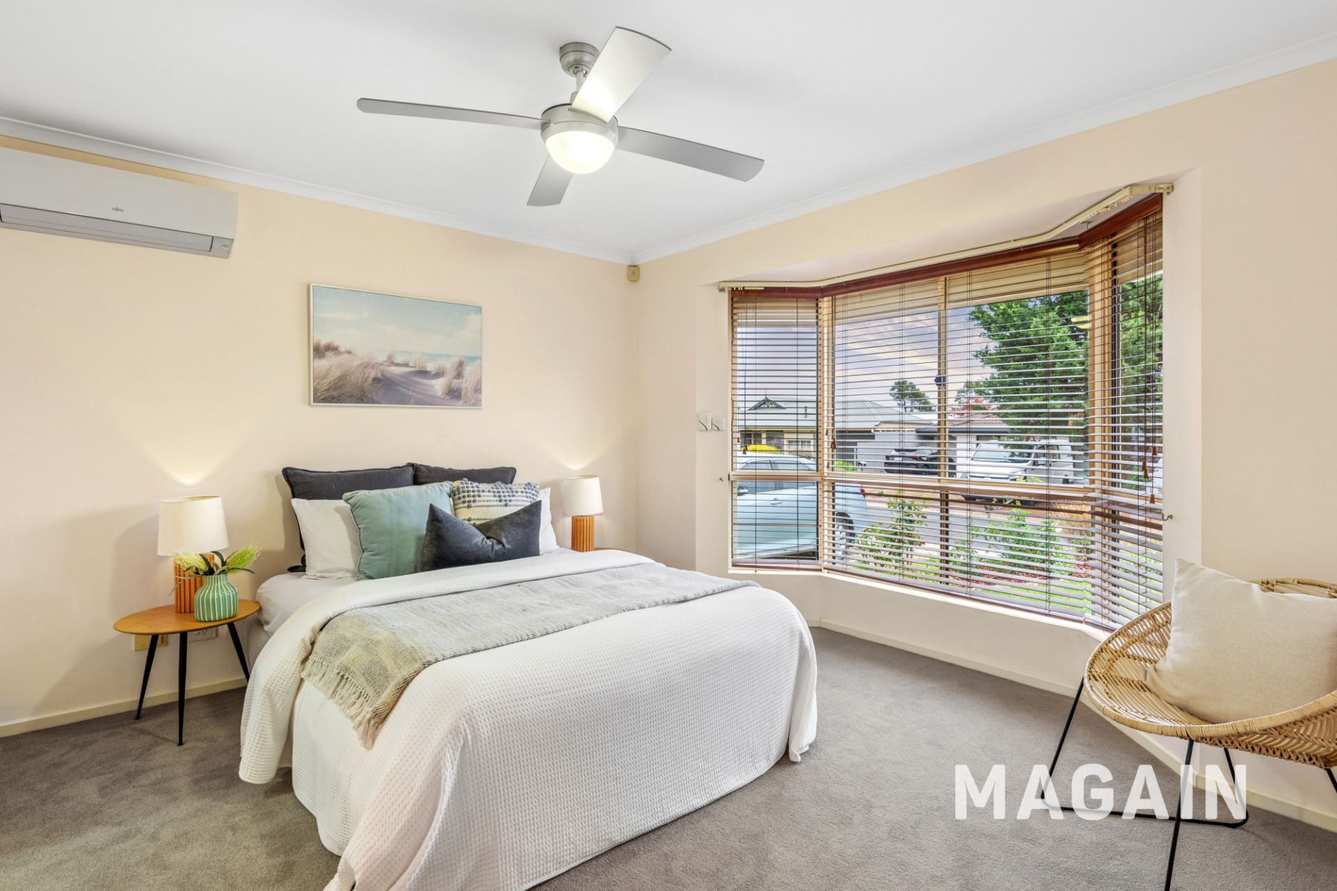 Beyond the attractive two-tier front garden, the home welcomes you with an entry foyer featuring fresh carpets and a large formal lounge with courtyard views and enhanced by a wall-mounted split system. The generous main suite is positioned for privacy and includes a bay window with shutters, ceiling fan, split-system air conditioning, walk-in robe and ensuite. Two additional bedrooms are well appointed with ceiling fans, with the third bedroom or home office also offering its own split system.