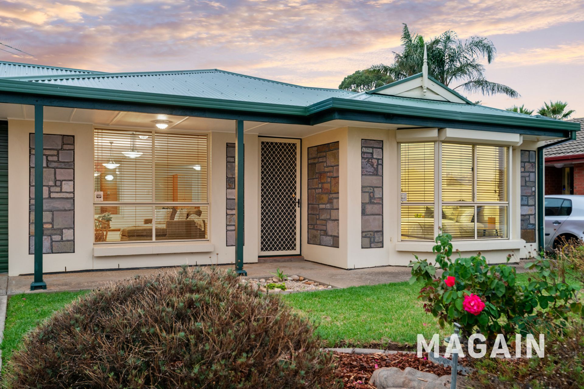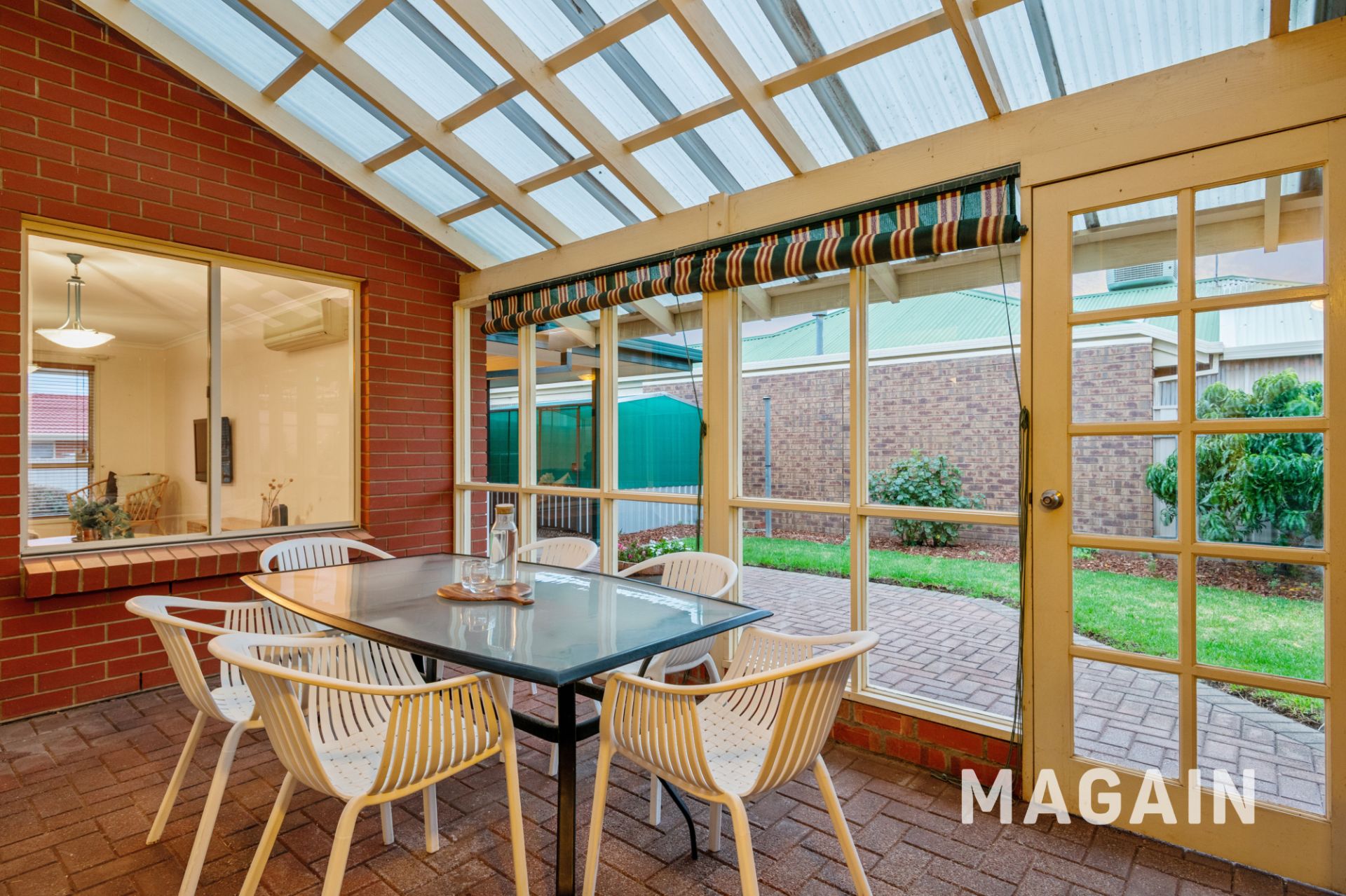 Step outside to discover an enclosed entertaining area off the kitchen, opening to a side and rear lawn, complemented by a paved patio and easy-care gardens that frame the yard beautifully. Additional features include a generous laundry with rear access, single driveway with auto roller door to the carport and rear access, rainwater tank, garden shed, courtyard, and an enclosed greenhouse with tranquil garden and fountain views from the lounge.