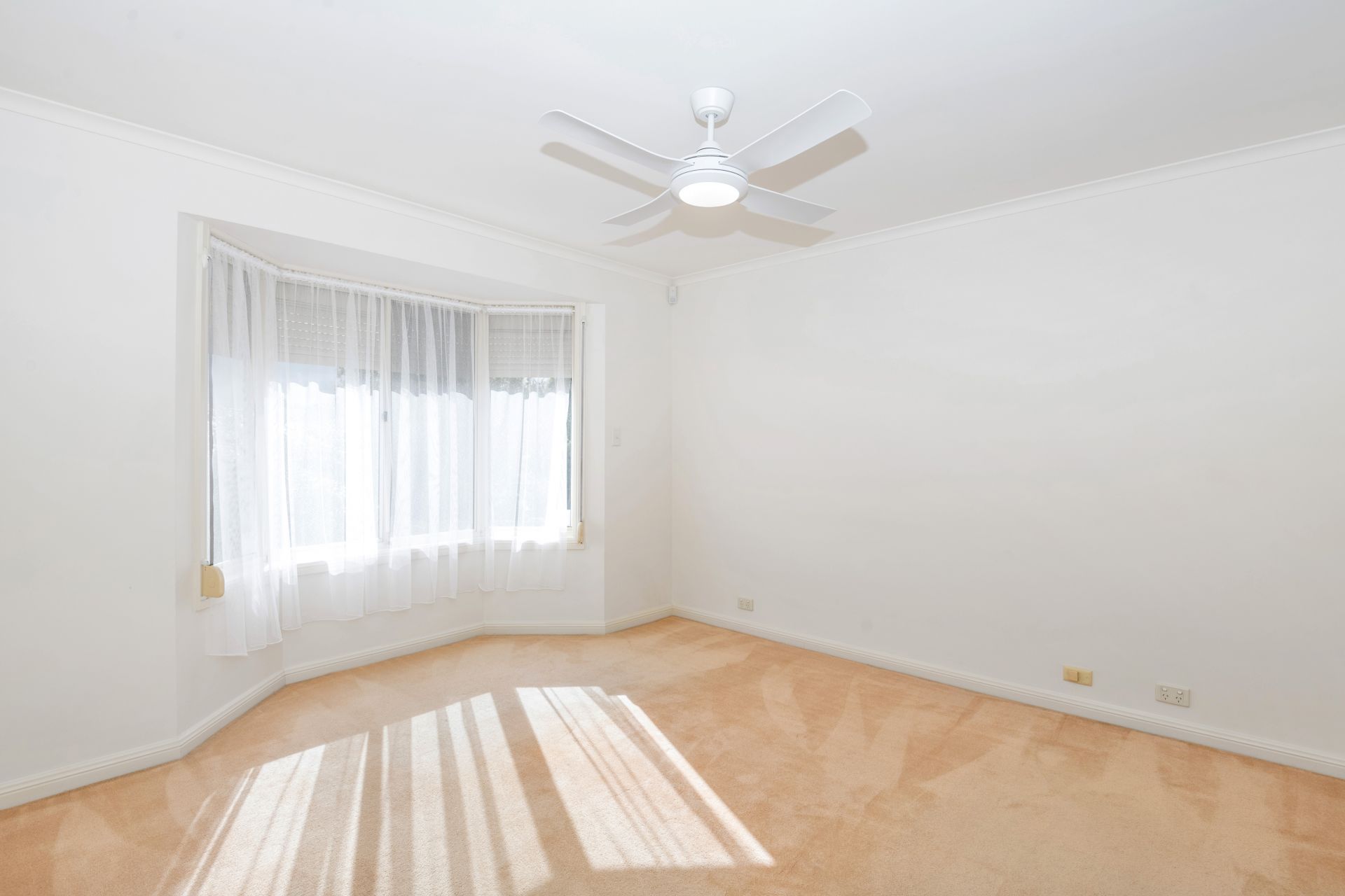 > spacious master bedroom with walk in robe and ceiling fan
