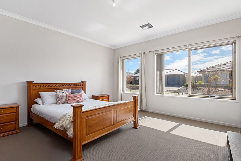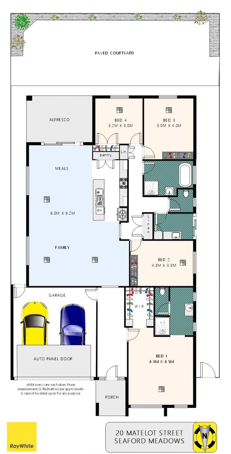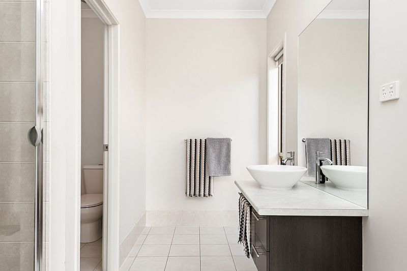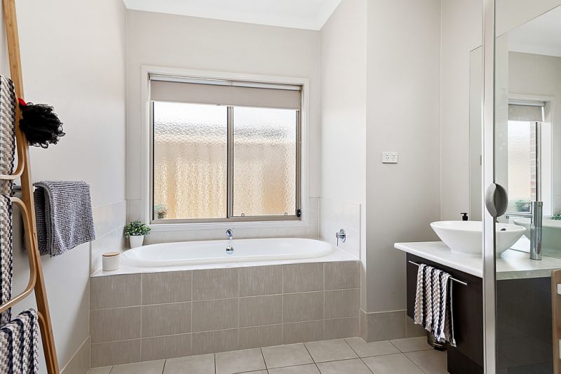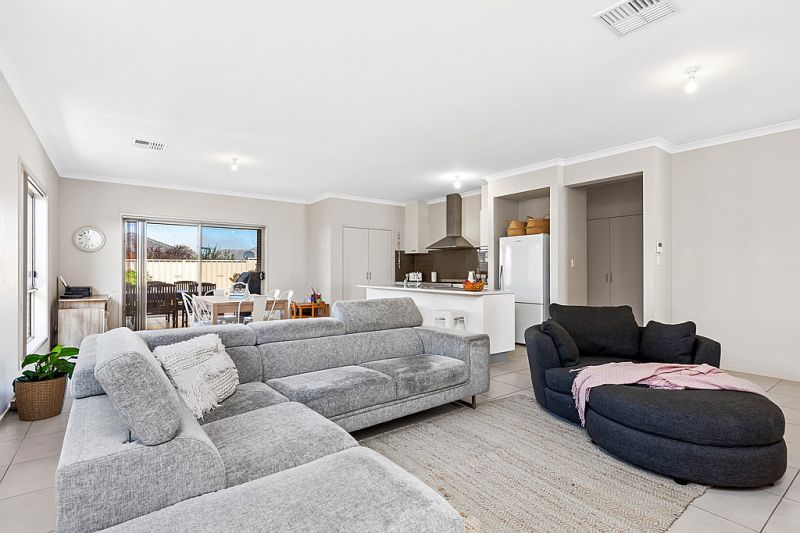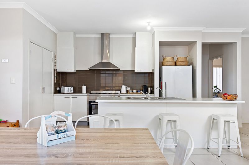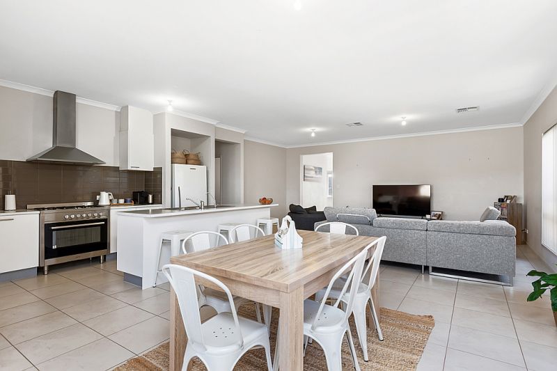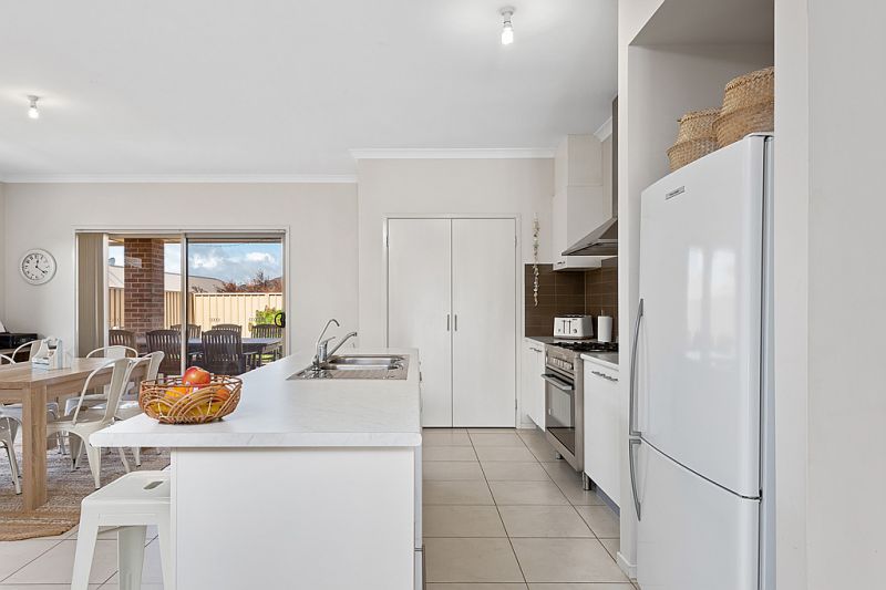 As you enter the home you are sure to fall in love with the large, tiled entrance hall, the modern neutral d?cor and the large windows provide plenty of natural light throughout. There are four good sized bedrooms, the large master is located at the front of the home and has a generous sized walk-in robe and a light filled ensuite bathroom, while bedrooms two, three and four are all a great size and feature built-in robes. A functional main bathroom with separate toilet, bath, shower and vanity sits conveniently between the family bedrooms, while the nearby linen press ensures plenty of storage is available. You'll be blown away by the size of the huge open plan kitchen, meals and living area, with easy care tiled floors, it flows seamlessly to the outdoor entertaining area. The modern kitchen will make family meals or group entertaining a pleasure, offering a stainless steel 900mm freestanding oven & rangehood, dishwasher, a large pantry and an island bench with a sitting area. Additional features include ducted reverse cycle air conditioning for year-round comfort, 9-foot ceilings throughout, carpet in all bedrooms and plentiful storage.