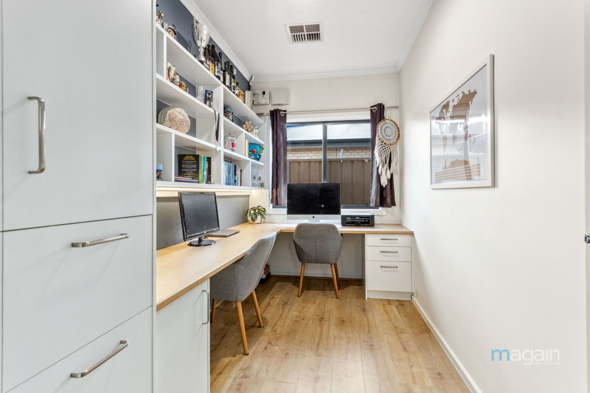 There is also a separate home office/study located off of the dining/meals area that comes with built-in cabinetry and this is where the NBN is connected, the ideal work from home space or a perfect study area for the kids...