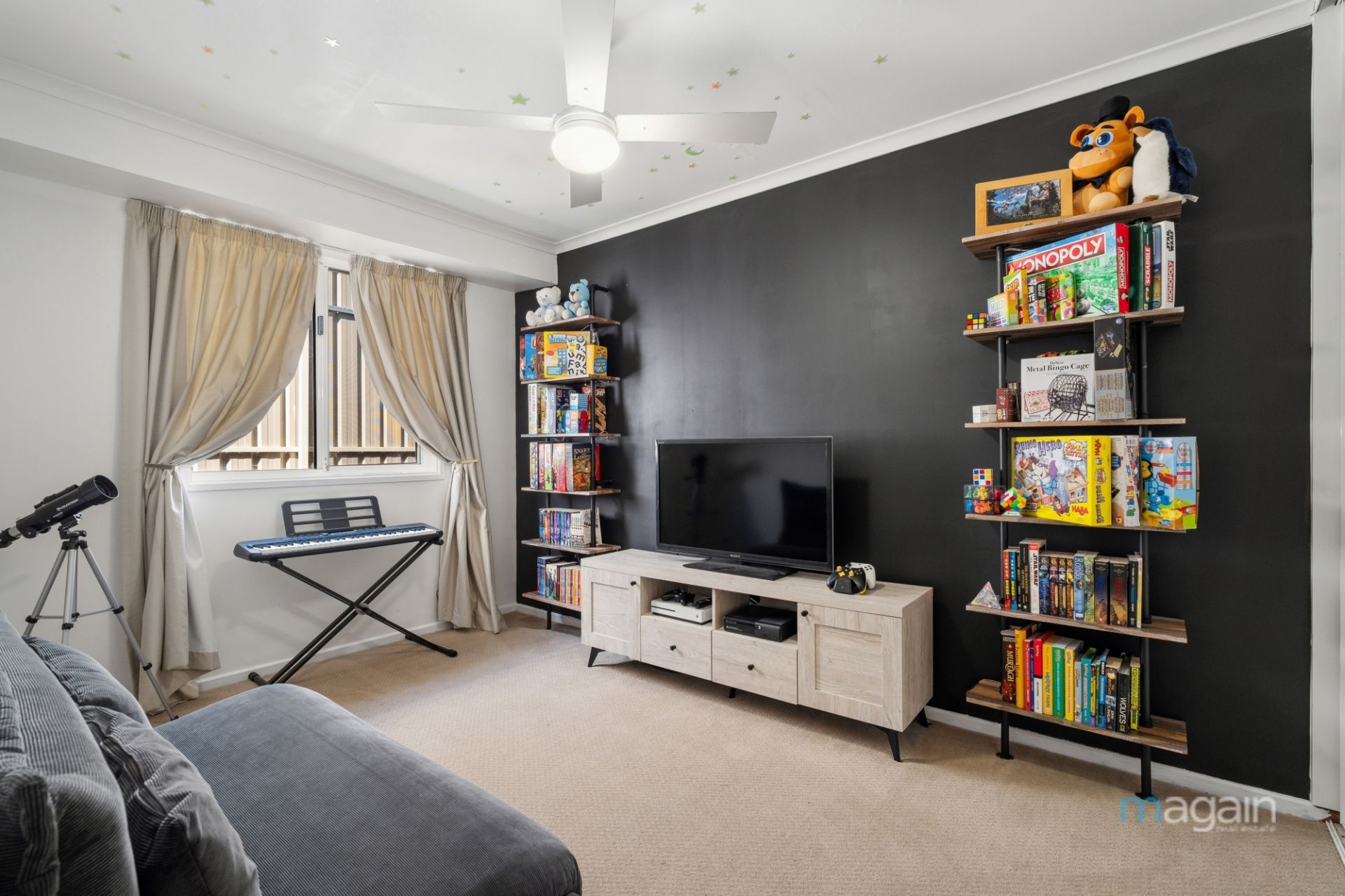 The three remaining bedrooms are tucked away at the rear of the home, each equipped with ceiling fans and built-in robes to ensure comfort and convenience. These bedrooms share a well-appointed family bathroom with a bath, shower, and separate toilet.