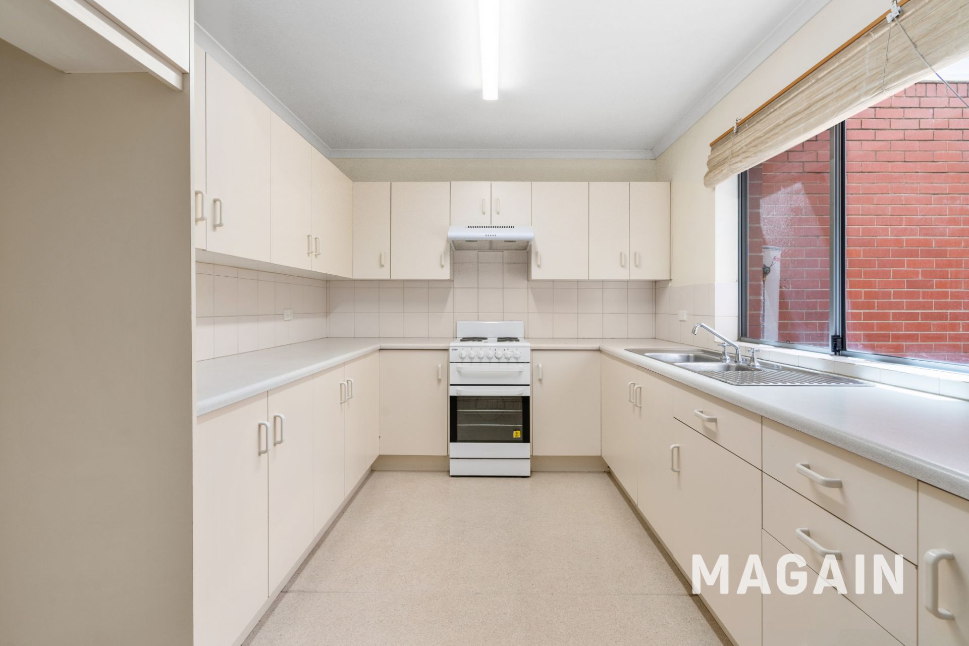 > Large kitchen with electric cooking appliances and plenty of cupboards / bench space.