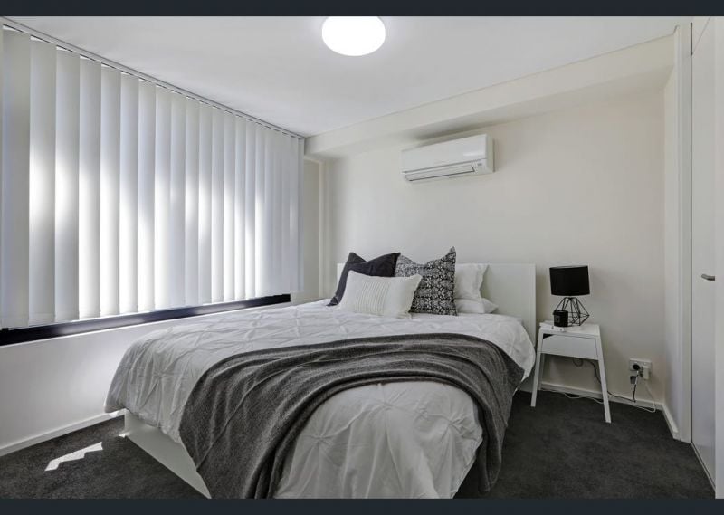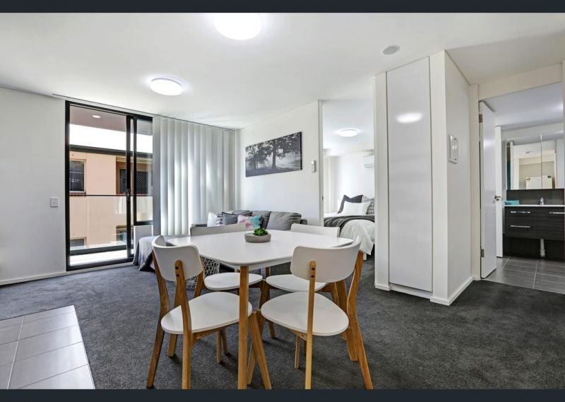 204A could lease for $550 - $600pw as a furnished apartment with two bedrooms, one bathroom, and a modern open-plan living area. The kitchen boasts luxury finishes including integrated oven and dishwasher a glass electric cooktop.