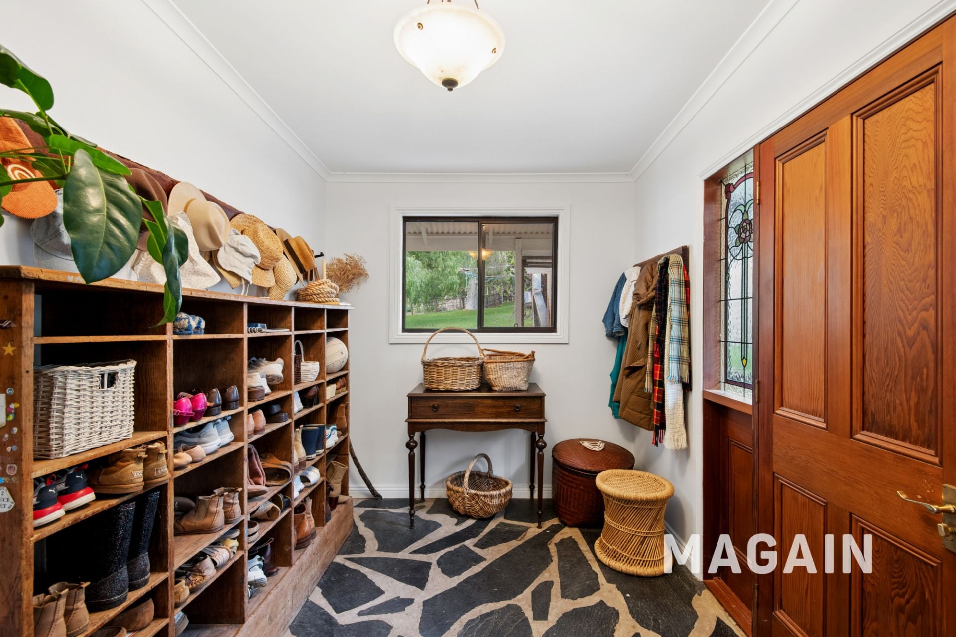 From the moment you step into the slate-floored mudroom, the home's cosy, country ambiance is apparent. A central hallway guides you through the residence, with access to a large storage room, well-appointed laundry with additional toilet, and ultimately on to the impressive main suite. Privately positioned in a separate wing of the house, this retreat boasts a generous bedroom with a sitting area, substantial double-sided walk-in robe, beautifully finished ensuite and double French doors that open up to those sweeping views across rolling hills with the ocean in the distance – a sanctuary in every sense of the word.