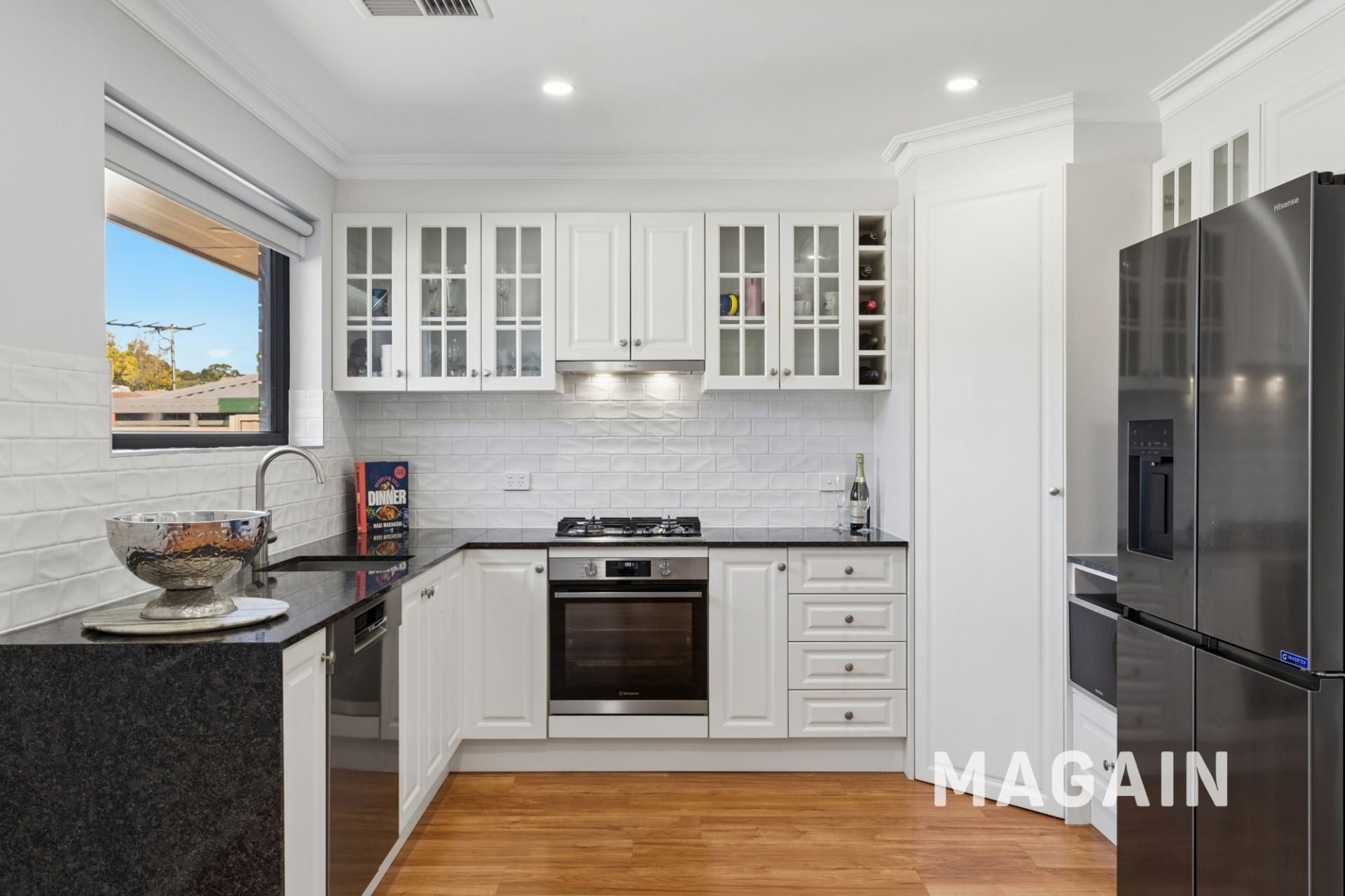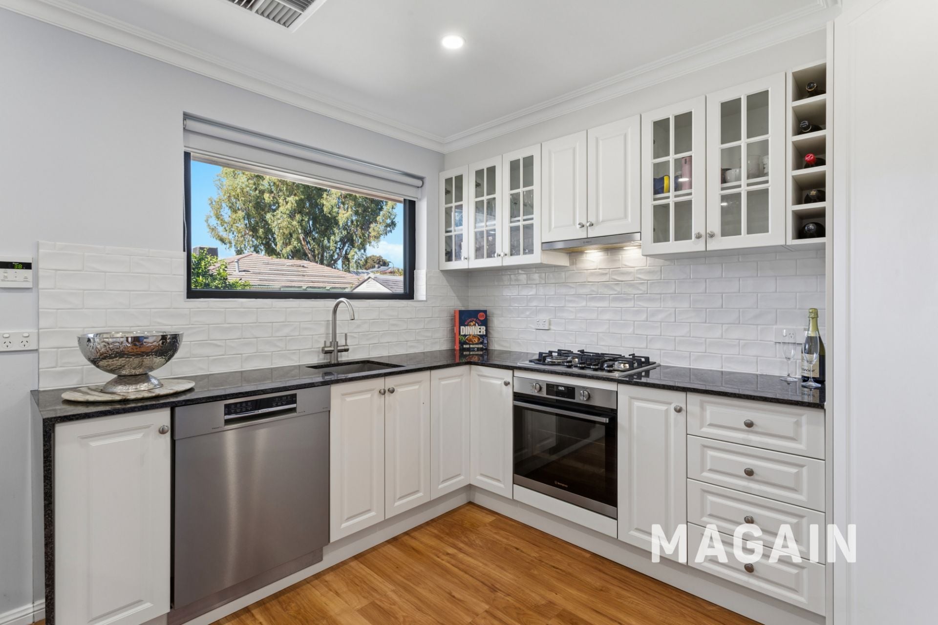 The kitchen combines charm with a contemporary feel, featuring abundant white cabinetry, contrasting dark benchtops, and a textured tiled splashback. Quality stainless-steel appliances, including a 4-burner gas cooktop with rangehood, oven, and dishwasher, make everyday cooking and cleaning simple and efficient. A spacious corner pantry provides excellent storage, complemented by dedicated fridge and microwave recesses for convenience. A stylish waterfall-edge benchtop completes the space with a modern, polished finish.