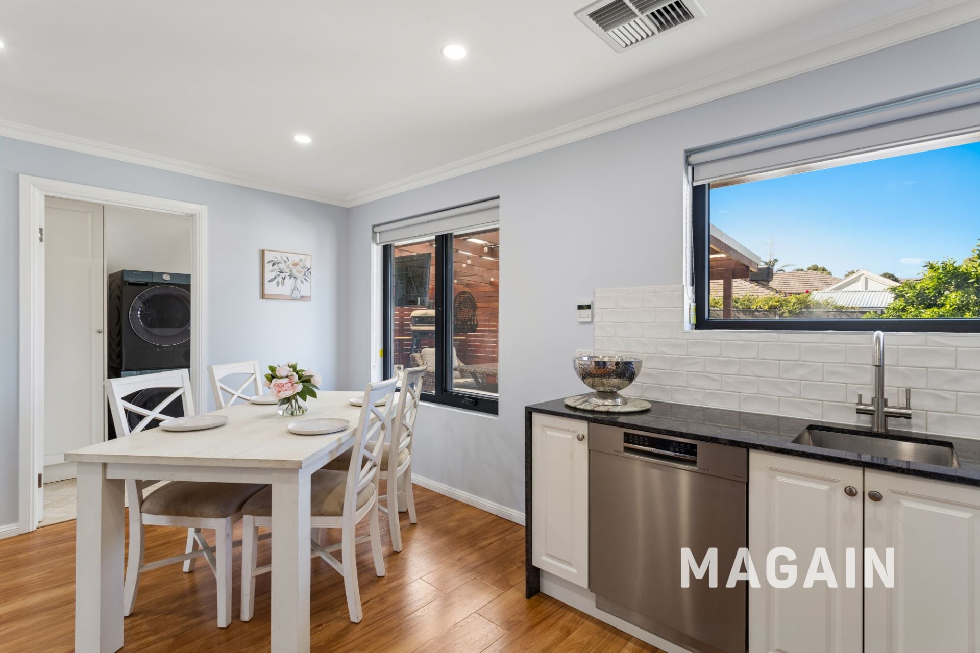 The kitchen and dining area is filled with natural light, creating a warm and welcoming space that's perfect for everyday living and entertaining. It provides a versatile setting whether you're sharing a home-cooked meal with family or preparing something special in the kitchen. Designed for both comfort and functionality, this area seamlessly supports relaxed family time and social gatherings alike.