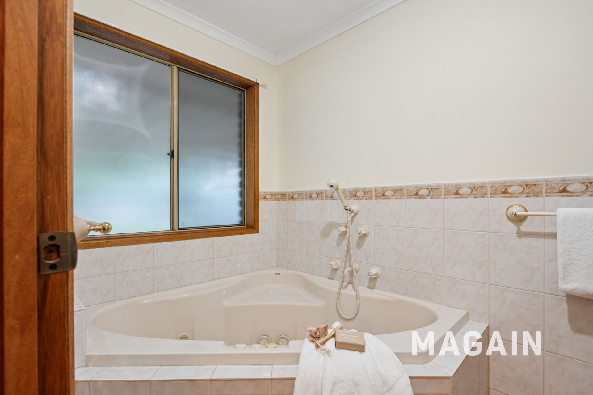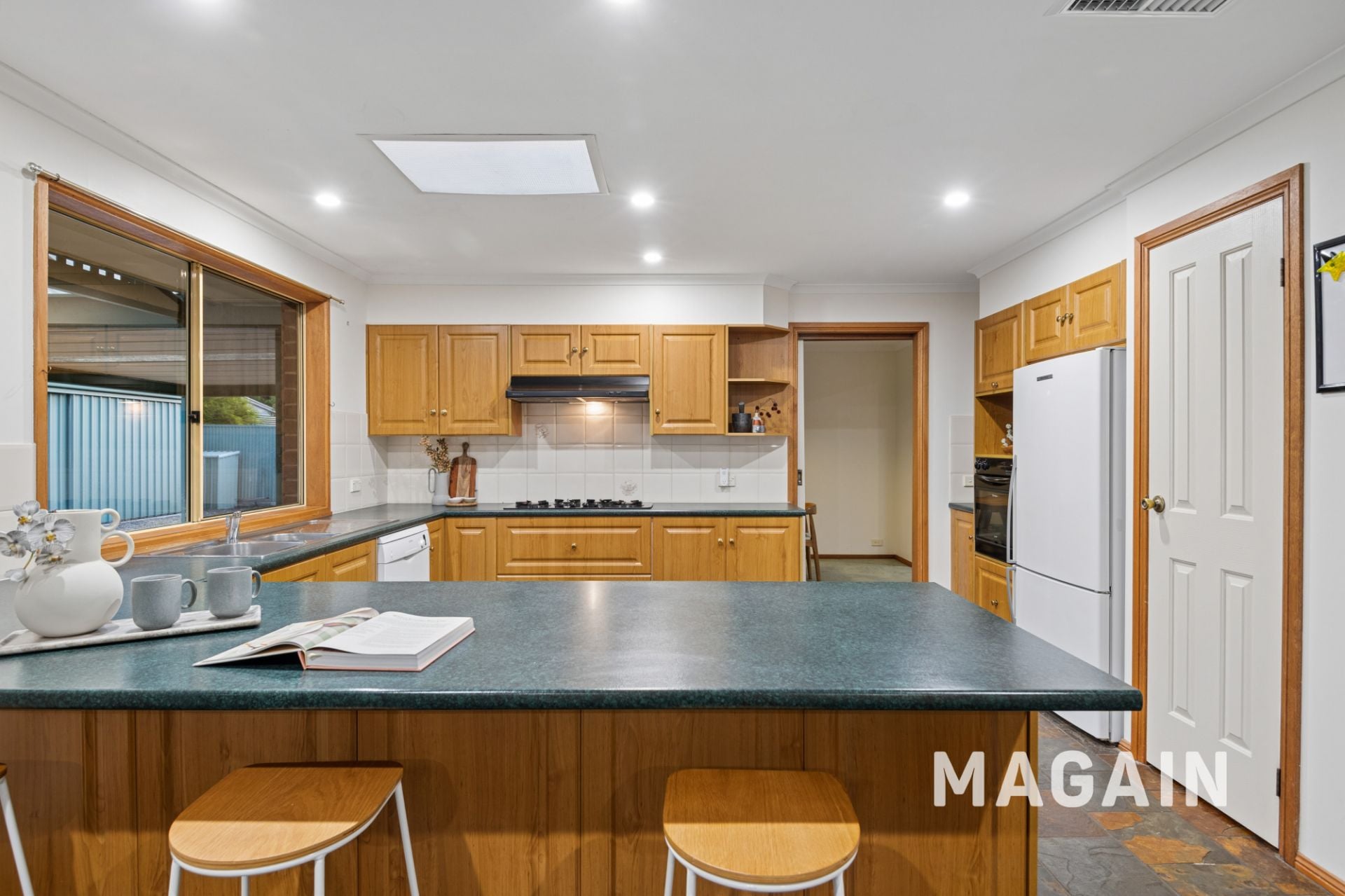 At the heart of the home is a well-appointed and generously sized central kitchen featuring a gas cooktop with rangehood, wall oven, dishwasher, dual sink, ample bench space and extensive cabinetry including a walk-in pantry. The kitchen overlooks the family room, complete with a cosy slow combustion heater and sliding glass doors that open to the rear undercover entertaining area – creating seamless indoor-outdoor flow.
