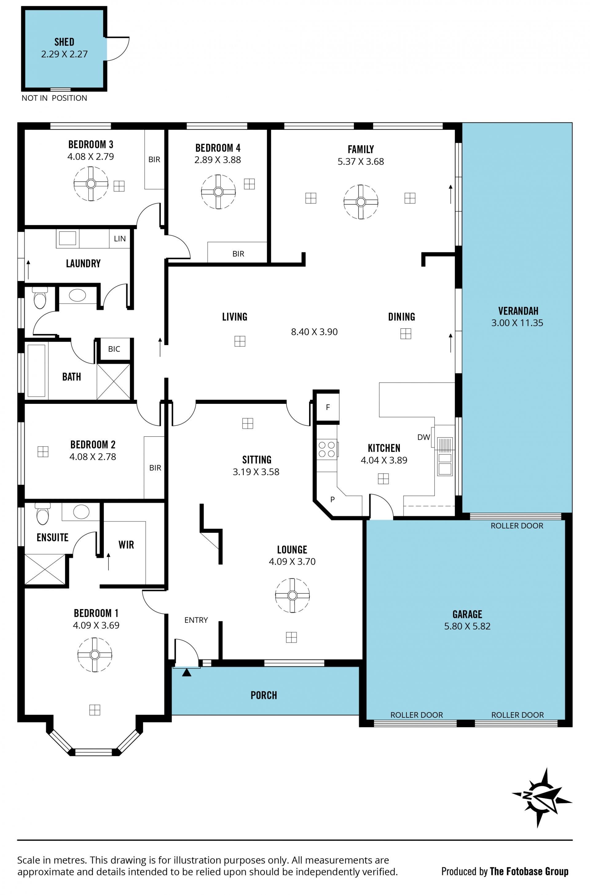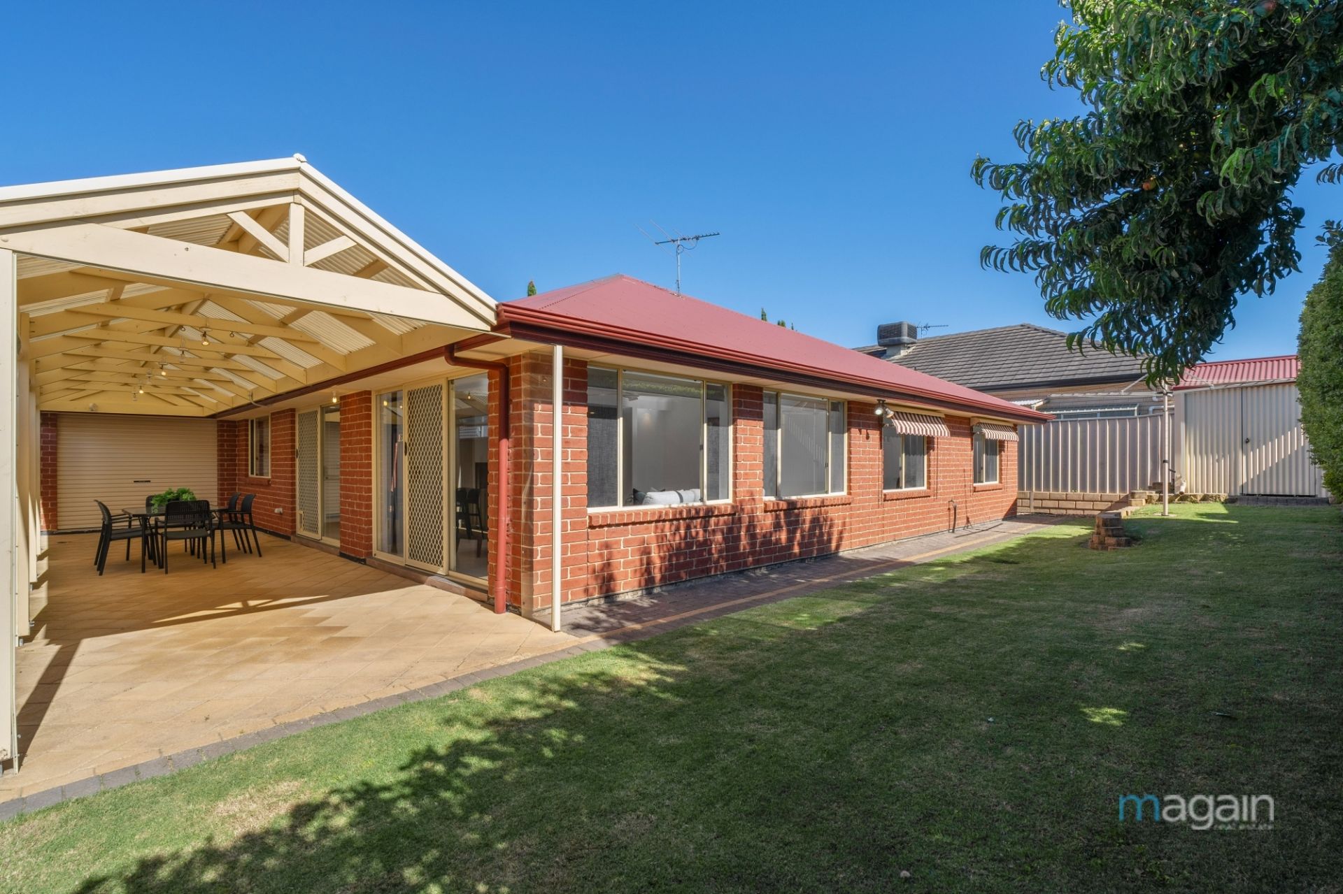 Outdoor enthusiasts will appreciate the expansive entertaining area accessible through glass sliding doors from the central living. The sandstone paved floor adds elegance, while the pitched roof pergola surrounded by café blinds offers shade and creates an ideal ambiance. This fantastic entertaining space leads to a generous grassy area with garden shed, at the rear of the home, for outdoor play and enjoyment.