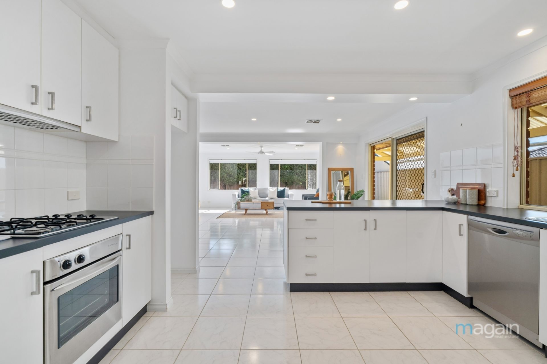 Transitioning from the formal lounge, discover an expansive open-plan kitchen /dining and living area adorned with modern design elements, adjacent to a third living/rumpus. The tastefully updated kitchen caters to culinary enthusiasts, featuring an abundance of bench space, a walk-in pantry, and quality appliances including a dishwasher, and a gas cooktop, while a breakfast bar serves as a focal point for gatherings.