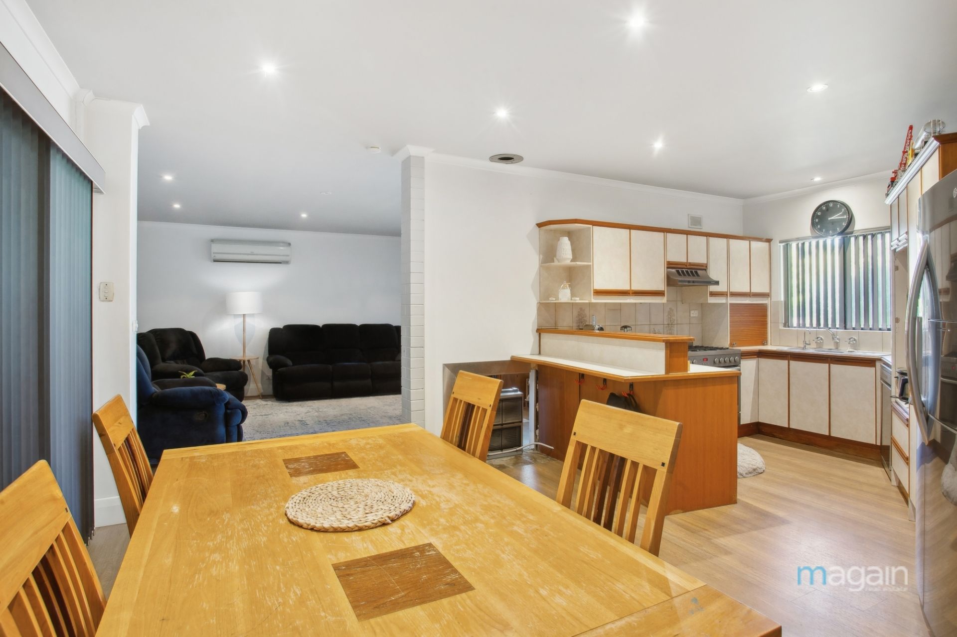 Step into this family home and you'll find a welcoming formal lounge adjacent to a rumpus room, equipped with a split system unit for year-round comfort. The kitchen, which overlooks a casual dining area warmed by a gas heater, is complete with a dishwasher and breakfast bar.