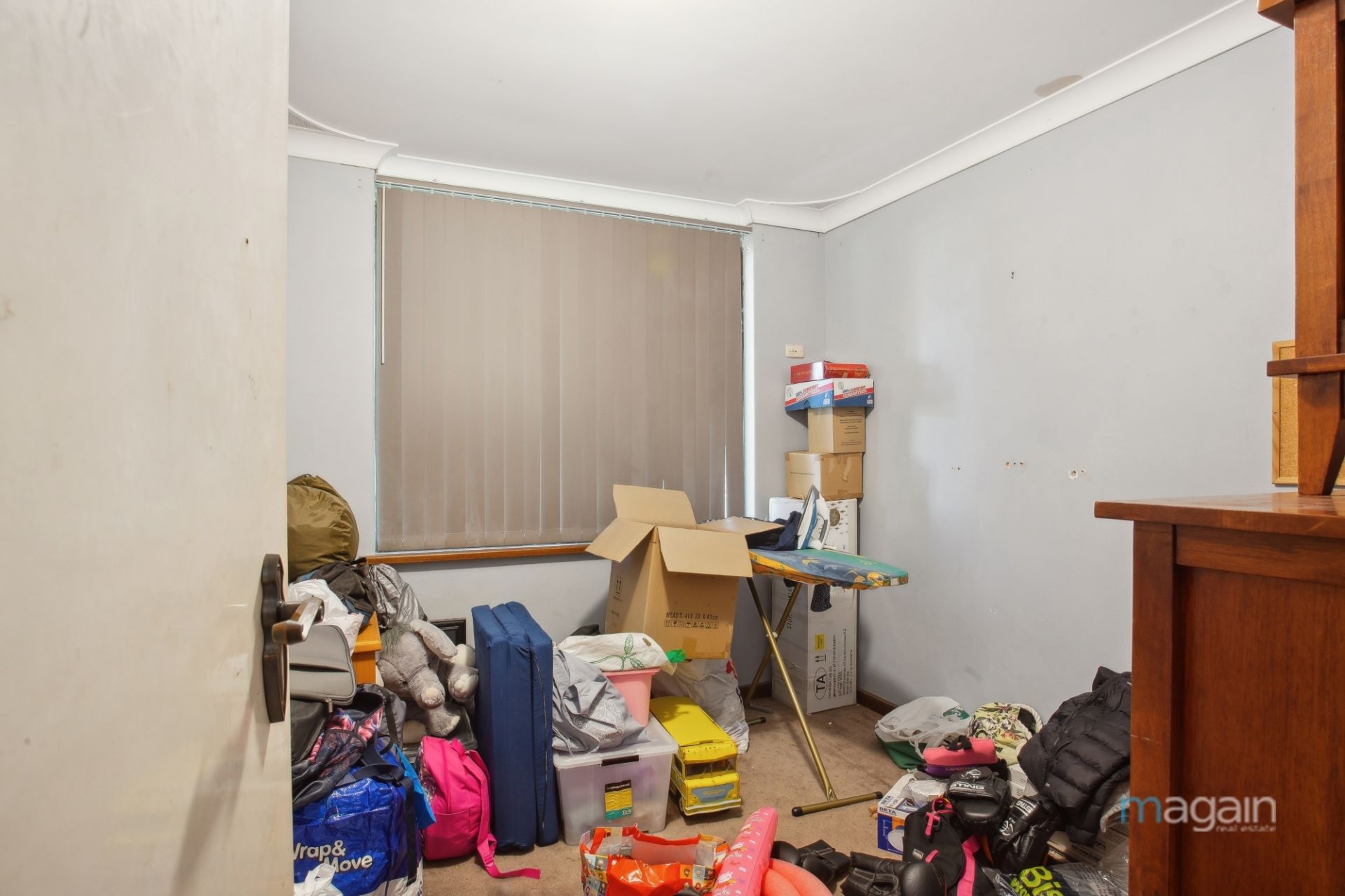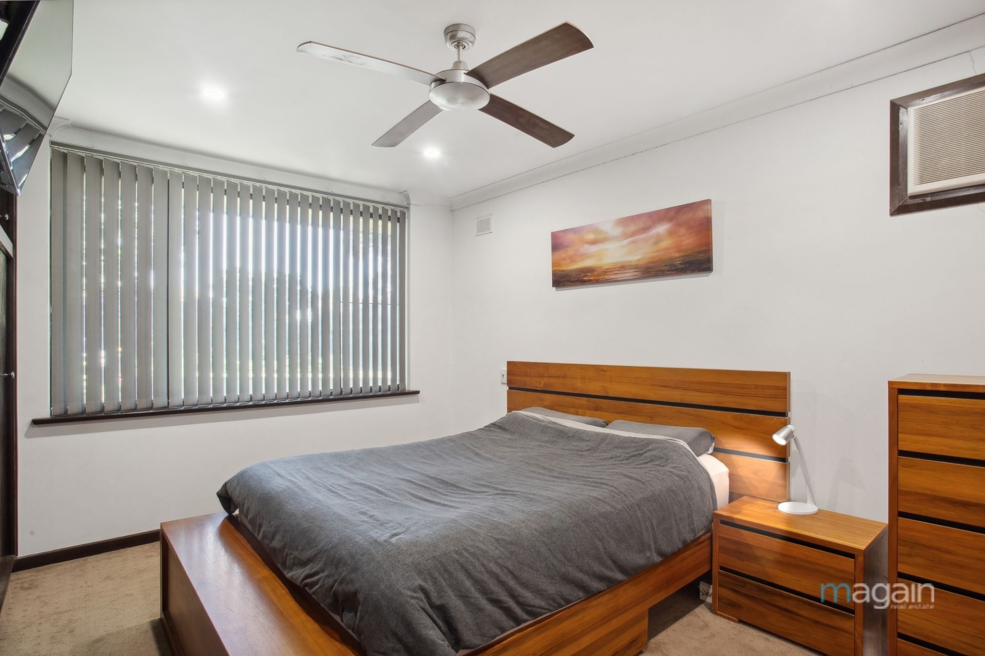 The home features four bedrooms conveniently located off the casual dining area. The master bedroom includes a built-in robe and ceiling fan, while all bedrooms offer easy access to the main bathroom, with a built-in linen cupboard in the hallway providing additional storage.