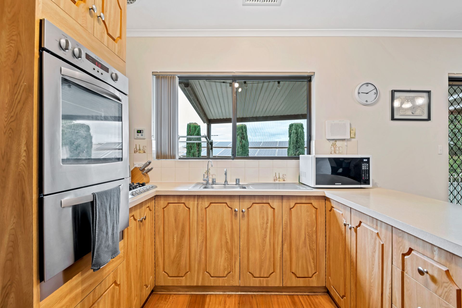 The kitchen in the home features modern lighting, ample bench, cupboard and storage space, electronic temperature controlled hot water, stainless steel modern appliances, (gas cooktop and electric oven). Through the kitchen you will find the large laundry which also has plenty of cupboard storage and access to outside washing line and pergola.