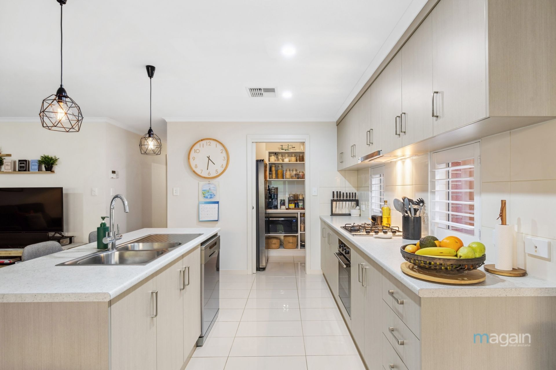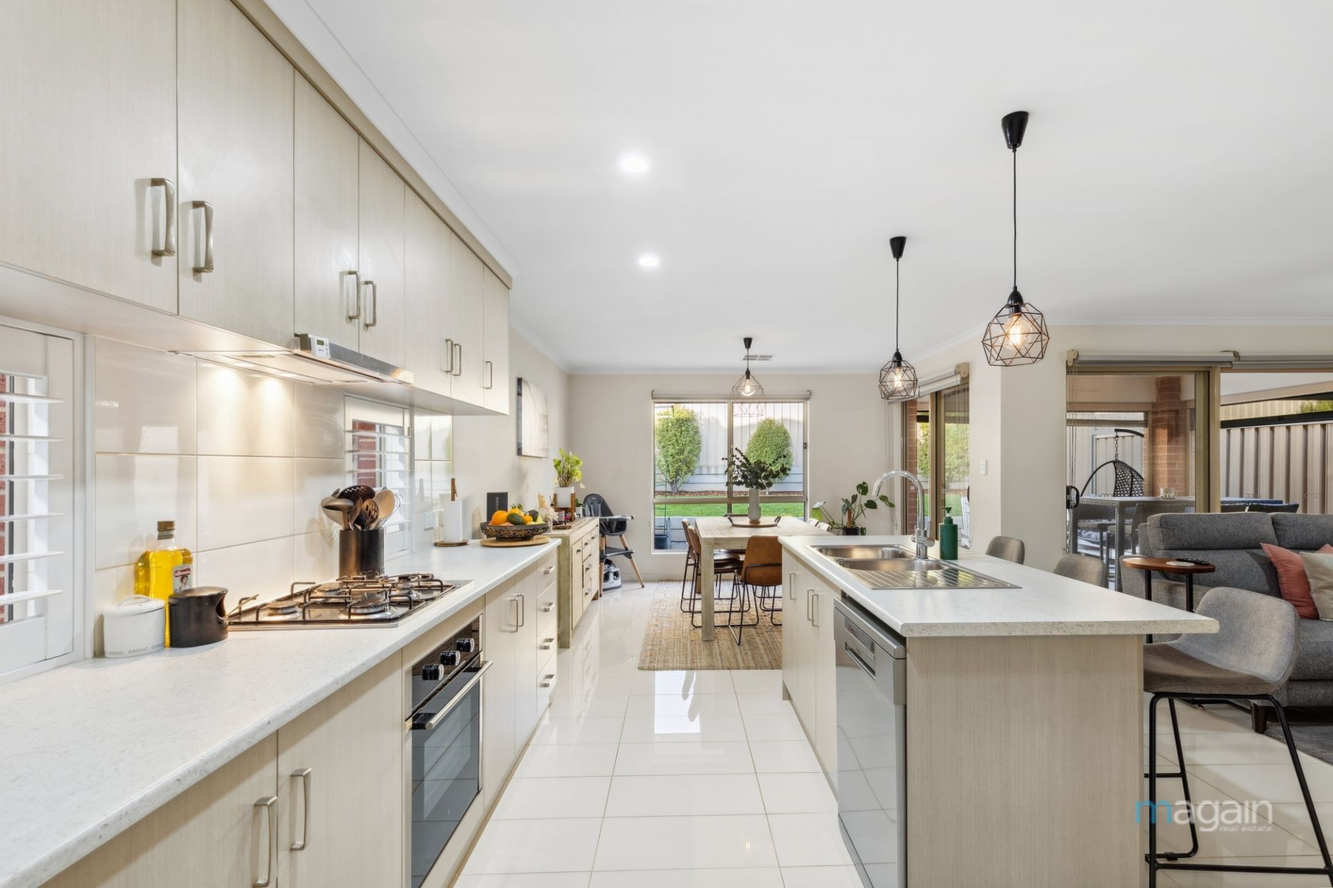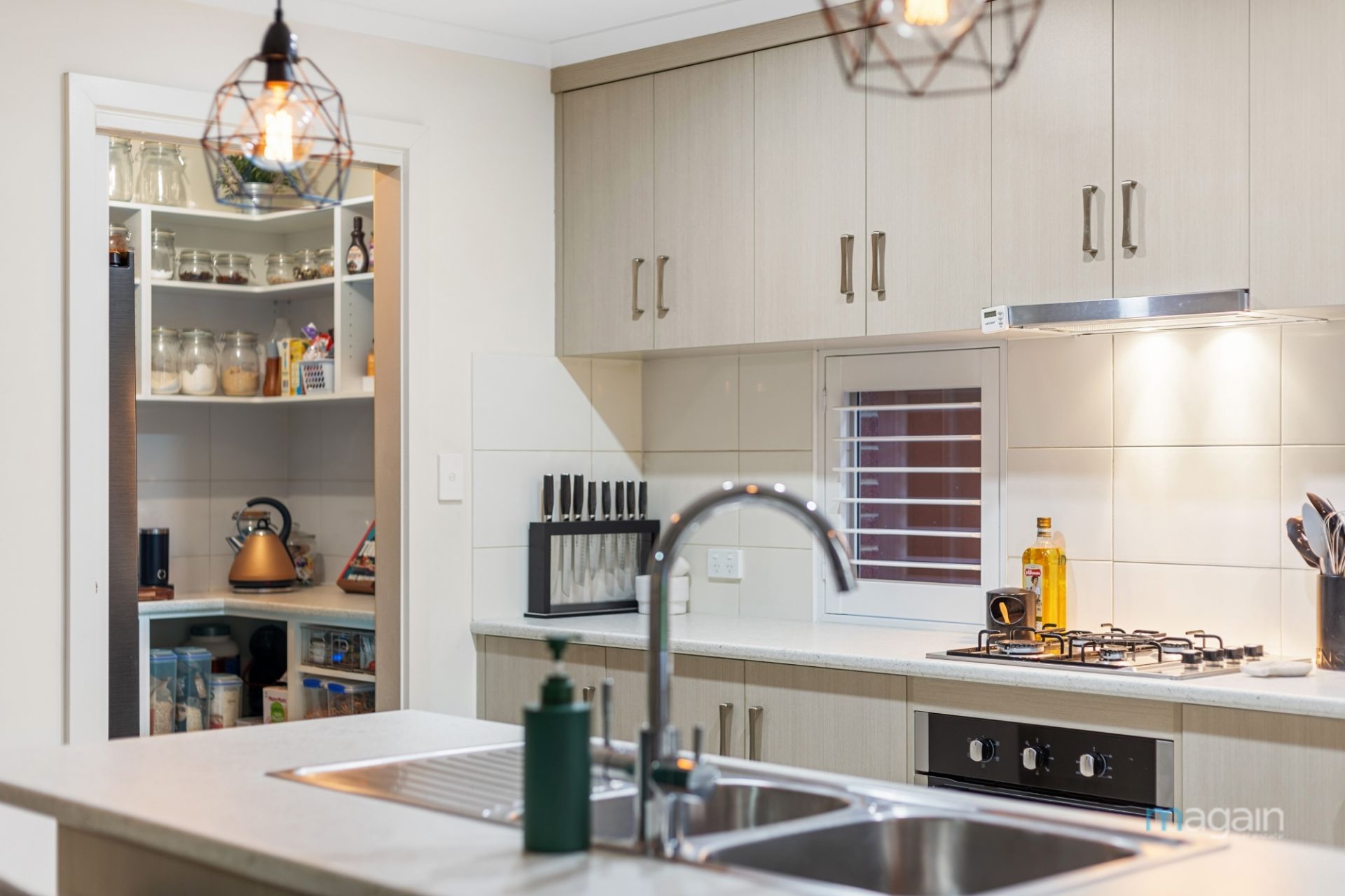 The heart of the home lies in the rear open-plan kitchen, dining, and living zone - a truly impressive space perfect for relaxing or entertaining. The gourmet kitchen boasts a gas cooktop with under-mounted rangehood, dishwasher, stainless steel double sink, a generous island bench with breakfast bar seating, and a fantastic butler's pantry offering additional storage and fridge space.