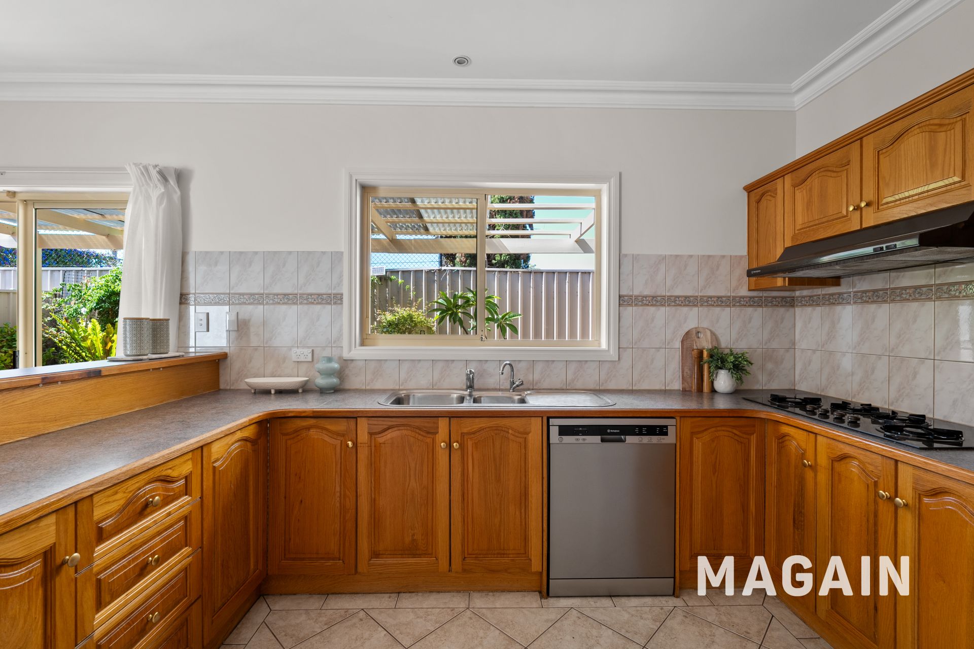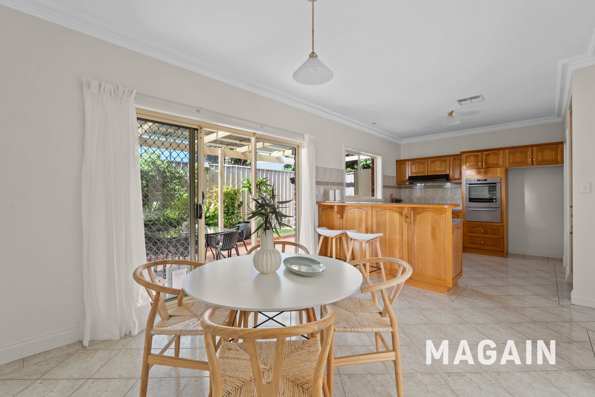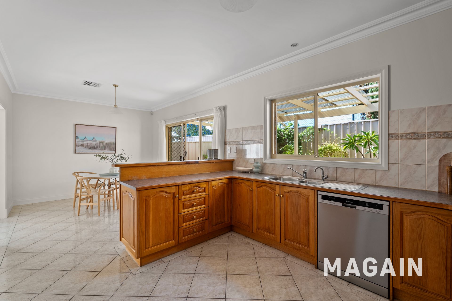 Generous kitchen and dining area with timber cabinetry, quality appliances and ample bench space