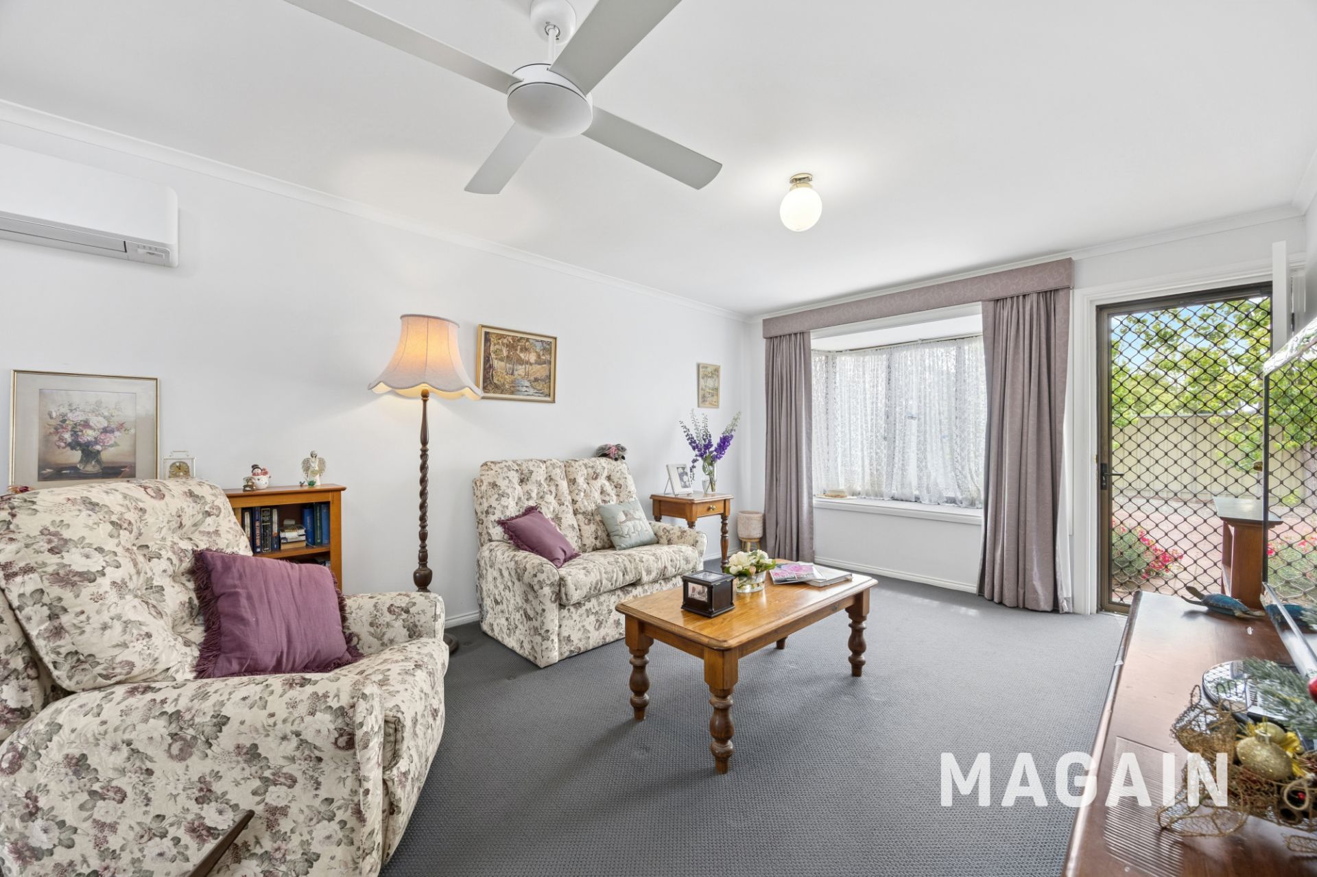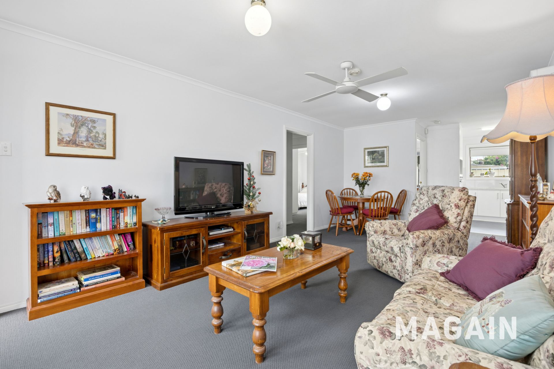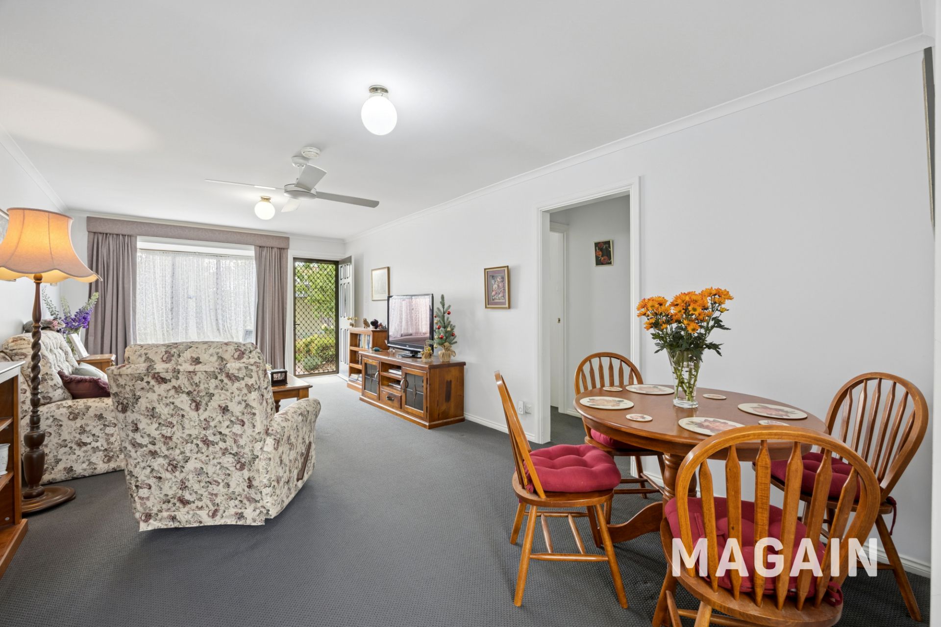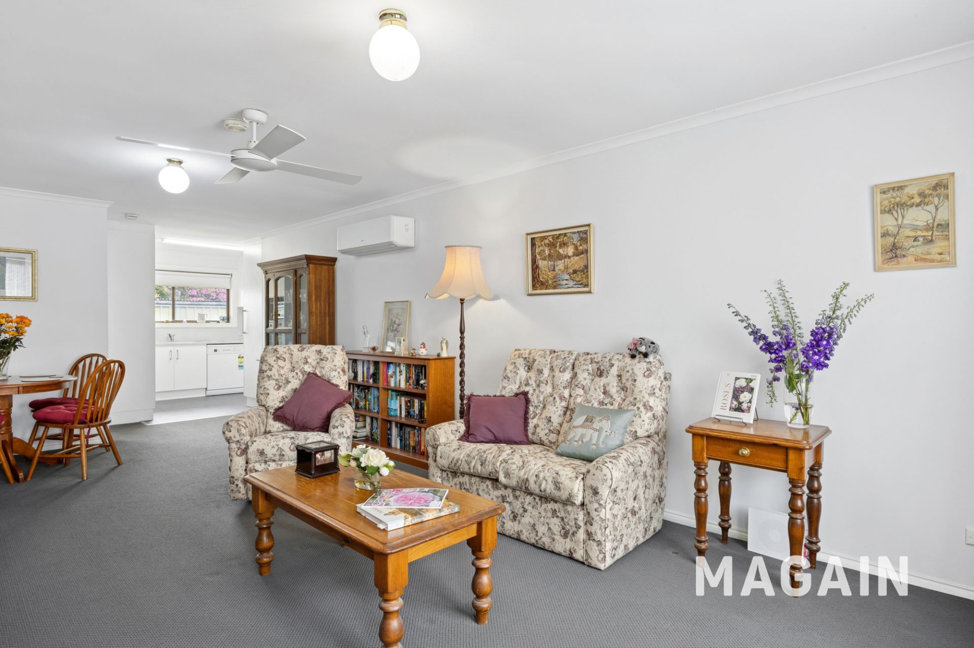 Upon entry, you're welcomed into a warm and inviting living and dining area, highlighted by a large picture window that floods the space with natural light. Plush carpeting adds comfort underfoot, while the split-system air conditioner and ceiling fan provide year-round climate control. Perfect for hosting family and friends, this open-plan space offers ample room to relax, entertain, or enjoy a home-cooked meal together.