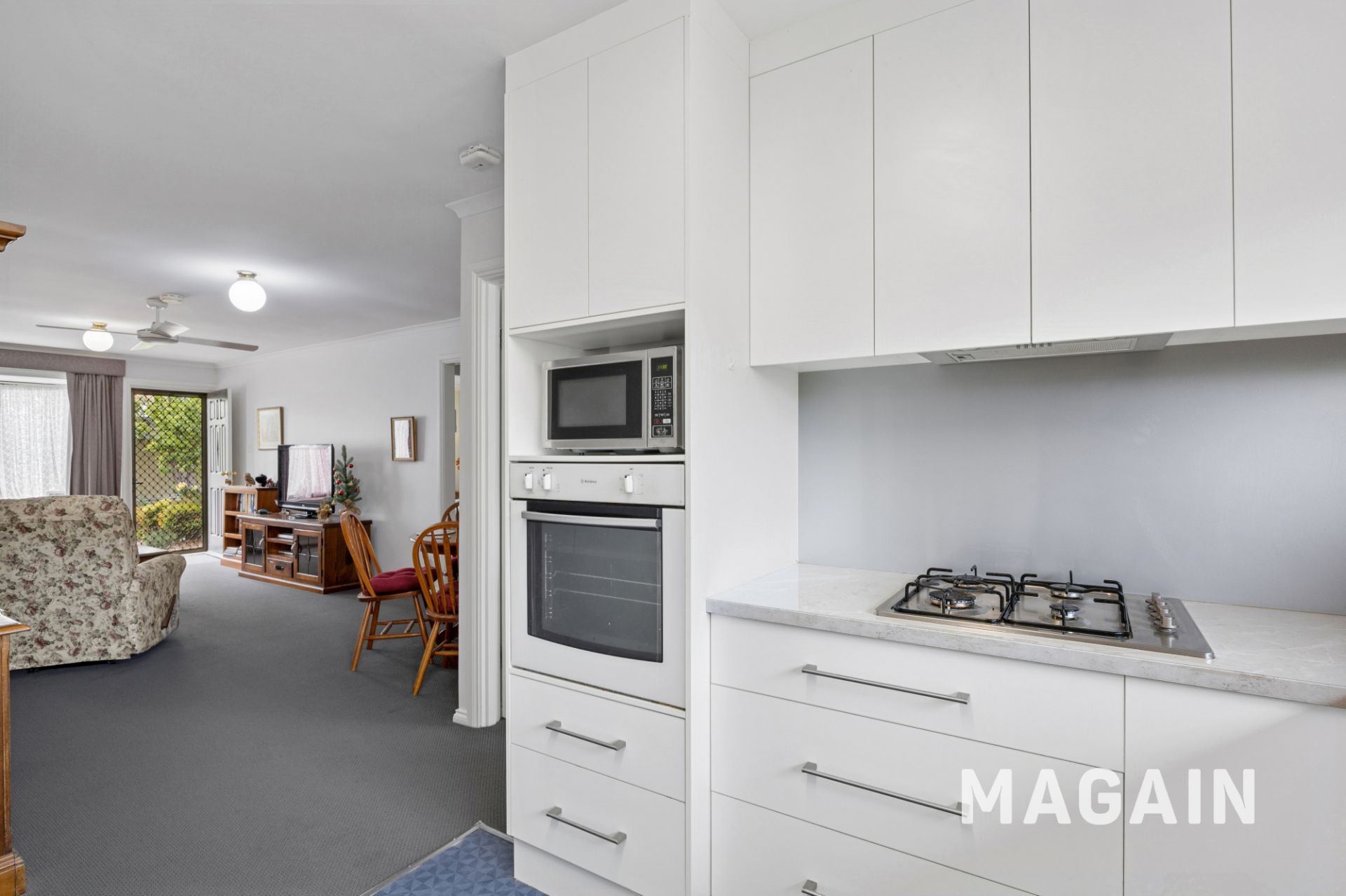 The kitchen is bright and neutral, featuring ample cabinetry and generous bench space to deliver both practicality and comfort for any home cook. Quality appliances, including a 4-burner gas cooktop with rangehood, oven, and dishwasher, make meal preparation and cleanup a breeze. Additional features include a pantry, designated fridge and microwave recesses, and a double sink.