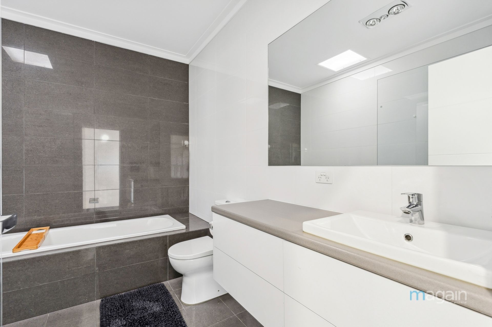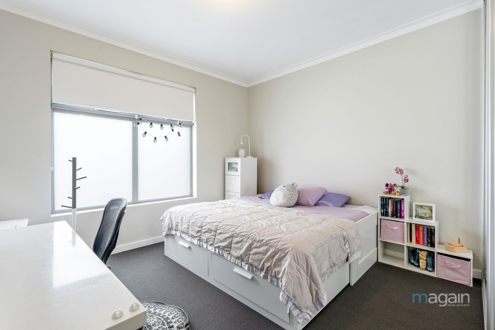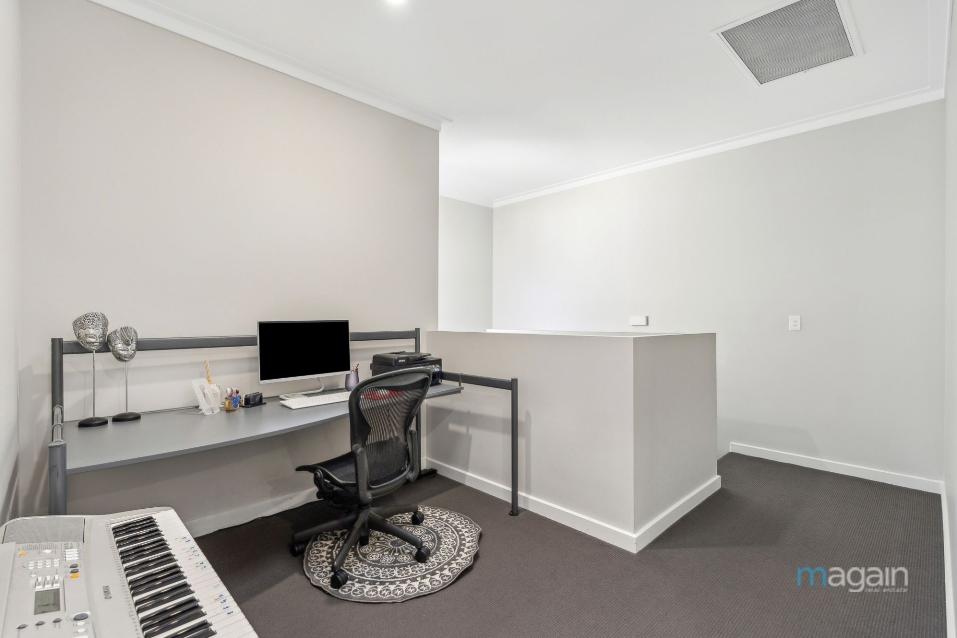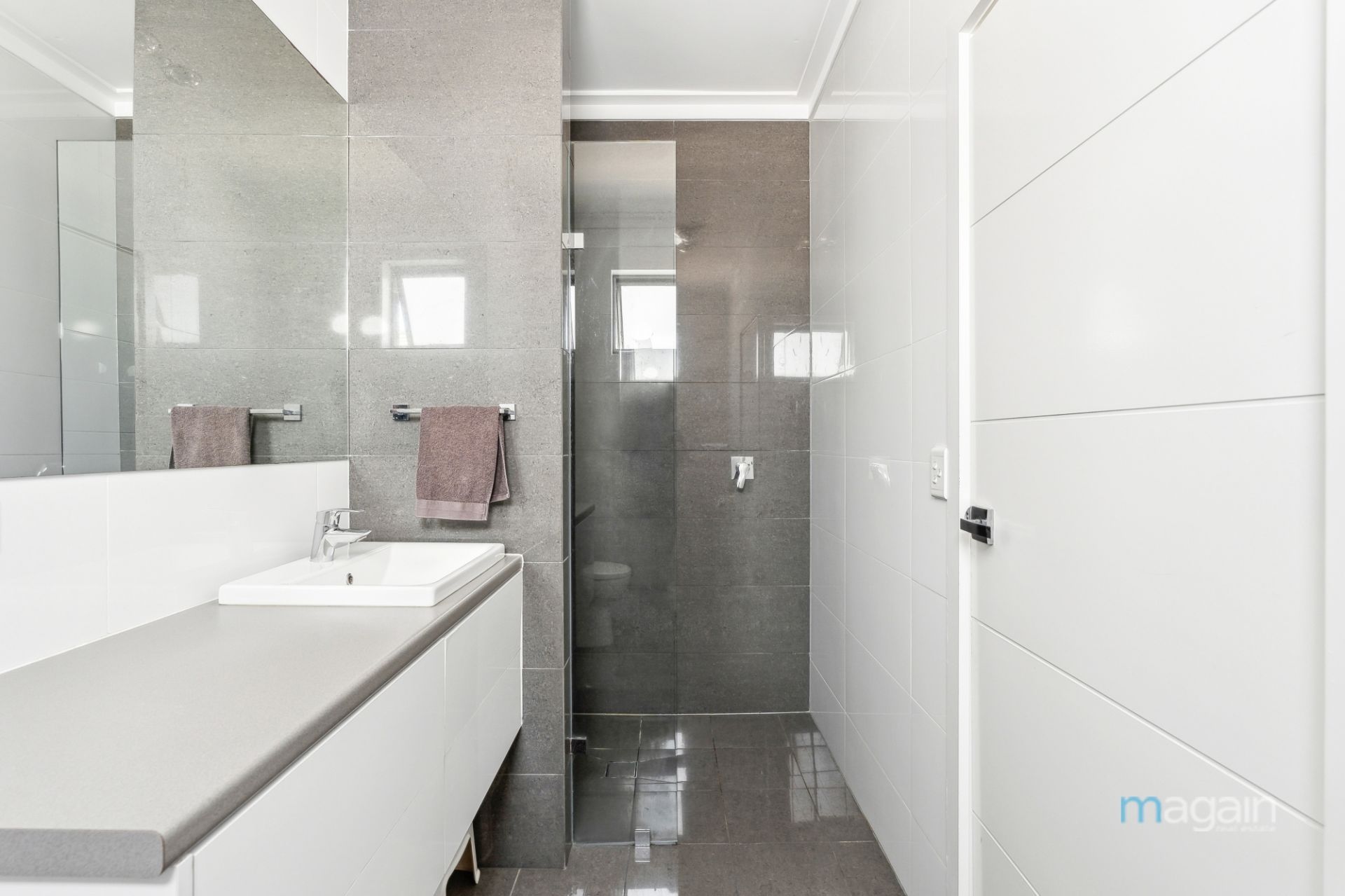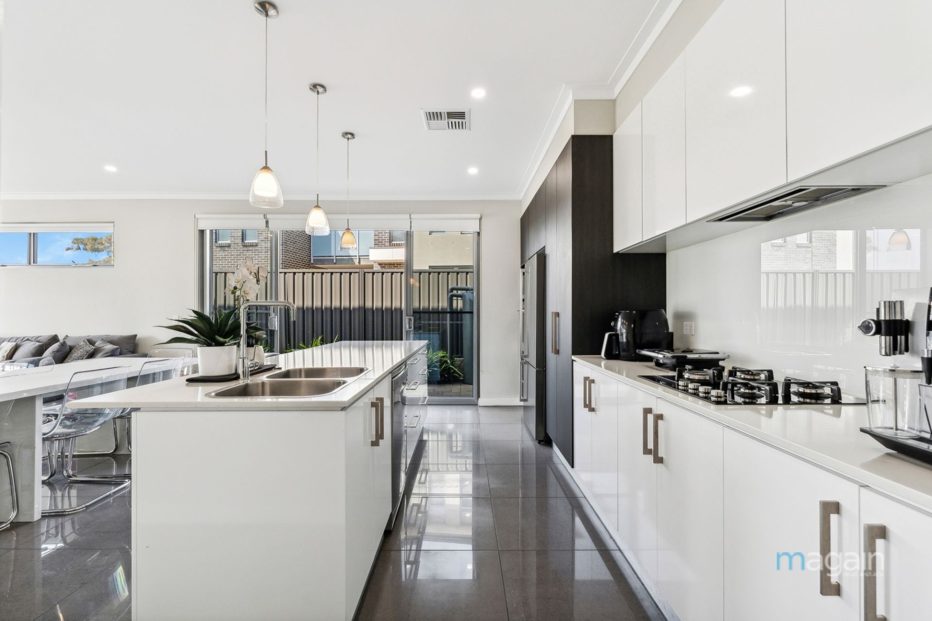 Conveniently tucked away just off the kitchen, a staircase with under-stair storage leads upstairs to the beautifully presented bedrooms, a study nook, and two bathrooms. The master bedroom boasts a built-in robe and a modern ensuite with pristine white tiling and premium fixtures. Bedrooms two and three include built-in robes and share a spacious main bathroom with bath, vanity, toilet, and shower.