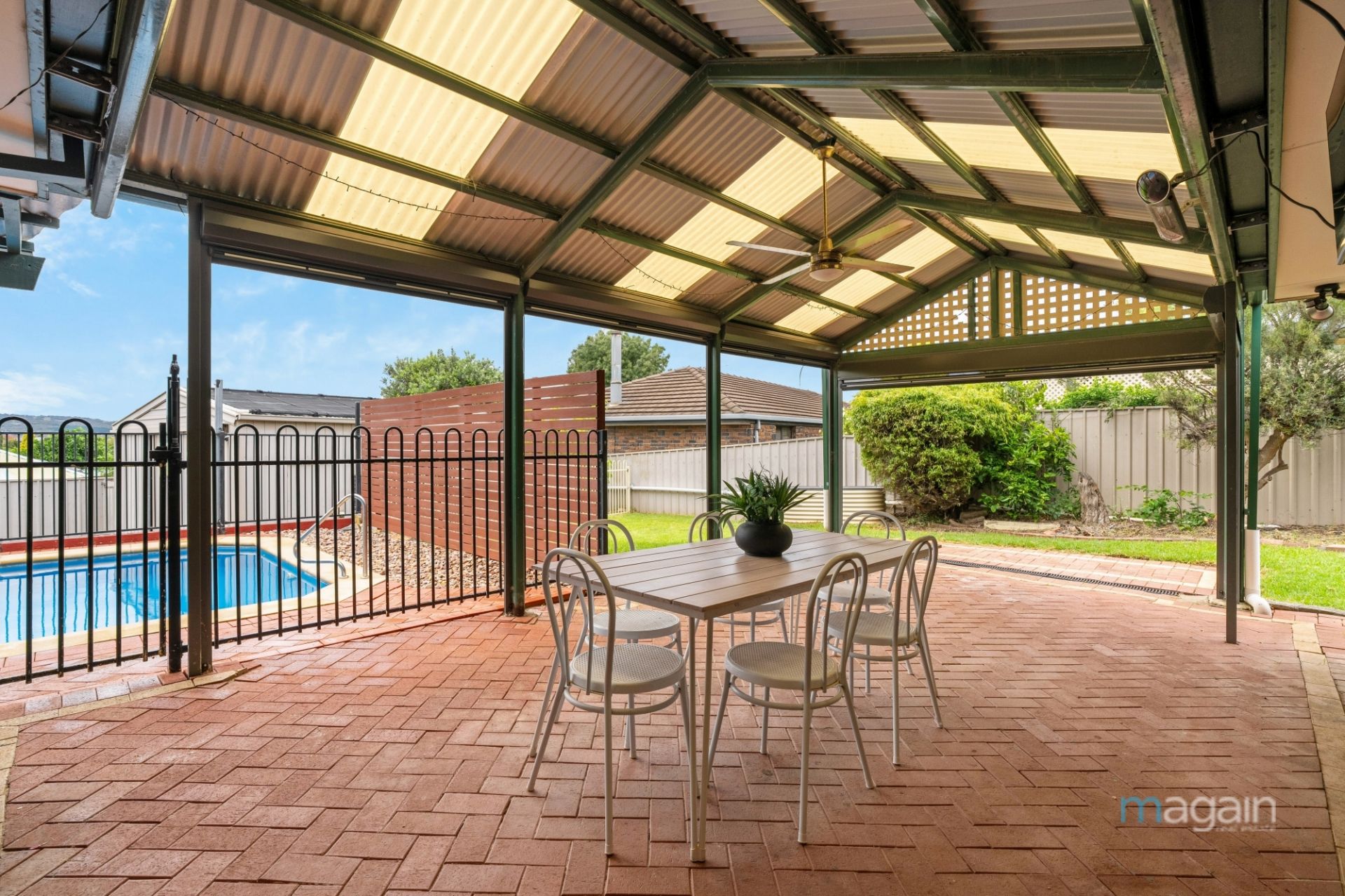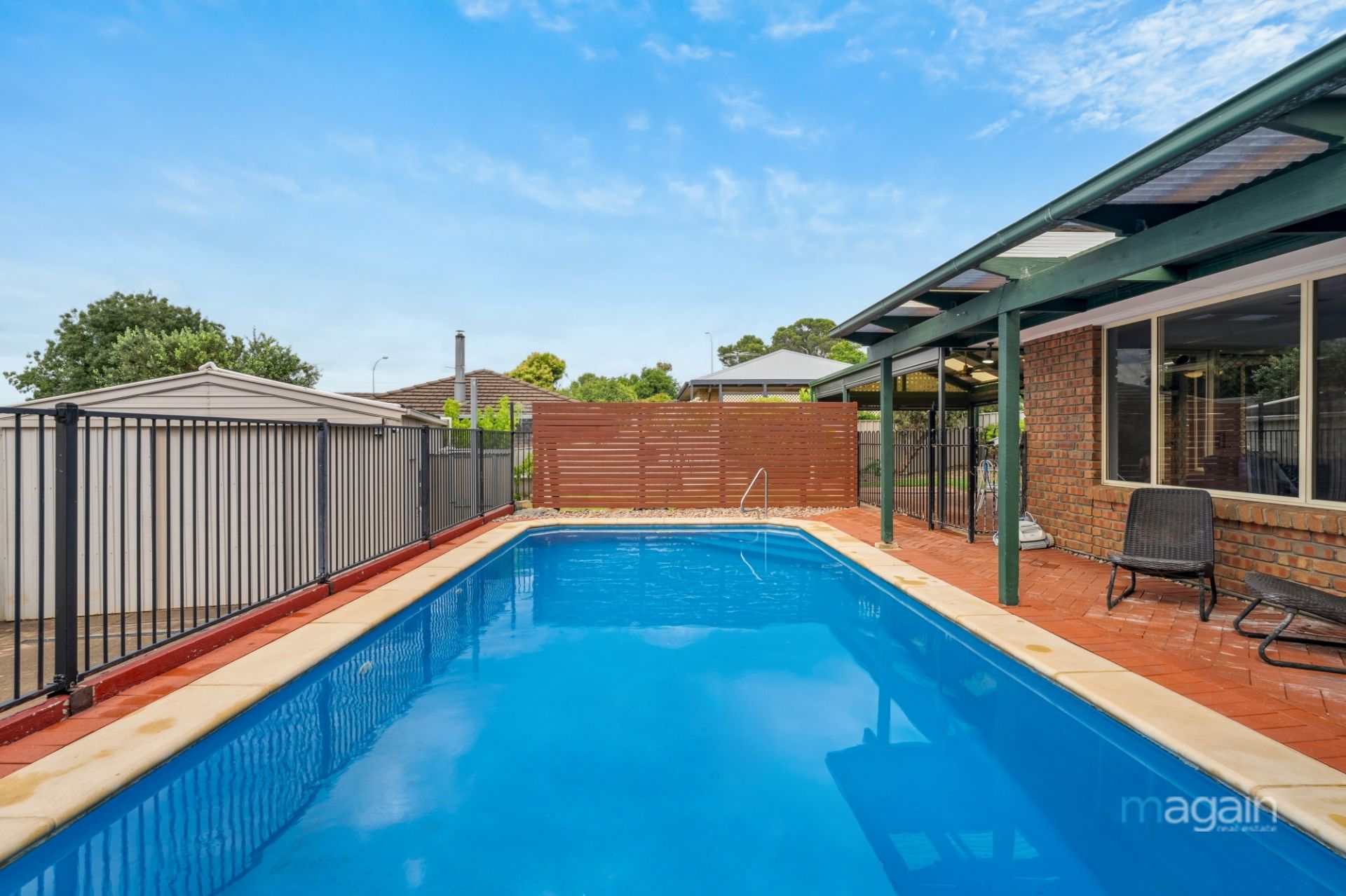 Step outside to an entertainer's paradise, where glass sliding doors from the family living area lead to a paved entertaining space covered by a pitched roof pergola and surrounded by zip-track blinds. This delightful area overlooks a stunning inground fiberglass pool, with solar heating and a luxurious mineral swim system. The outdoor space also includes a generously sized lawn area, raised garden beds perfect for growing fruit and vegetables, and a garage with convenient drive-through access from the front.