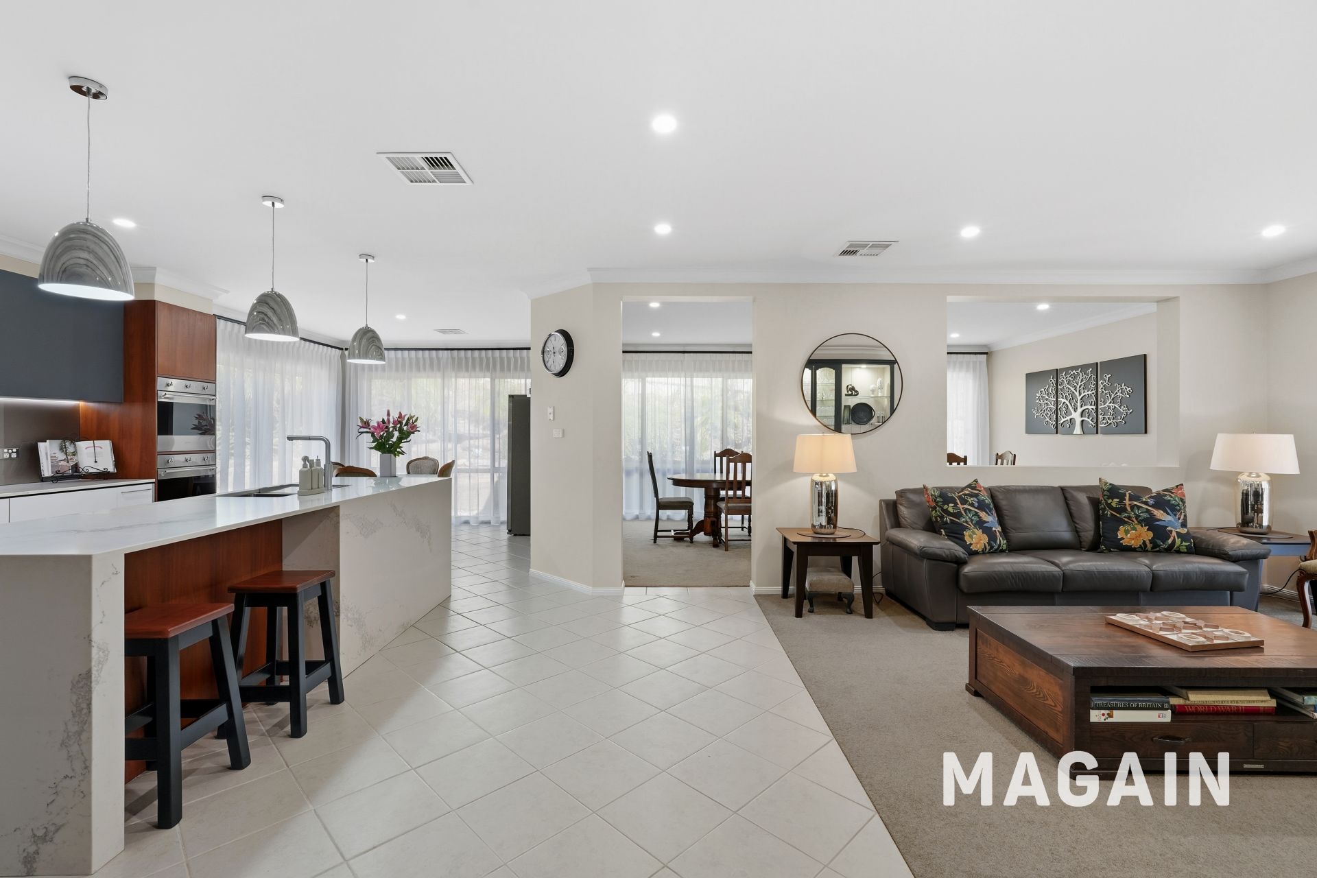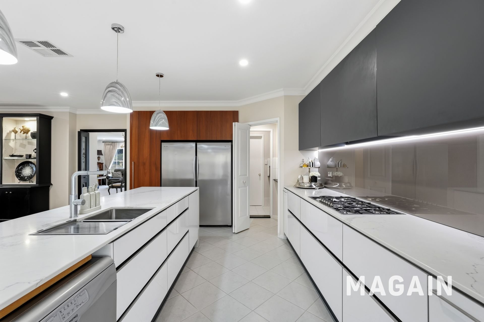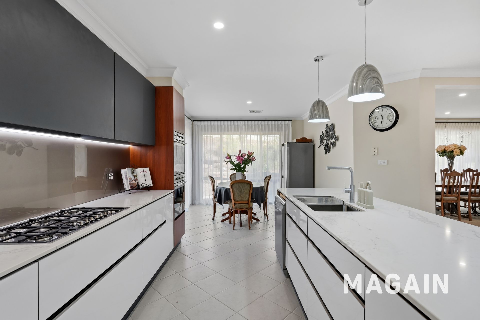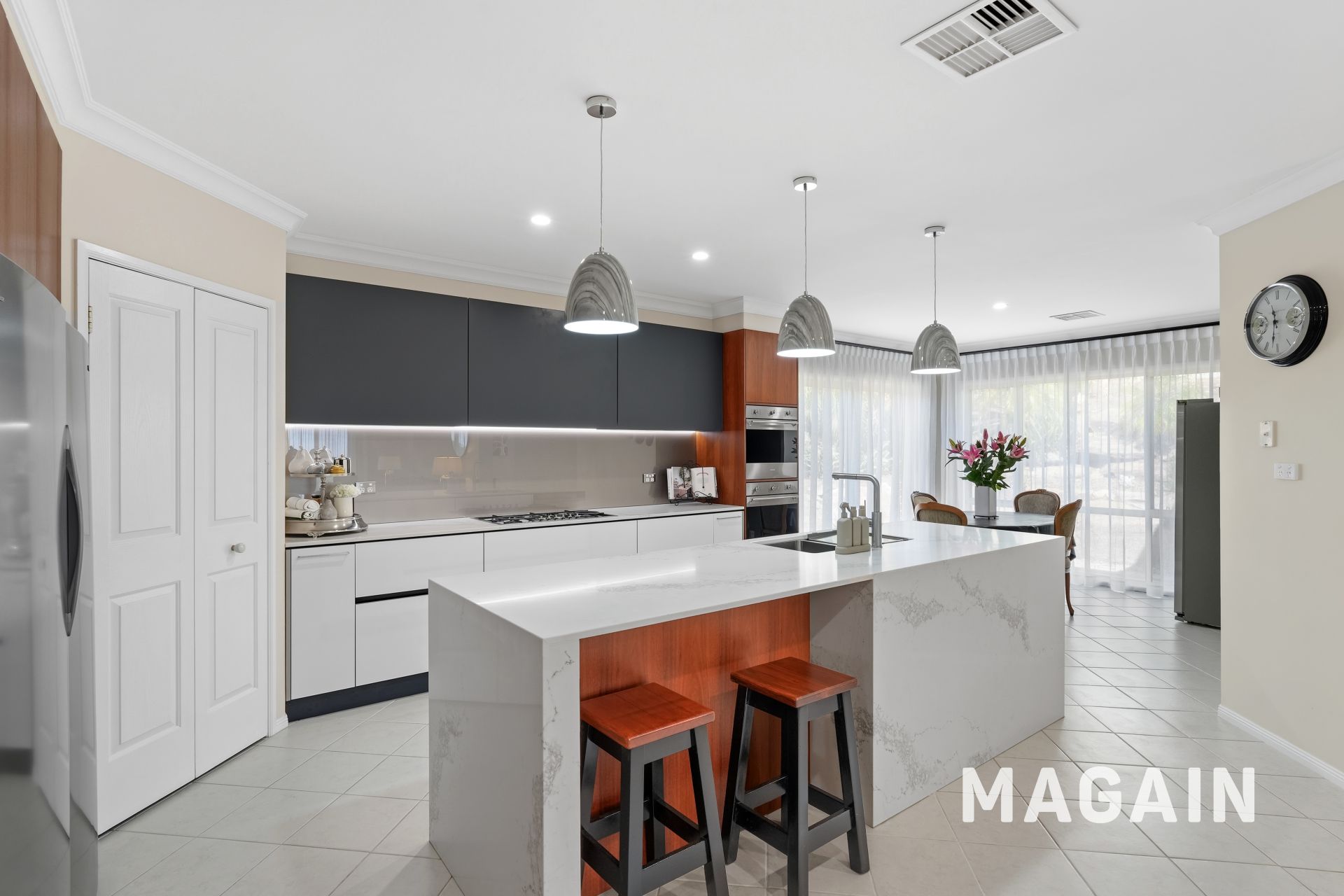 The kitchen combines style and practicality, offering abundant cabinetry and sleek Caesarstone benchtops. Well-appointed with premium appliances, including a six-burner gas cooktop with rangehood, dual ovens, and two dishwashers (one accessed via the pantry), it caters effortlessly to both passionate home cooks and those seeking convenience. Standout features include statement pendant lighting, a spacious walk-in pantry, double sink, dedicated fridge alcove, and a breakfast bar/serving bench ideal for casual dining and entertaining.
