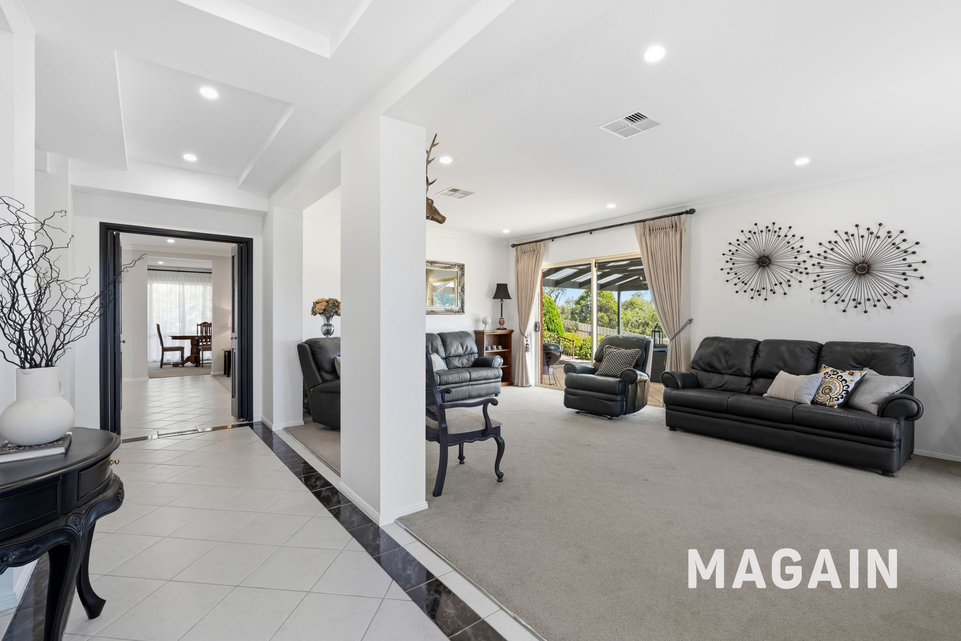 At the centre of the home is the expansive open-plan living, kitchen, and dining area, designed for effortless everyday living. Whether you're relaxing after a long day, sharing meals with family, or preparing your favourite dishes, the well-considered layout creates a seamless and connected space. Glass sliding doors extend the living area outdoors to a covered pergola, providing the perfect setting for year-round entertaining and easy indoor-outdoor flow.