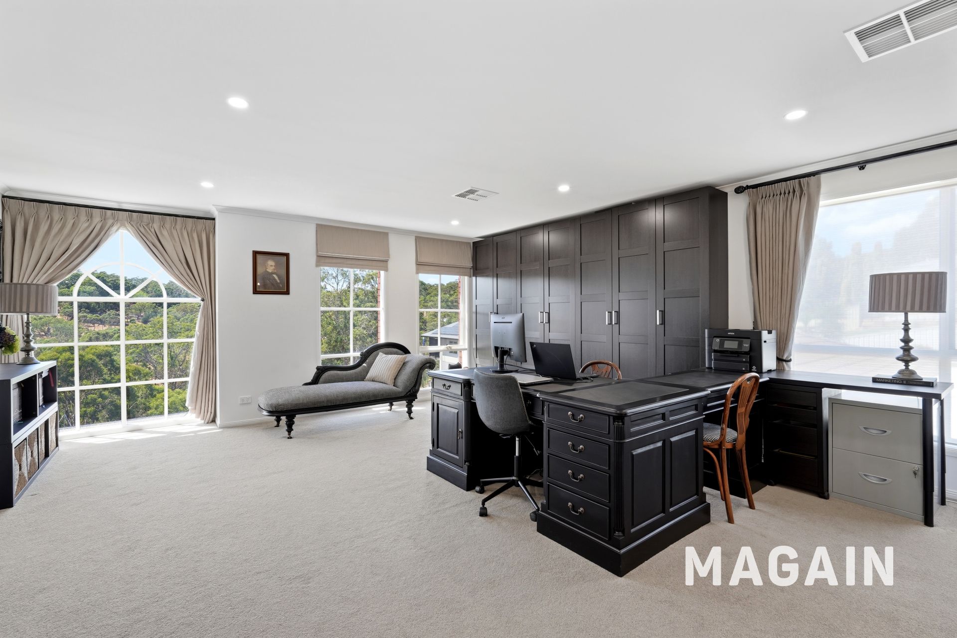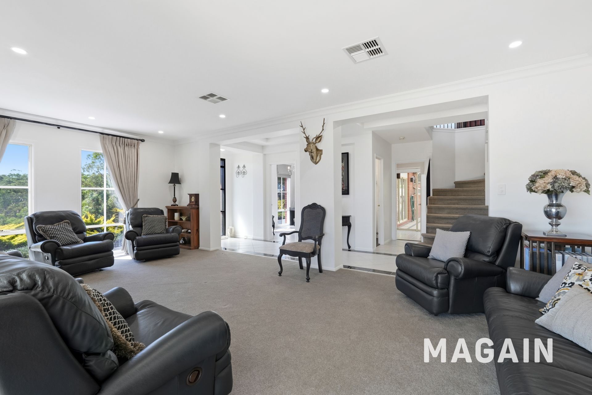 Upstairs, a spacious and versatile living retreat awaits, capturing vibrant elevated views. Featuring plush carpeting, expansive picture windows, modern downlights, and ducted air conditioning, this inviting space offers a comfortable and cosy setting for the whole family to relax and unwind.