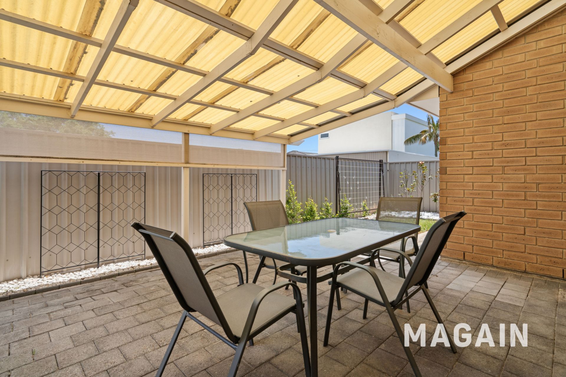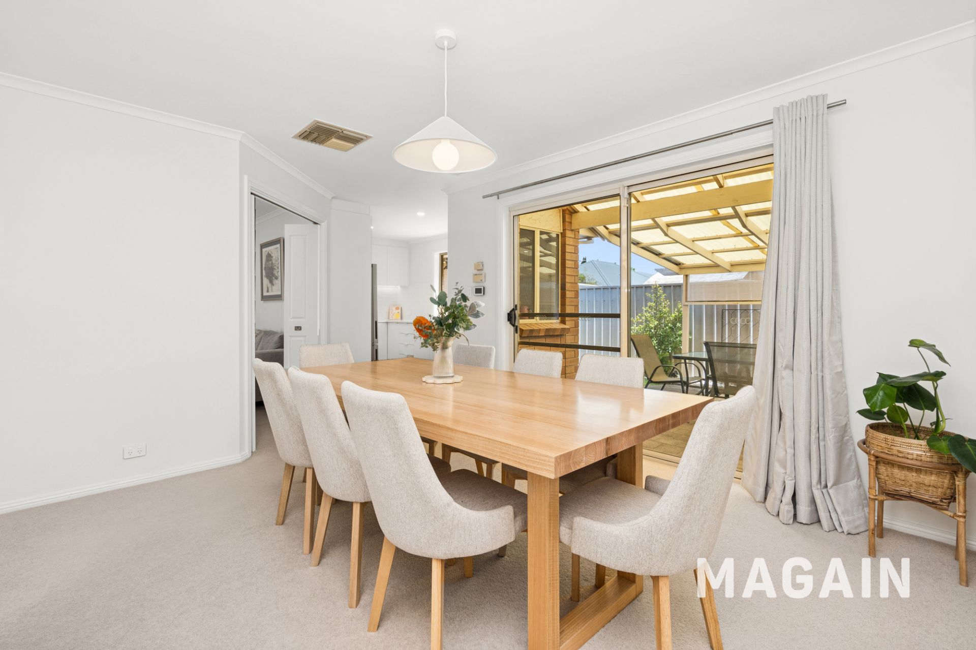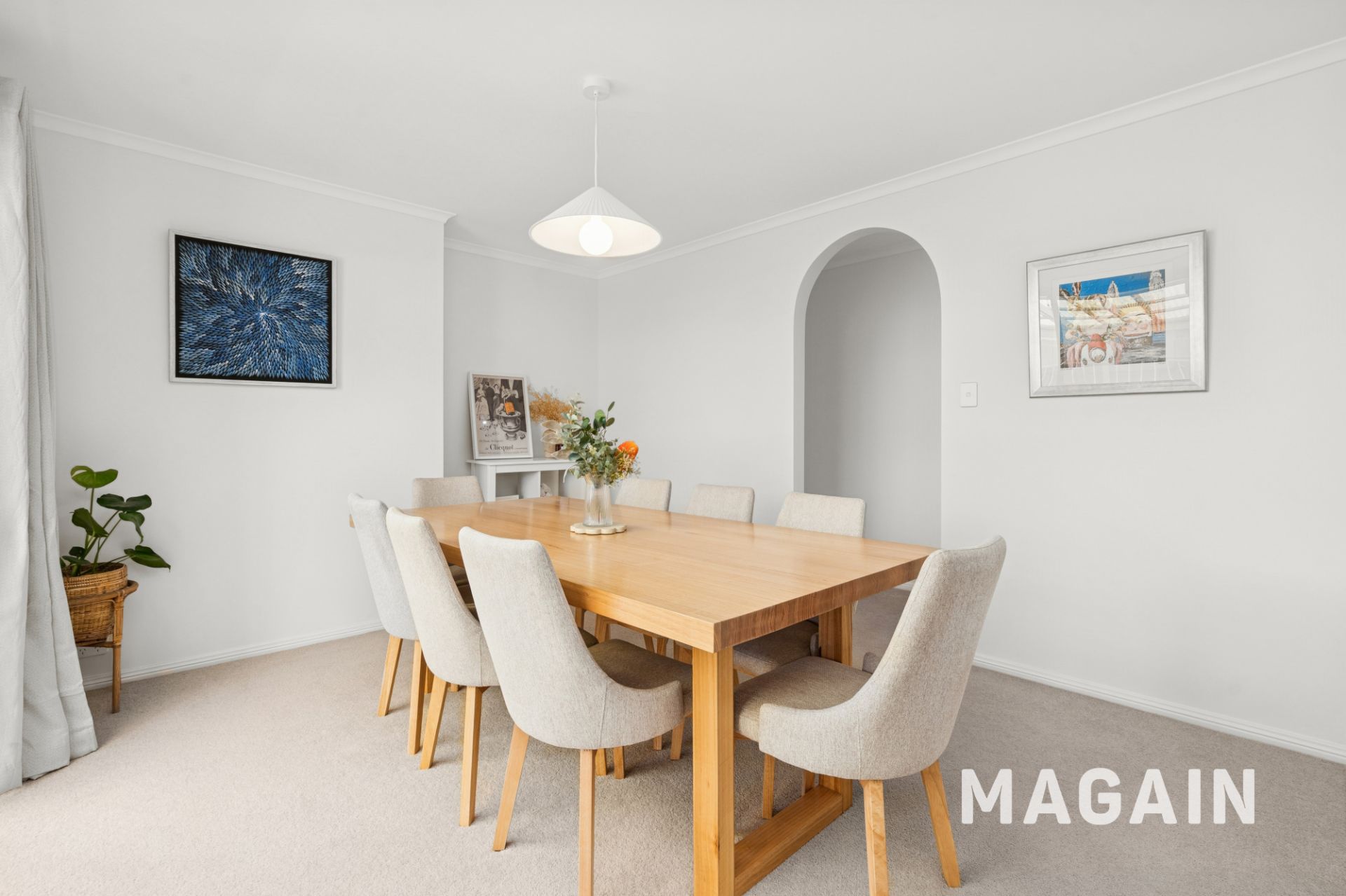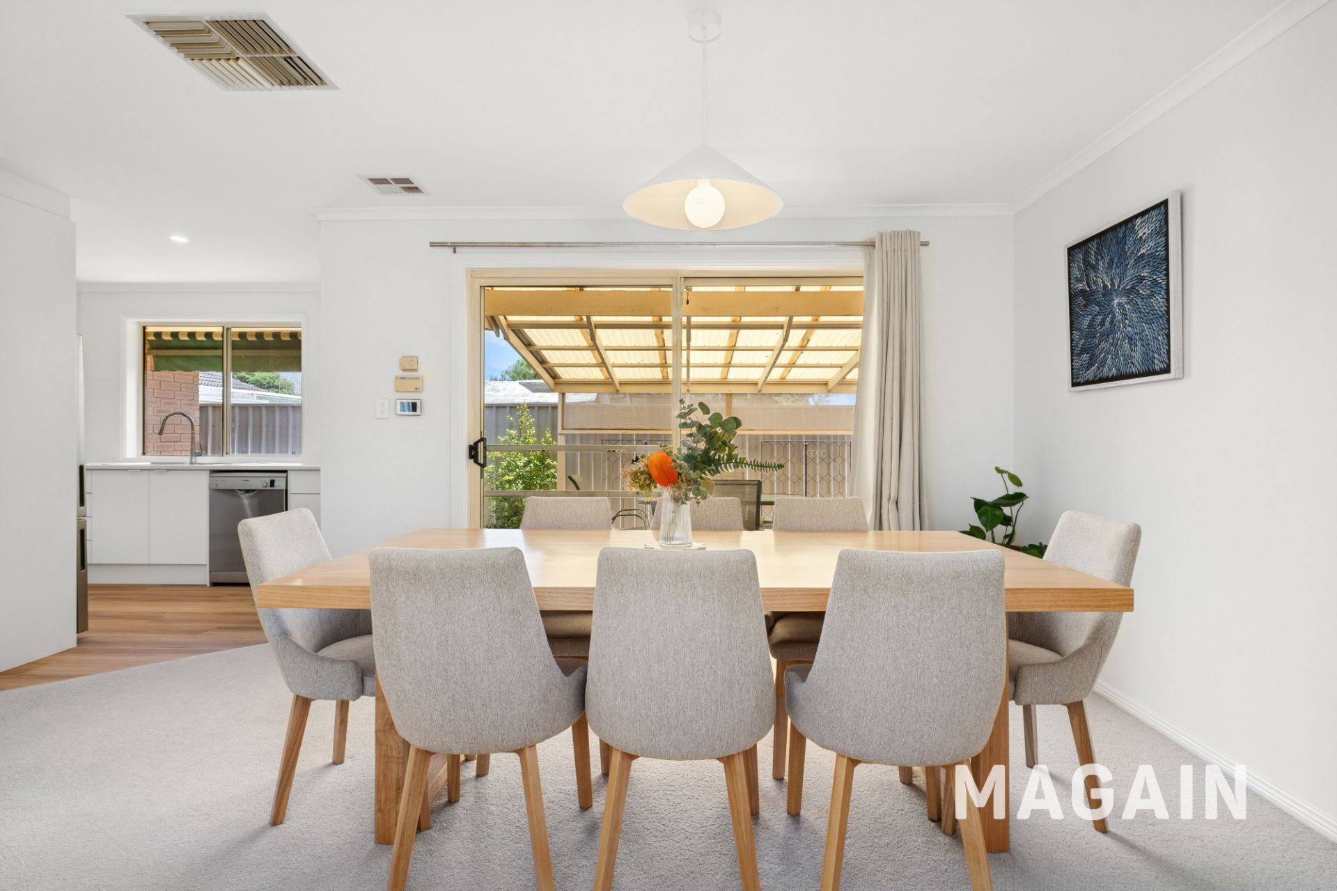 Further into the home, the dining area comfortably accommodates the entire family for shared meals. Sliding glass doors lead to the undercover pergola, creating a seamless connection between indoor and outdoor living, ideal for entertaining year-round.