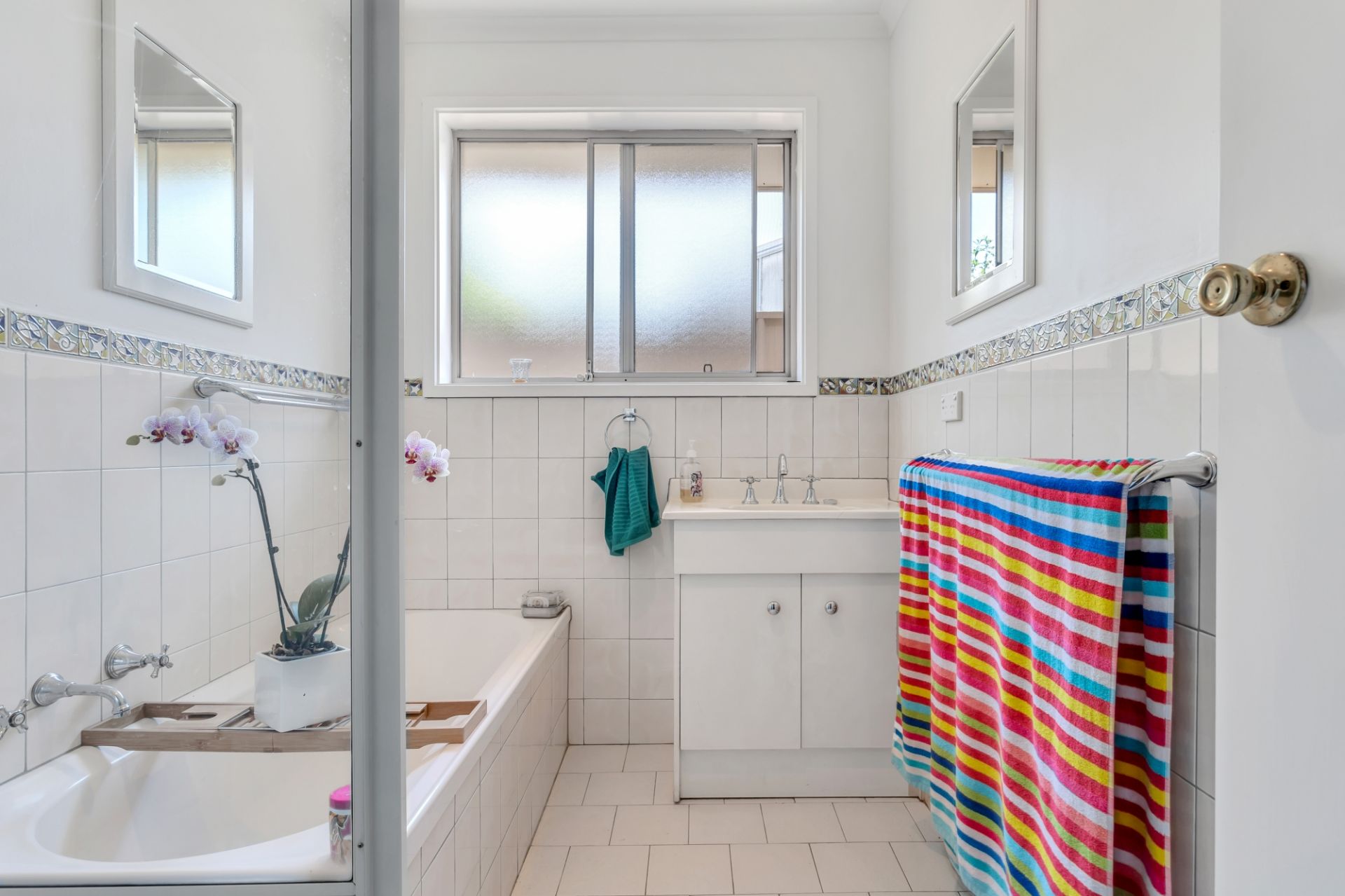> airy bathroom with separate bath tub, shower and toilet