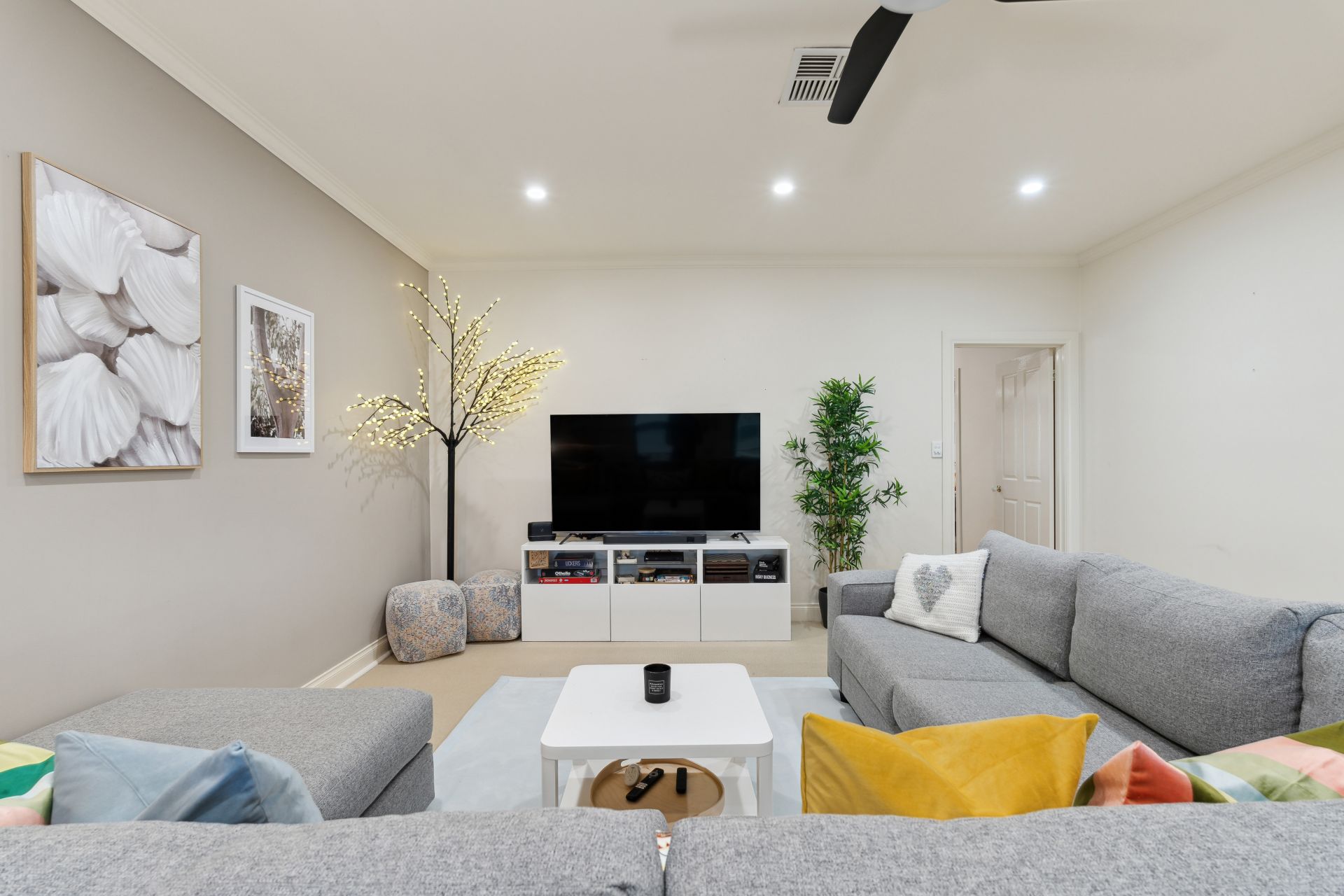 The front-facing master bedroom is a sanctuary unto itself, boasting both a built-in robe and a walk-in robe, as well as an ensuite for your convenience and privacy. Bedrooms two and three are conveniently located off the main living area and offer spaciousness, built-in robes, and easy access to the impeccably designed three-way main bathroom that is sure to impress. An adjacent linen press provides additional storage space, enhancing the functionality of this home.
