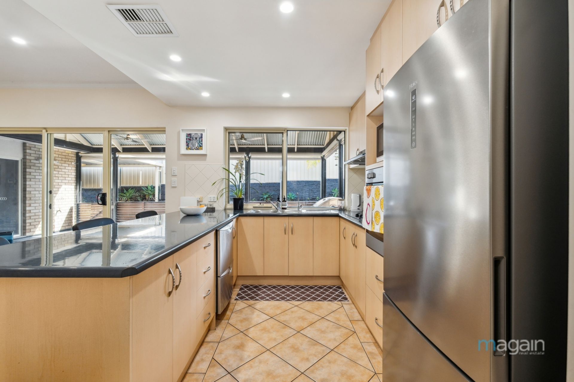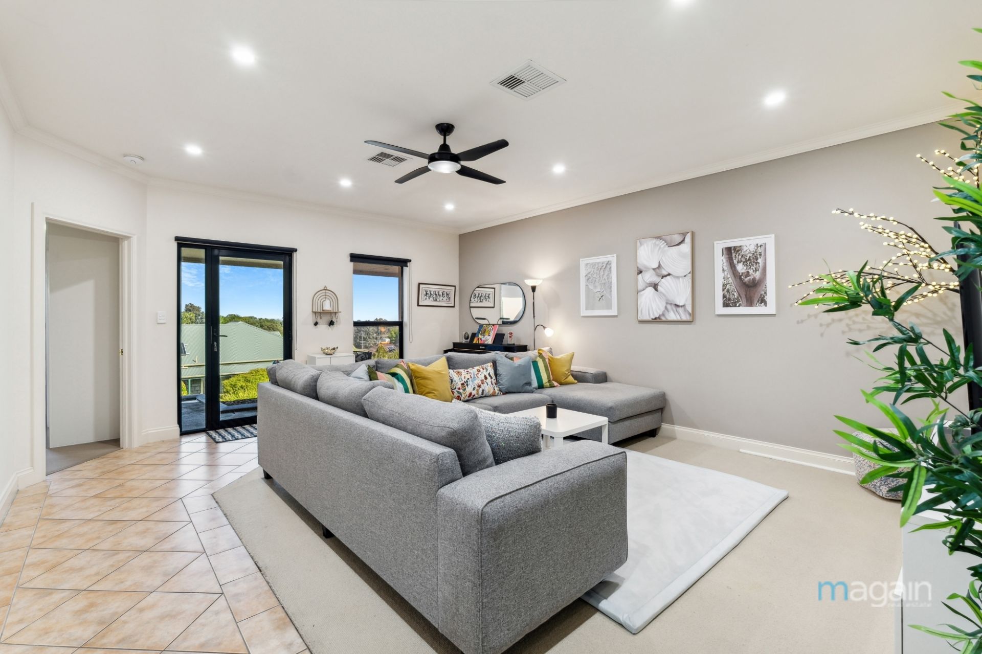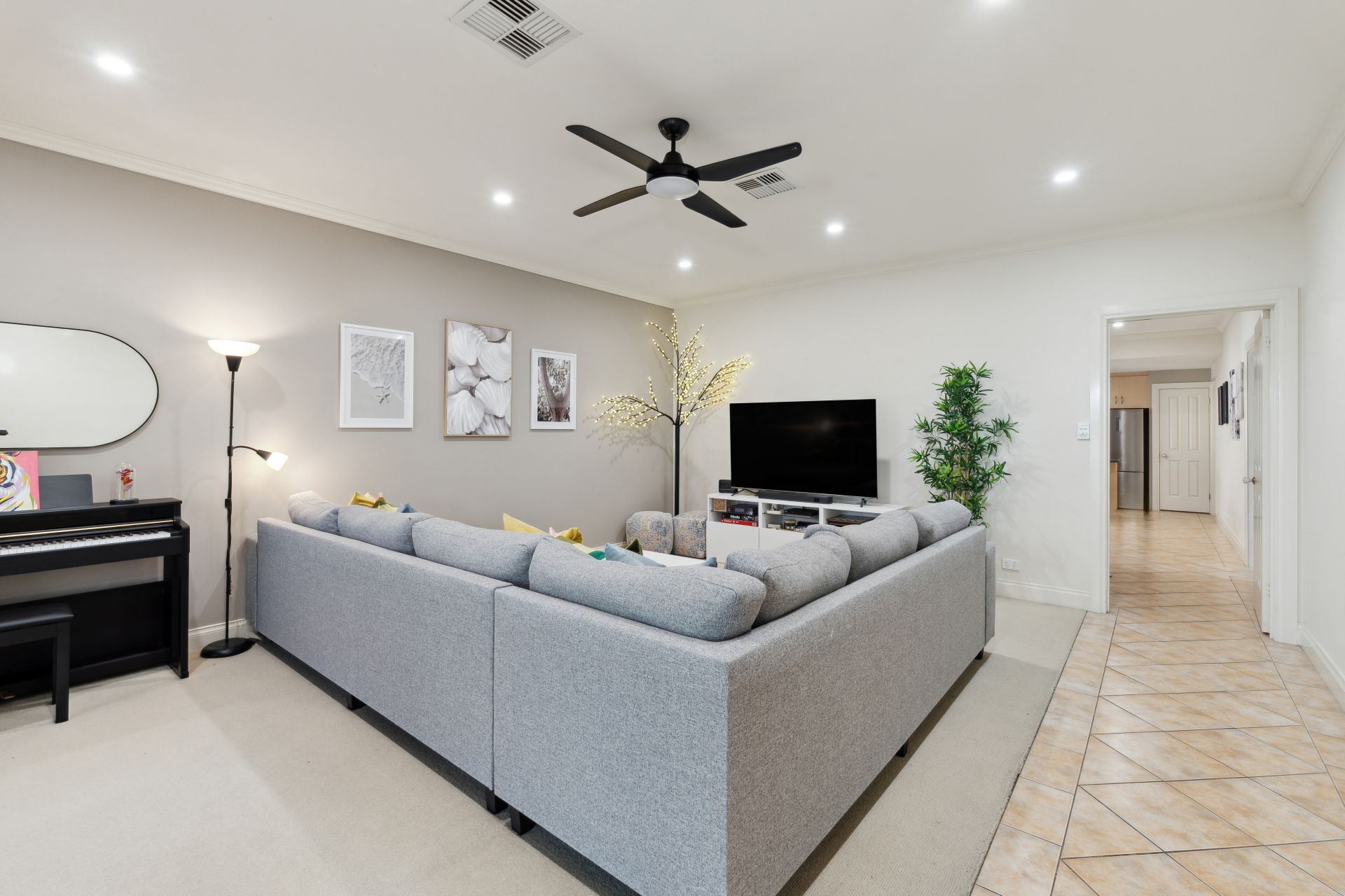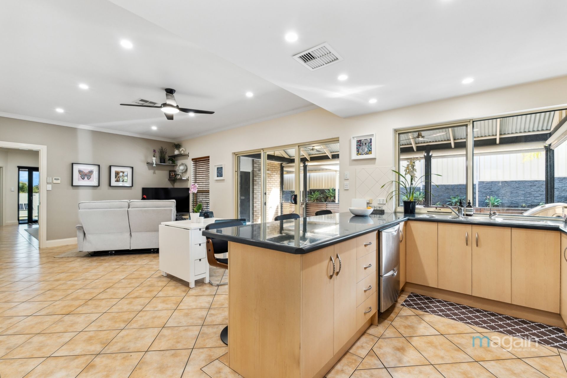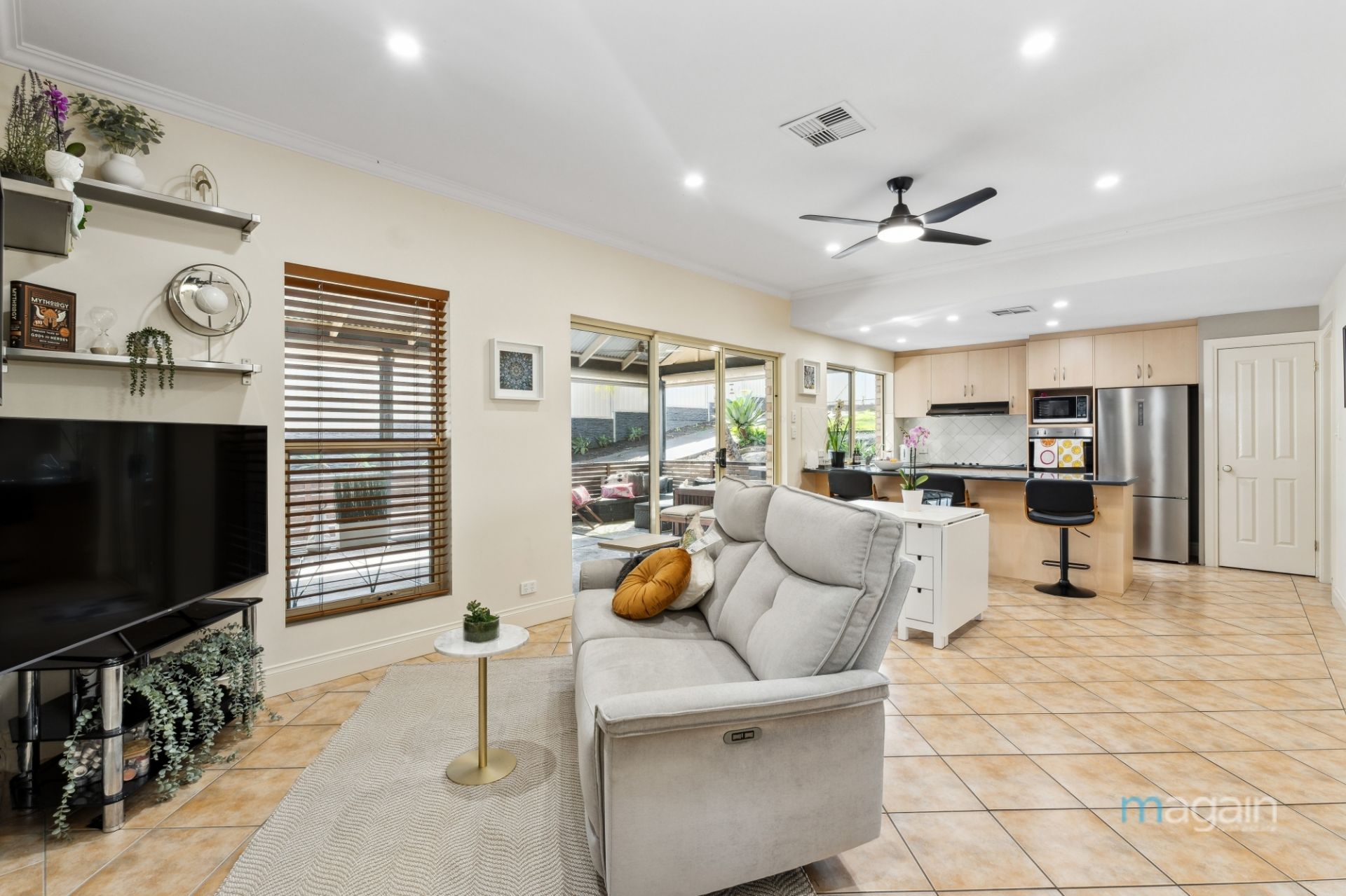 As you step through the front door, you'll be welcomed by a spacious and brilliantly illuminated lounge room adorned with exquisite tiled floors. Moving forward, you'll discover a beautifully designed kitchen featuring tastefully neutral-toned cabinetry, complete with high-quality appliances, including a two-drawer dishwasher and built-in oven. The kitchen effortlessly overlooks a versatile meals area and a second living space, providing the perfect setting for culinary creations and family gatherings. With ducted reverse cycle heating and cooling, this home ensures comfort and cosiness throughout the ever-changing seasons.
