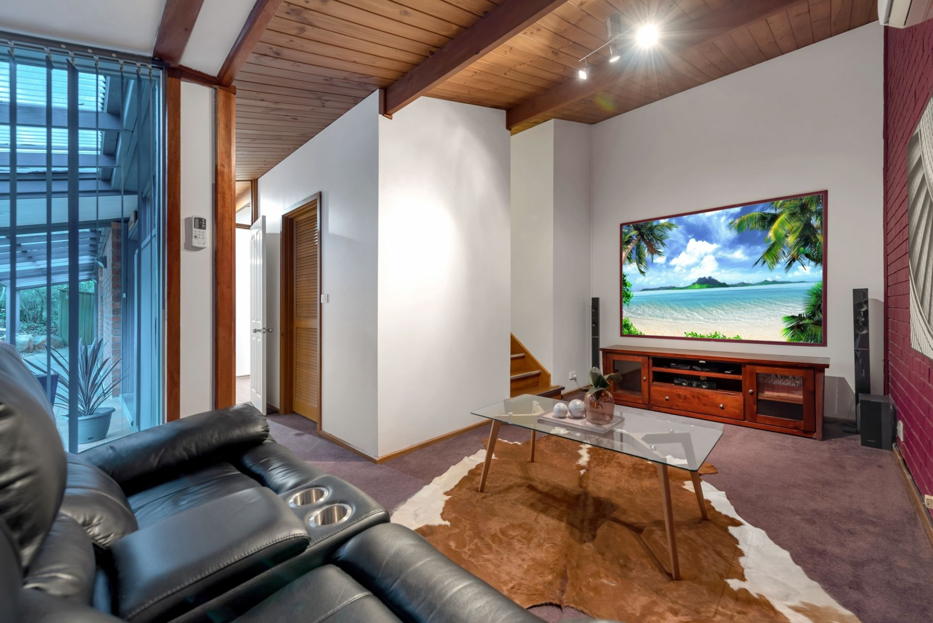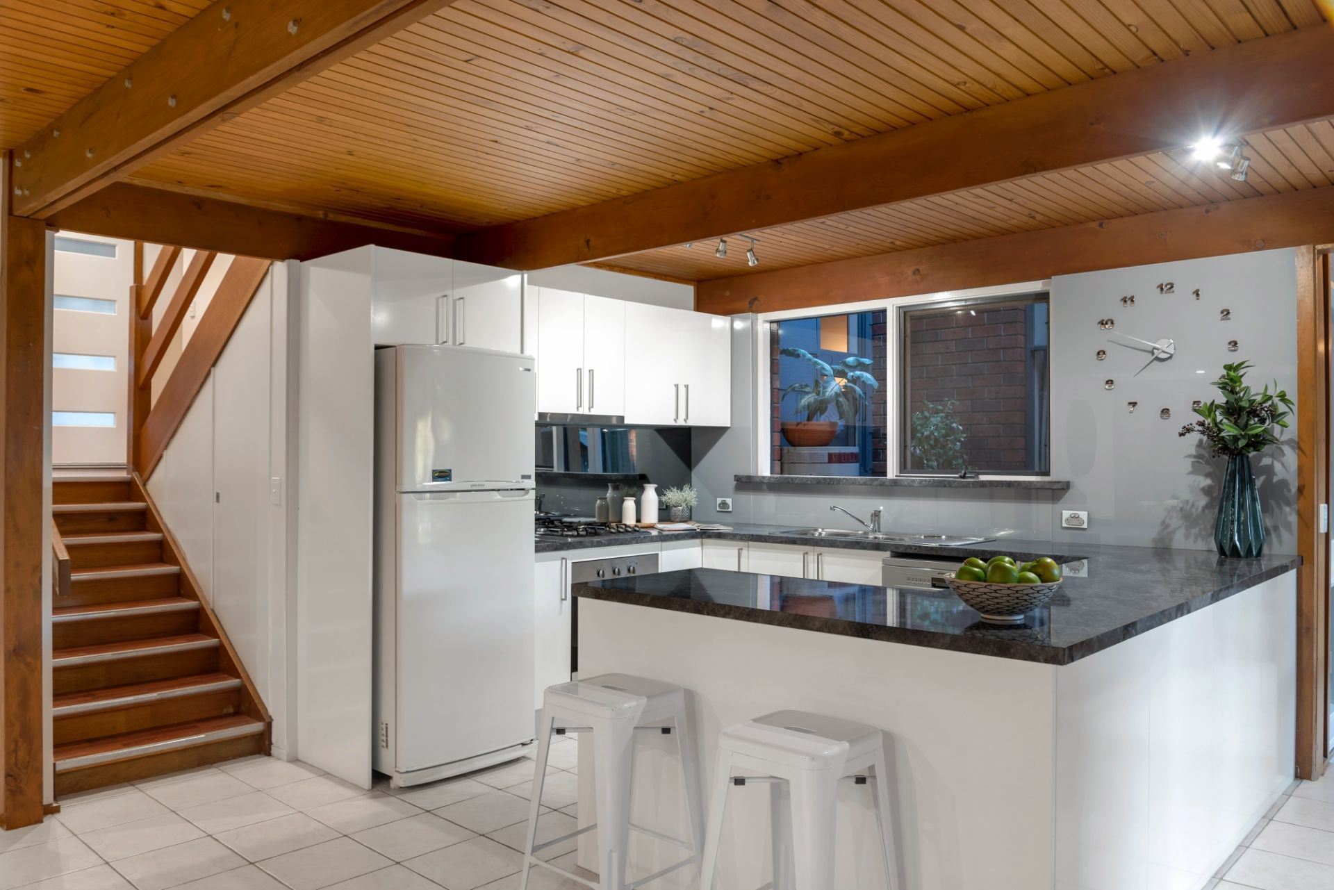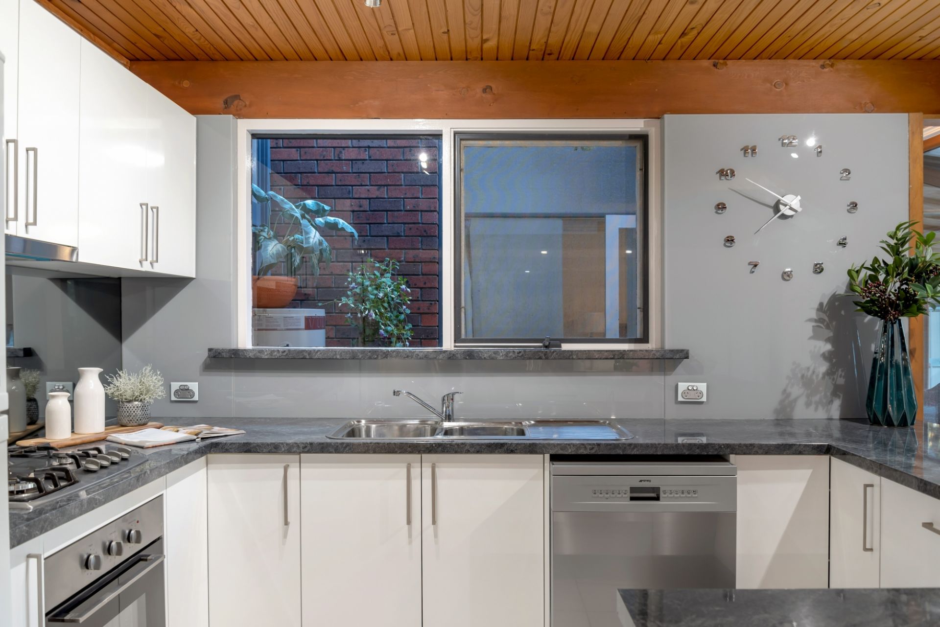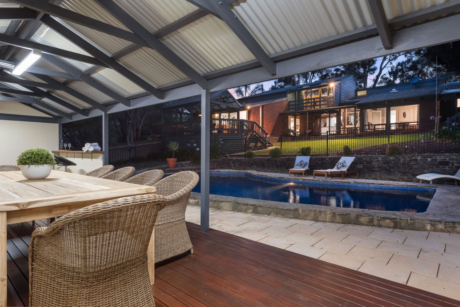 By far the stand out of the home is the lower level; boasting a modern open kitchen complete with stainless steel cooking appliances and a near-new Smeg dishwasher. The living space gives you a coastal vibe with its exposed beams, huge double-glazed windows and has plenty of space for the large family. The lounge leads out through a double-glazed sliding door to a timber decked area where you can overlook the beautiful yard and fully tiled swimming pool.