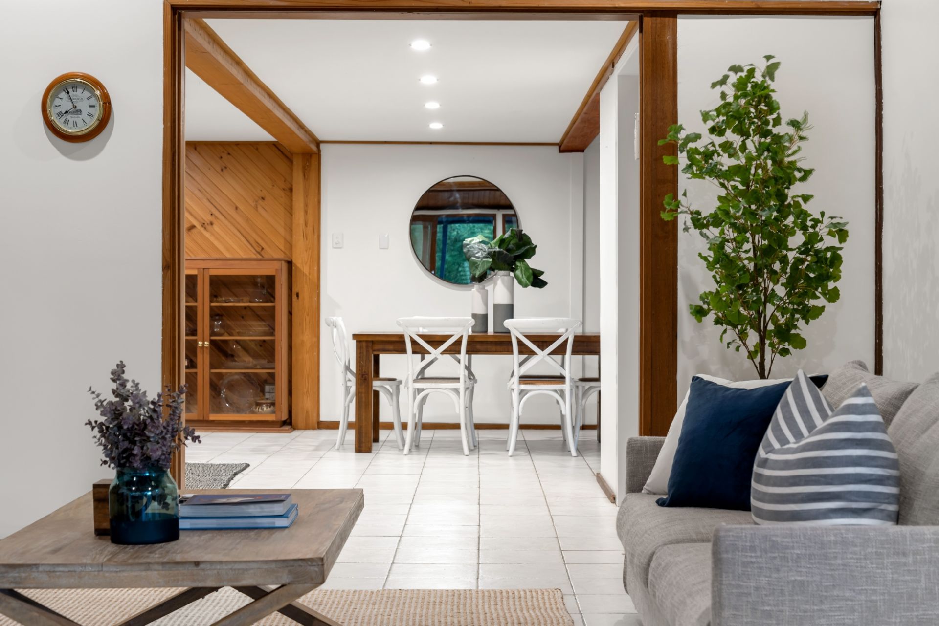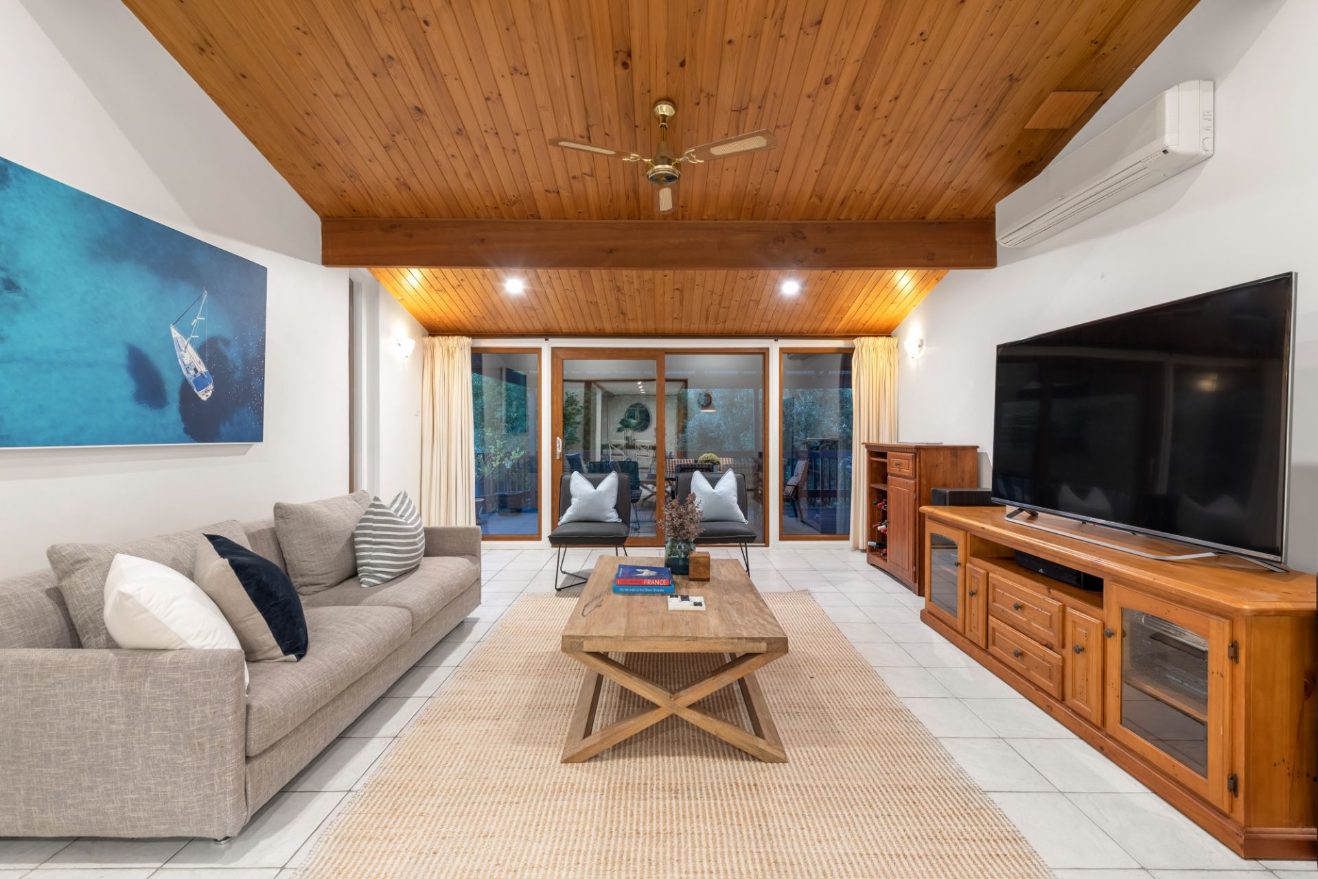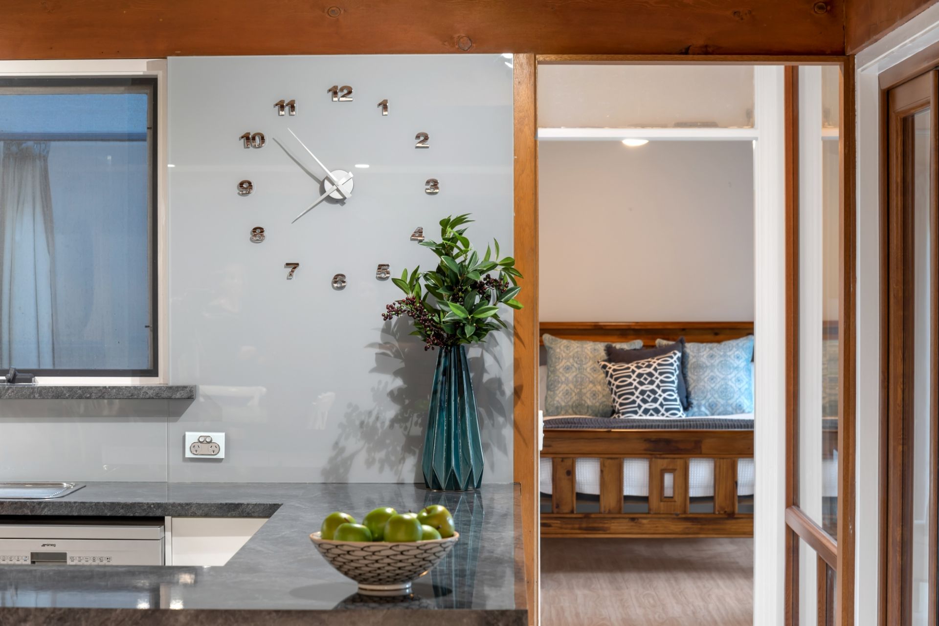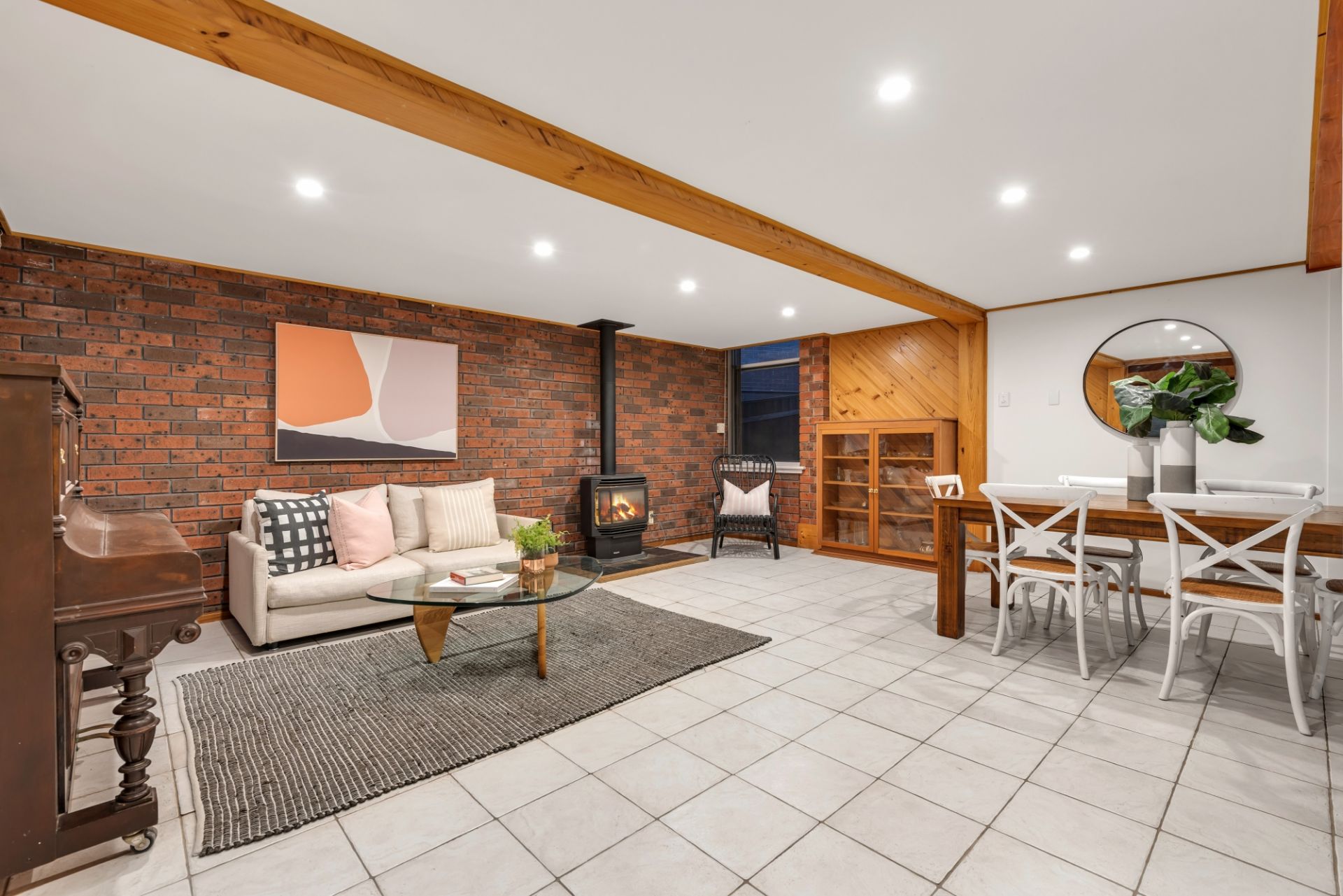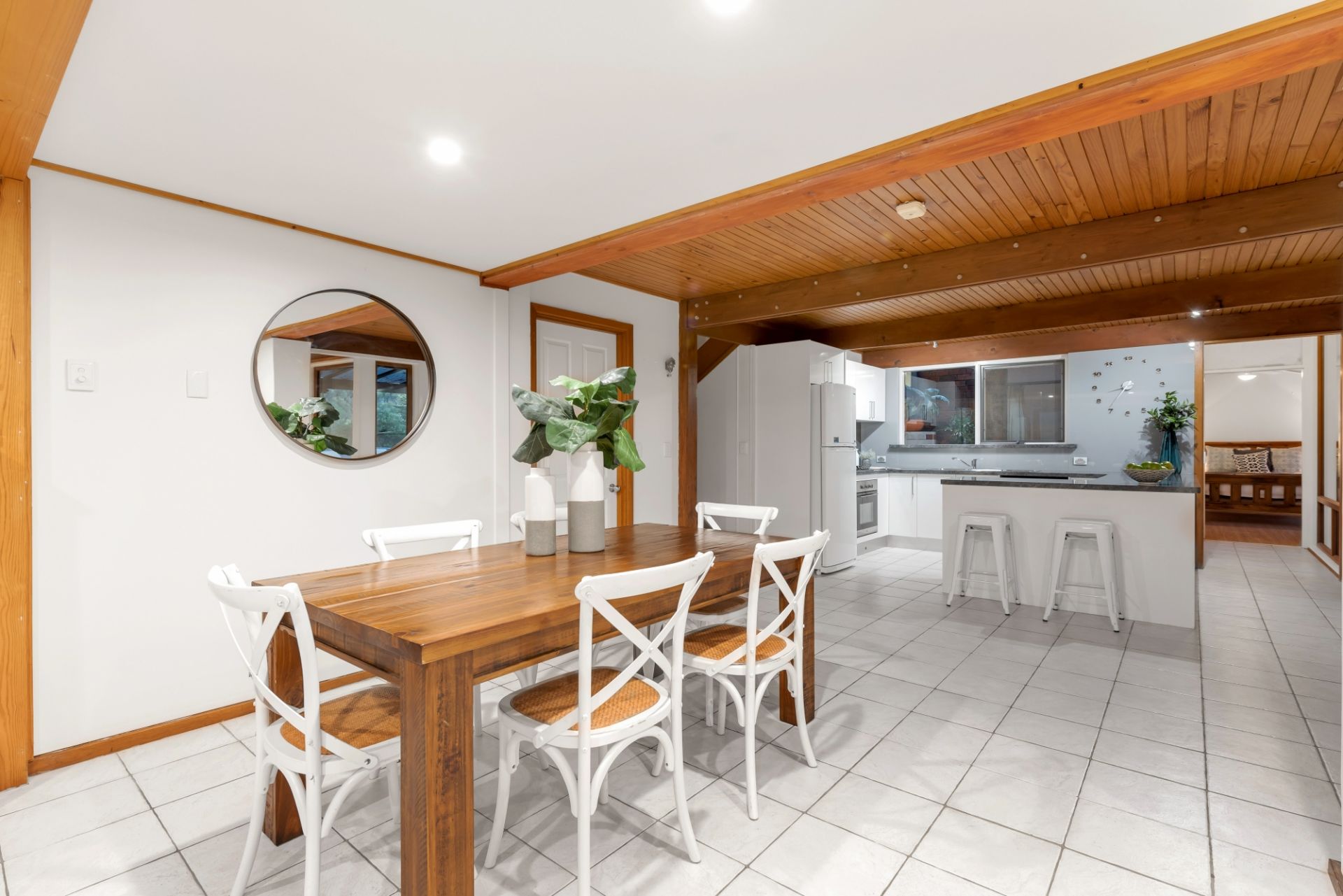 By far the stand out of the home is the lower level; boasting a modern open kitchen complete with stainless steel cooking appliances and a near-new Smeg dishwasher. The living space gives you a coastal vibe with its exposed beams, huge double-glazed windows and has plenty of space for the large family. The lounge leads out through a double-glazed sliding door to a timber decked area where you can overlook the beautiful yard and fully tiled swimming pool.