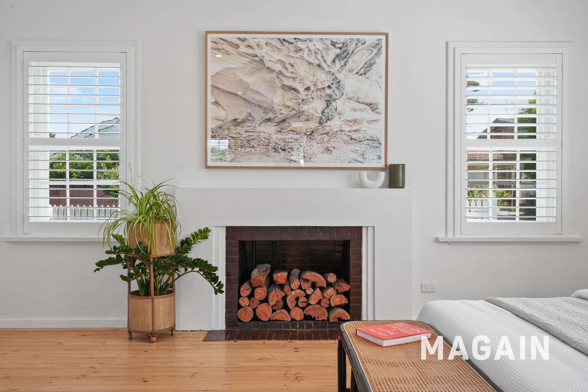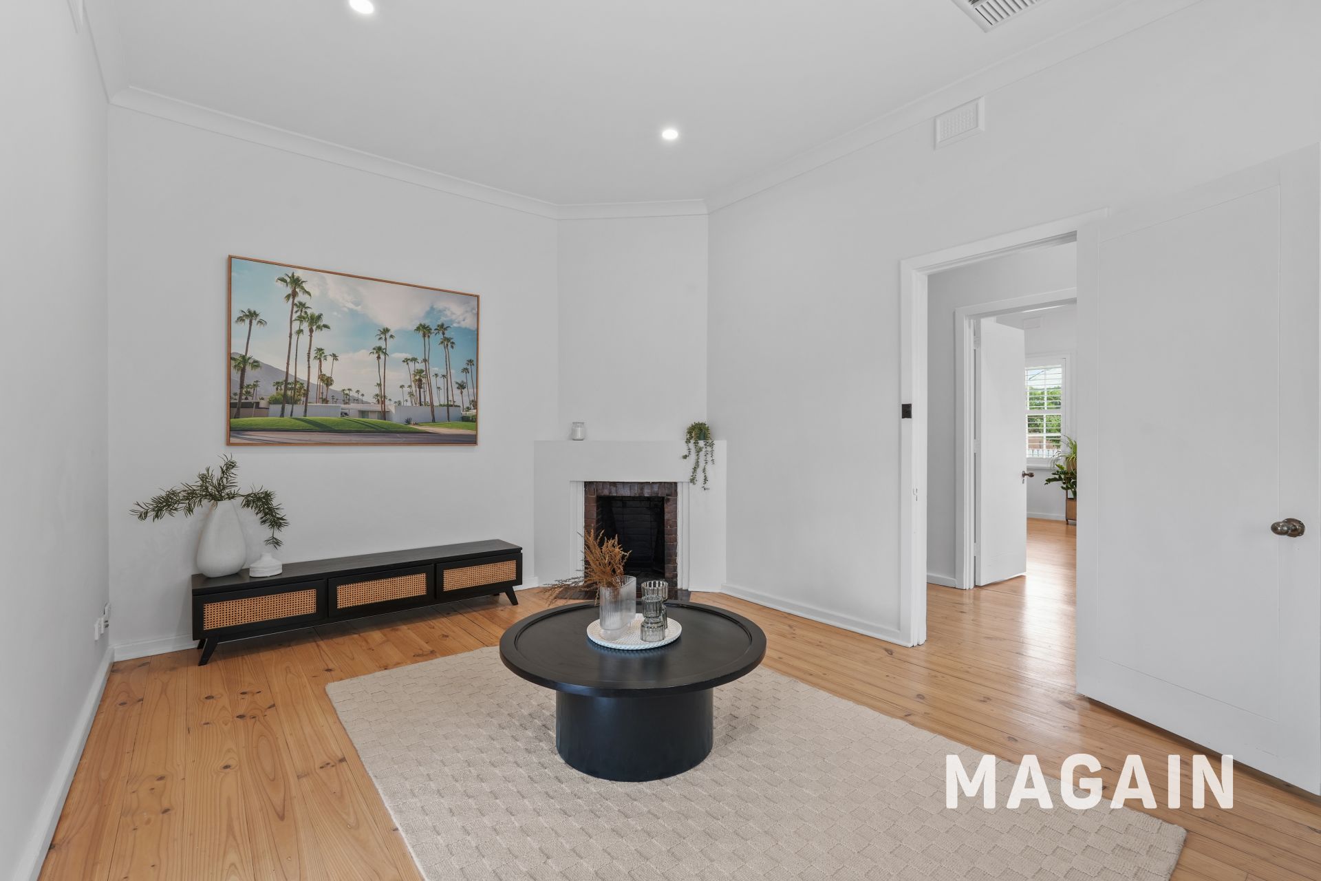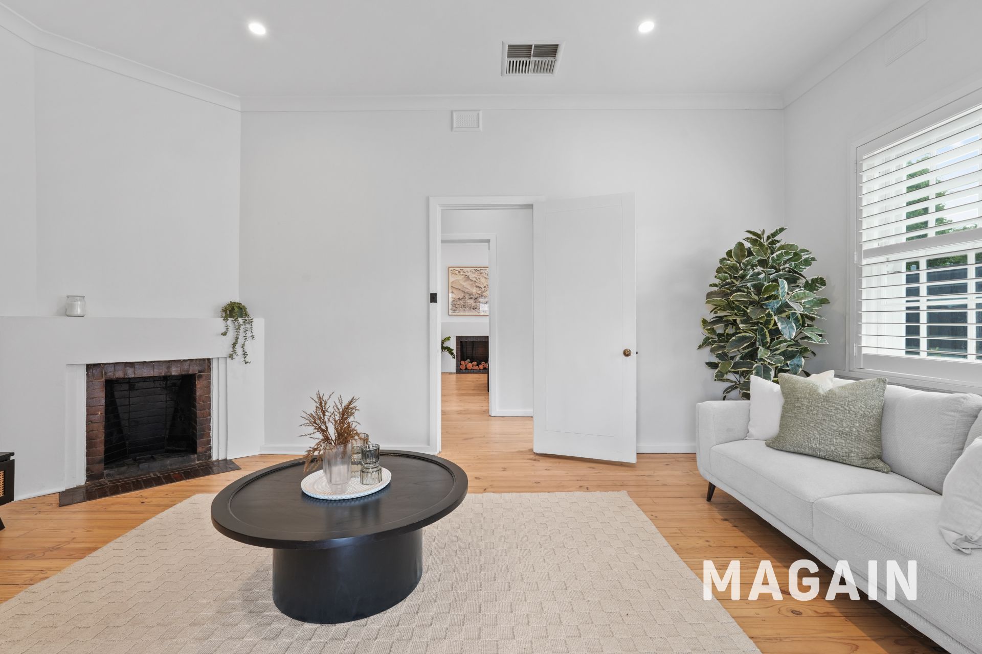 Inside, a wide hallway introduces beautiful proportions, separating the master bedroom and the spacious living room-each with its own open fireplace. For year-round comfort, ducted reverse-cycle air conditioning keeps the home warm in winter and cool in summer.