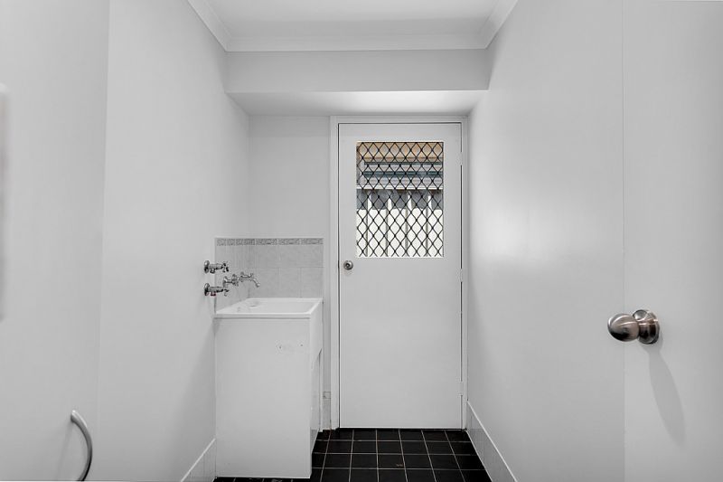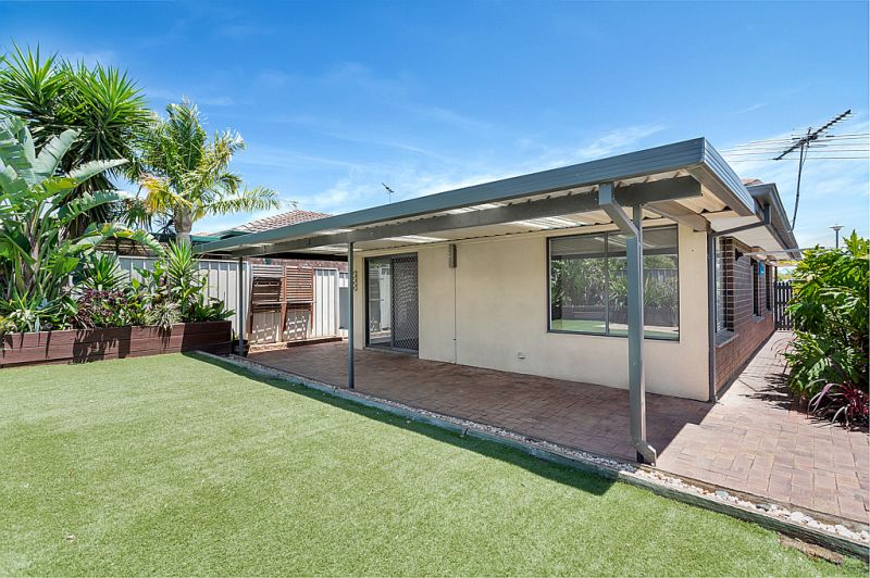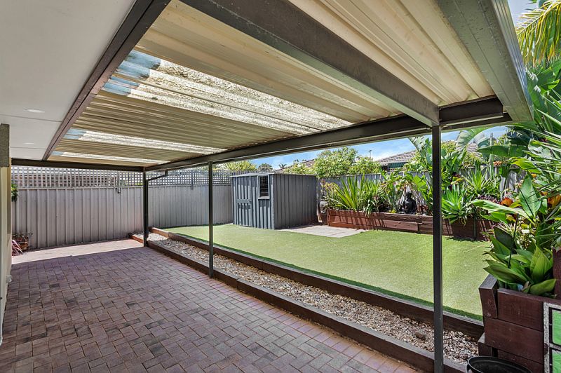 > outside is a great place to relax under the verandah and entertain in the low maintenance yard with lawn and storage shed