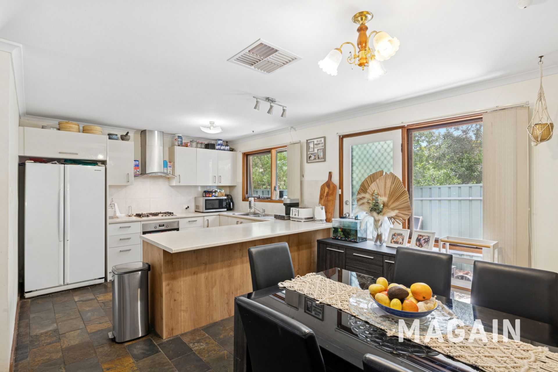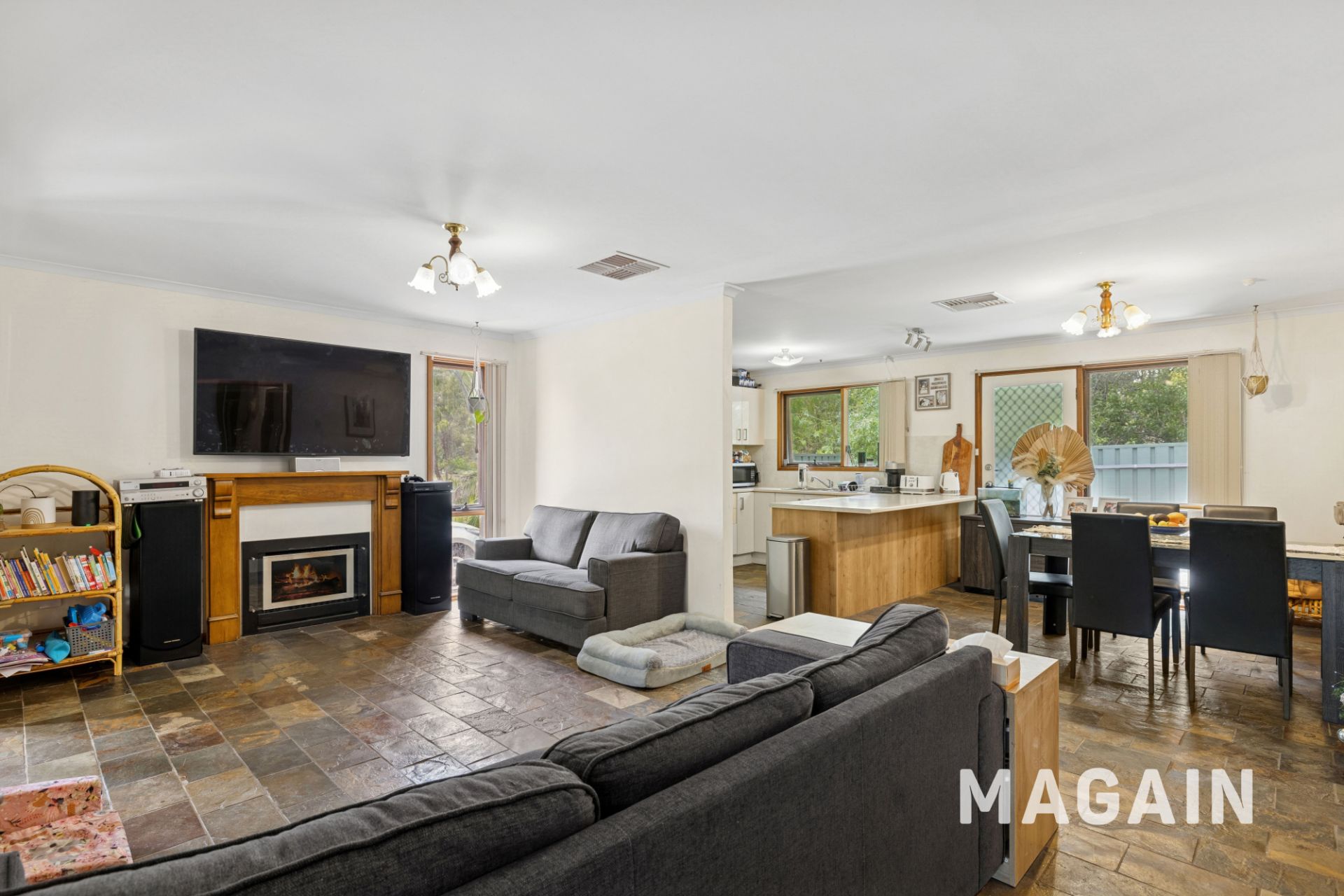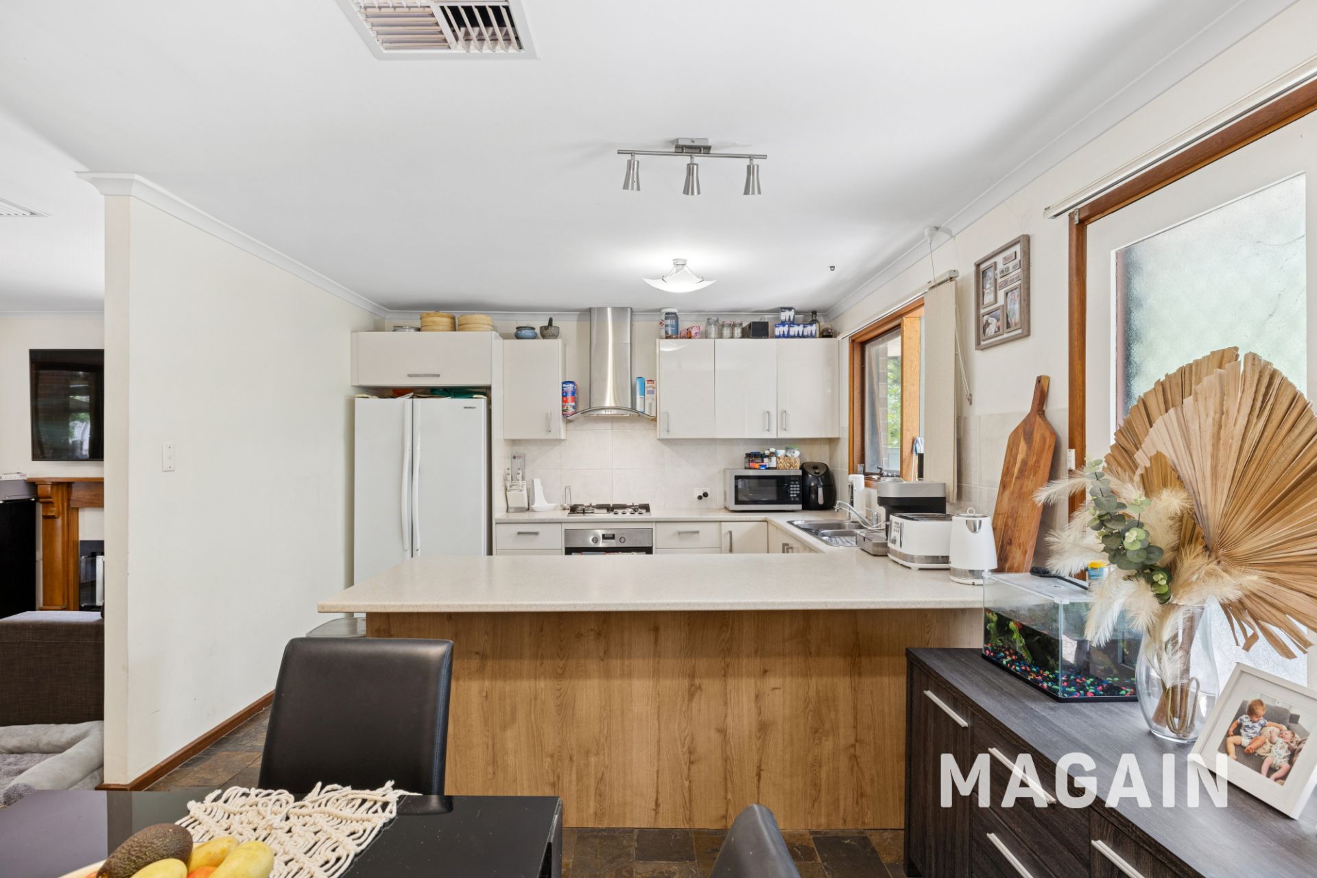 Inside, the home welcomes you into a light and open plan kitchen, lounge and dining space that feels instantly warm and inviting. The kitchen is modern with excellent storage, a freestanding gas cooktop and oven, breakfast bar and generous bench space, all overlooking the meals and living area to keep everyone connected. A cosy gas combustion fire brings winter comfort to the lounge, while ducted evaporative cooling throughout keeps the home cool in summer.