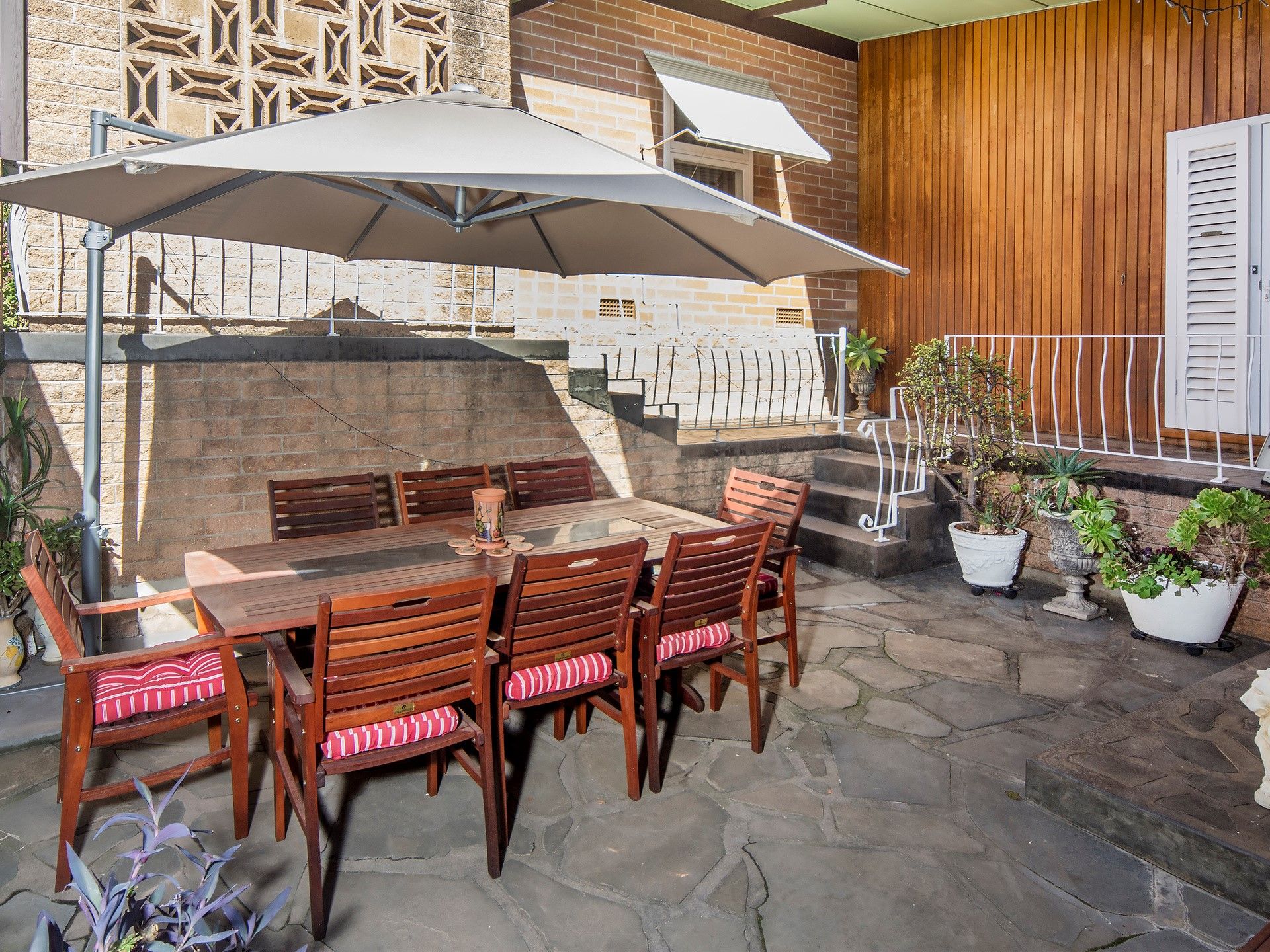 The fabulous kitchen renovated a few years ago, boasts Bosch appliances including a dishwasher and adjoins a casual meals area. From here you step out to a small balcony from where you can view the large private landscaped yet easy care gardens.