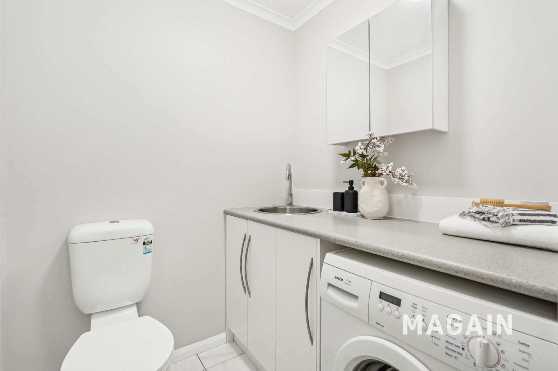 Behind the mirror wall cabinets in the bathroom and laundry
